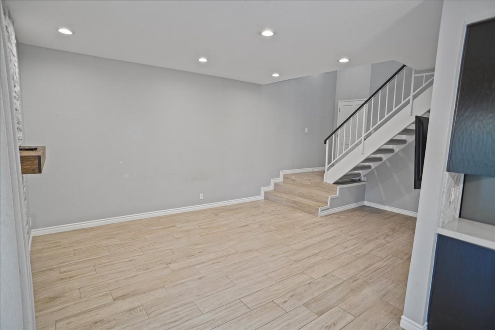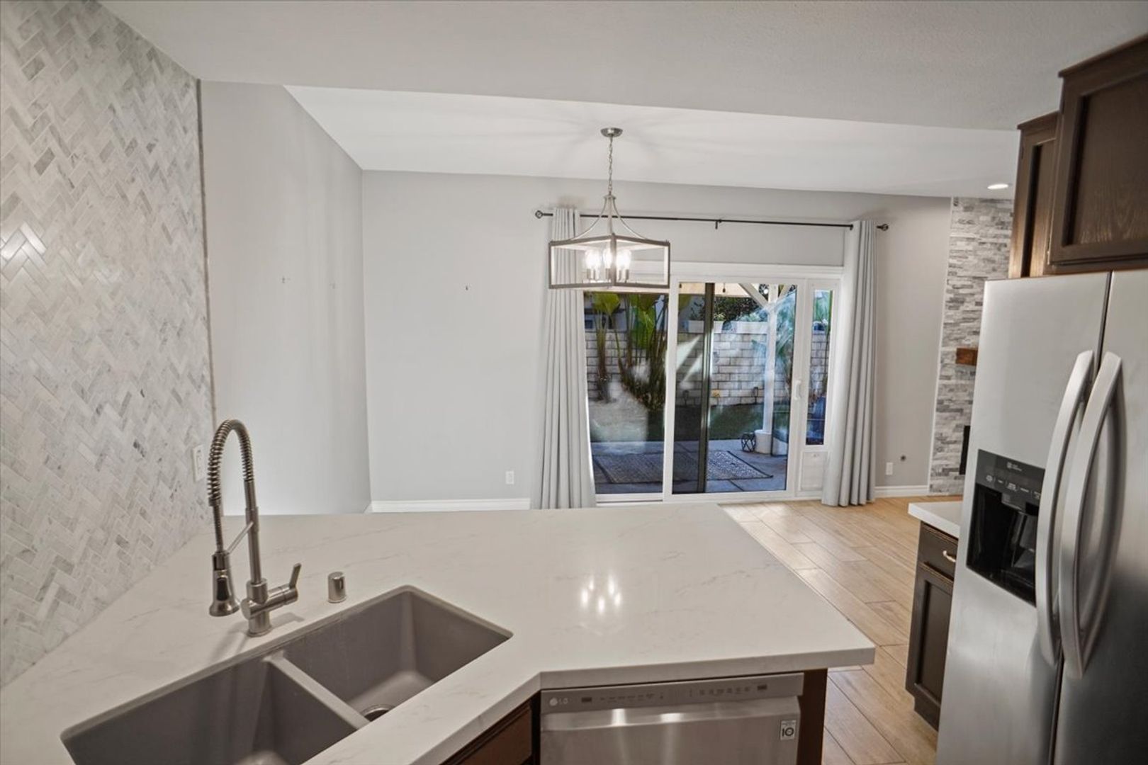 The entry features a park area and beautiful tile flooring that resembles wood, continuing throughout the downstairs. The spacious living room boasts high ceilings, recessed lighting, and a gorgeous upgraded fireplace with a stone mantel extending to the ceiling—a true focal point of the home. The separate dining area features an upgraded light fixture and flows seamlessly into the modern kitchen, which offers custom cabinetry, upgraded countertops with tile backsplash, stainless steel appliances (dishwasher, stove, microwave, refrigerator, and sink), a breakfast bar, and an upgraded faucet.