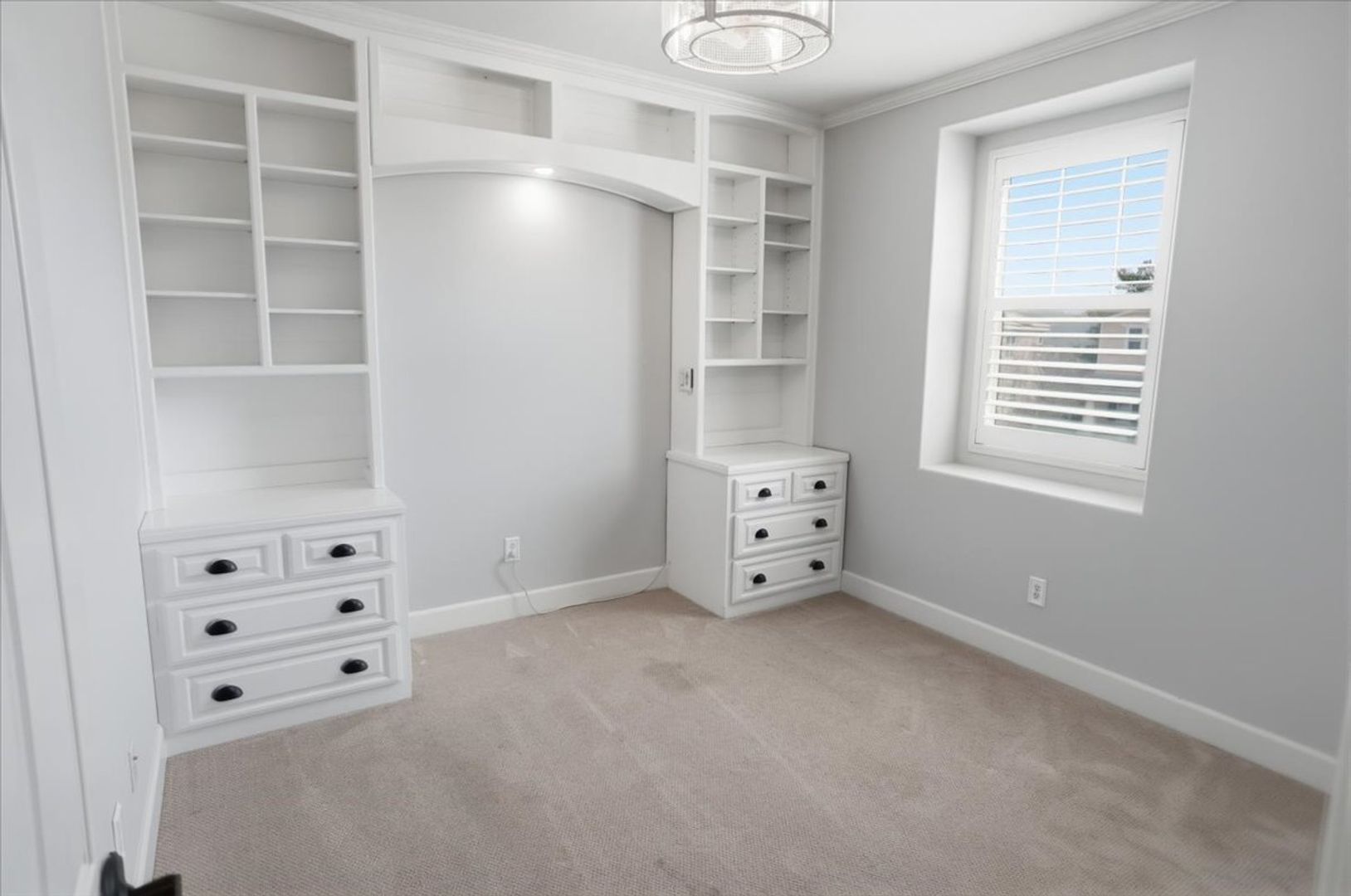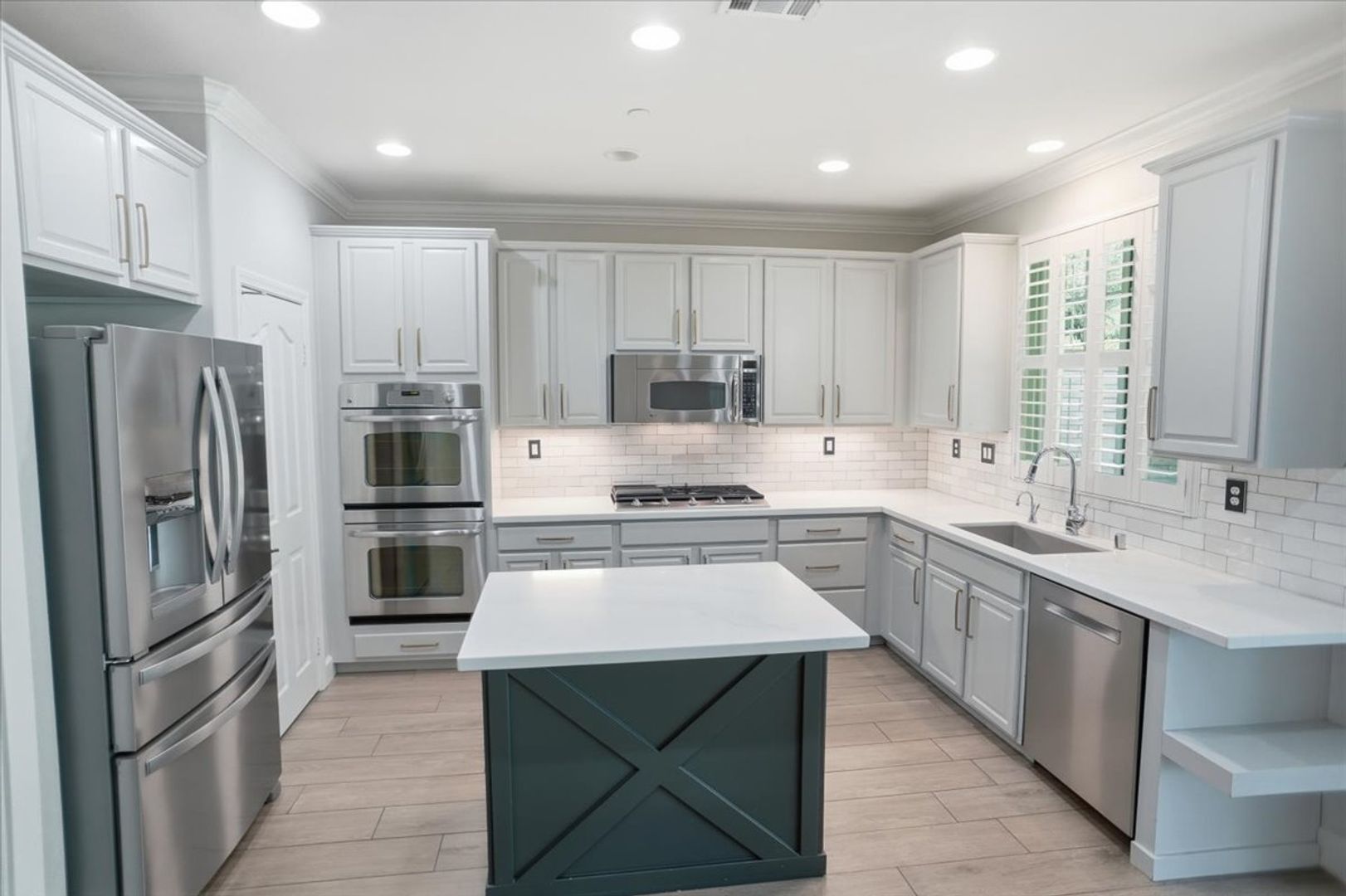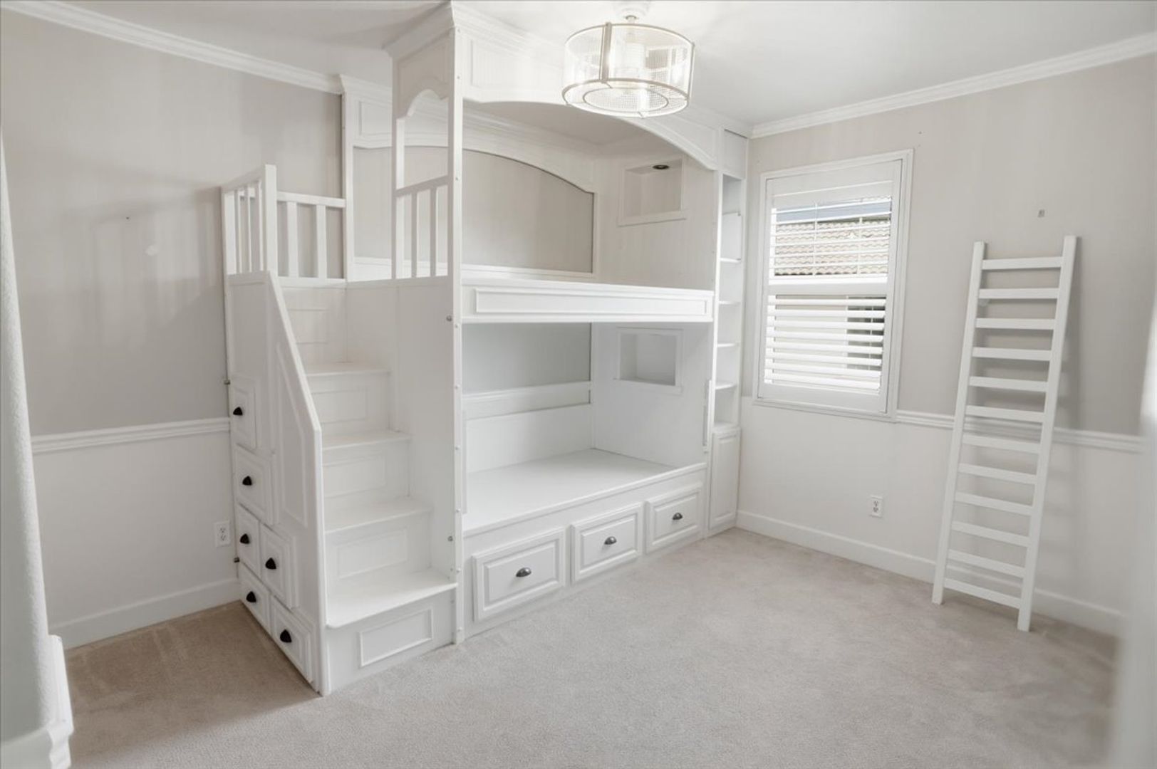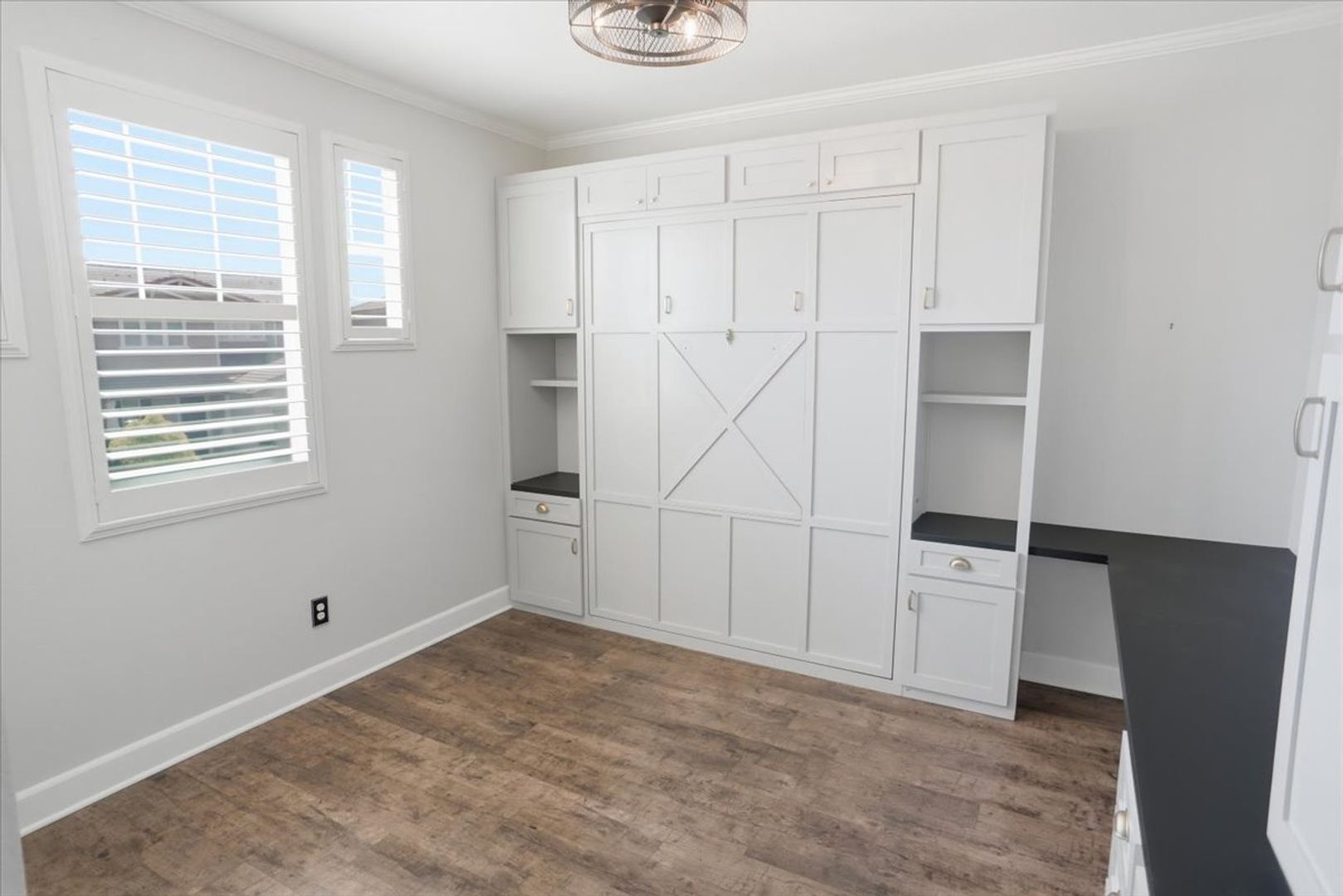 Upstairs, enjoy a spacious loft with recessed lighting and wood shutters—ideal for a second living area, office, or playroom. All four bedrooms are generously sized and include custom features such as built-ins, a Murphy bed with desk, and a bunk bed setup.