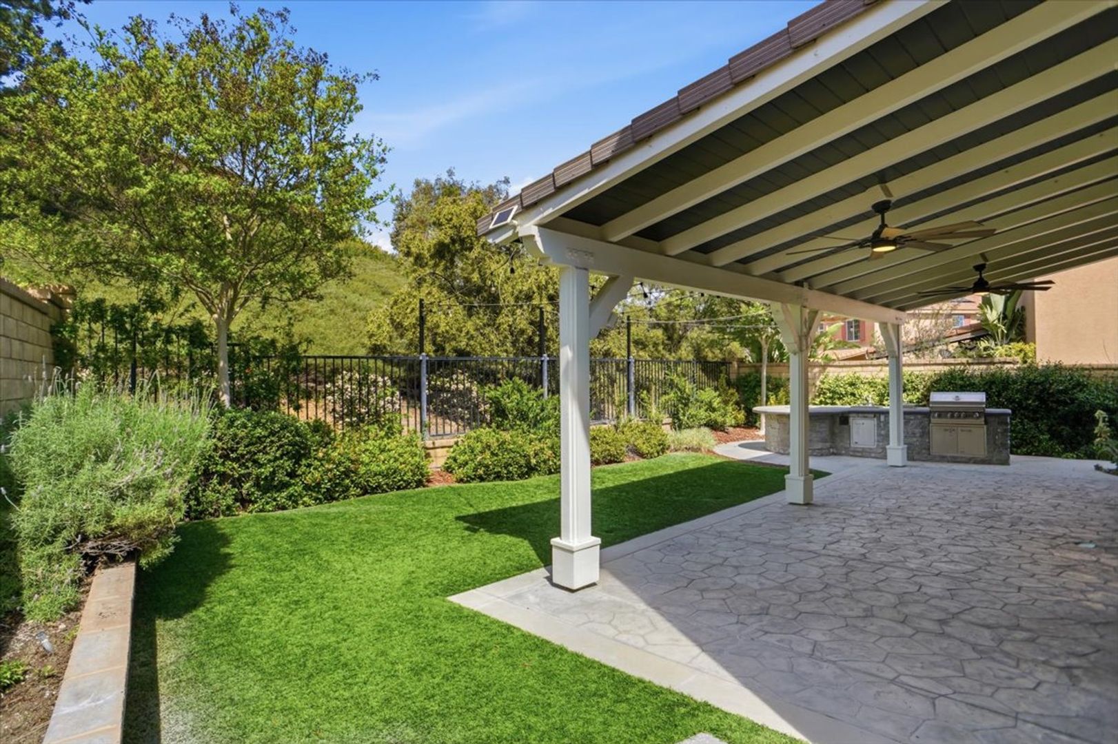 Step outside to your private entertainer’s backyard featuring turf landscaping, a covered patio, firepit, seating areas, and a fully equipped outdoor kitchen with built-in BBQ—perfect for hosting and relaxing. The backyard also offers added privacy with a hillside backdrop.
