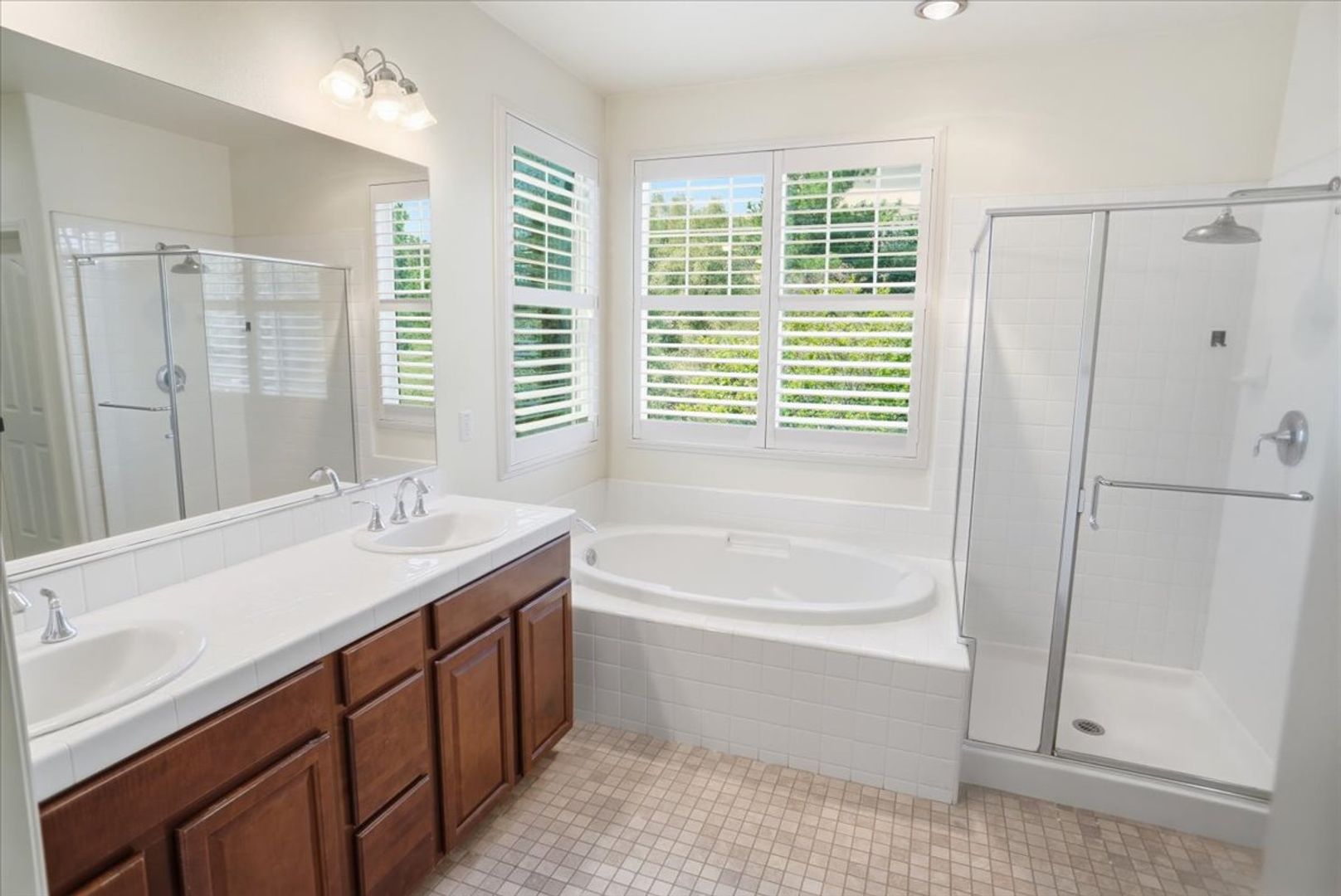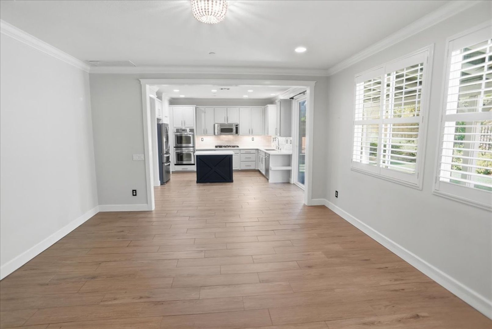 Inside, the home offers a spacious living room with elegant wood flooring, recessed lighting, custom paint, crown molding, and wood shutters. A separate dining area showcases wainscoting and an upgraded light fixture, creating the perfect space for entertaining.
