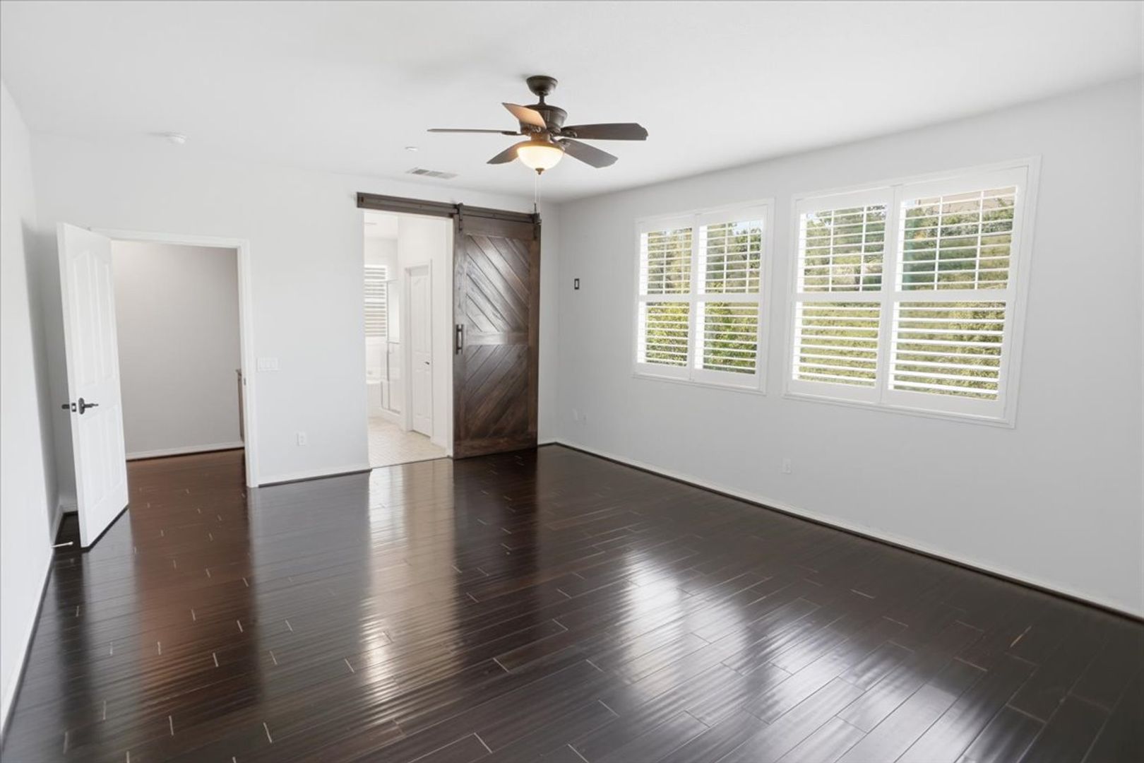 The primary suite offers wood flooring, a ceiling fan, and a sliding barn door leading to a beautifully upgraded ensuite bathroom with dual sinks, separate tub and shower, tile flooring, and a large walk-in closet with custom shelving.