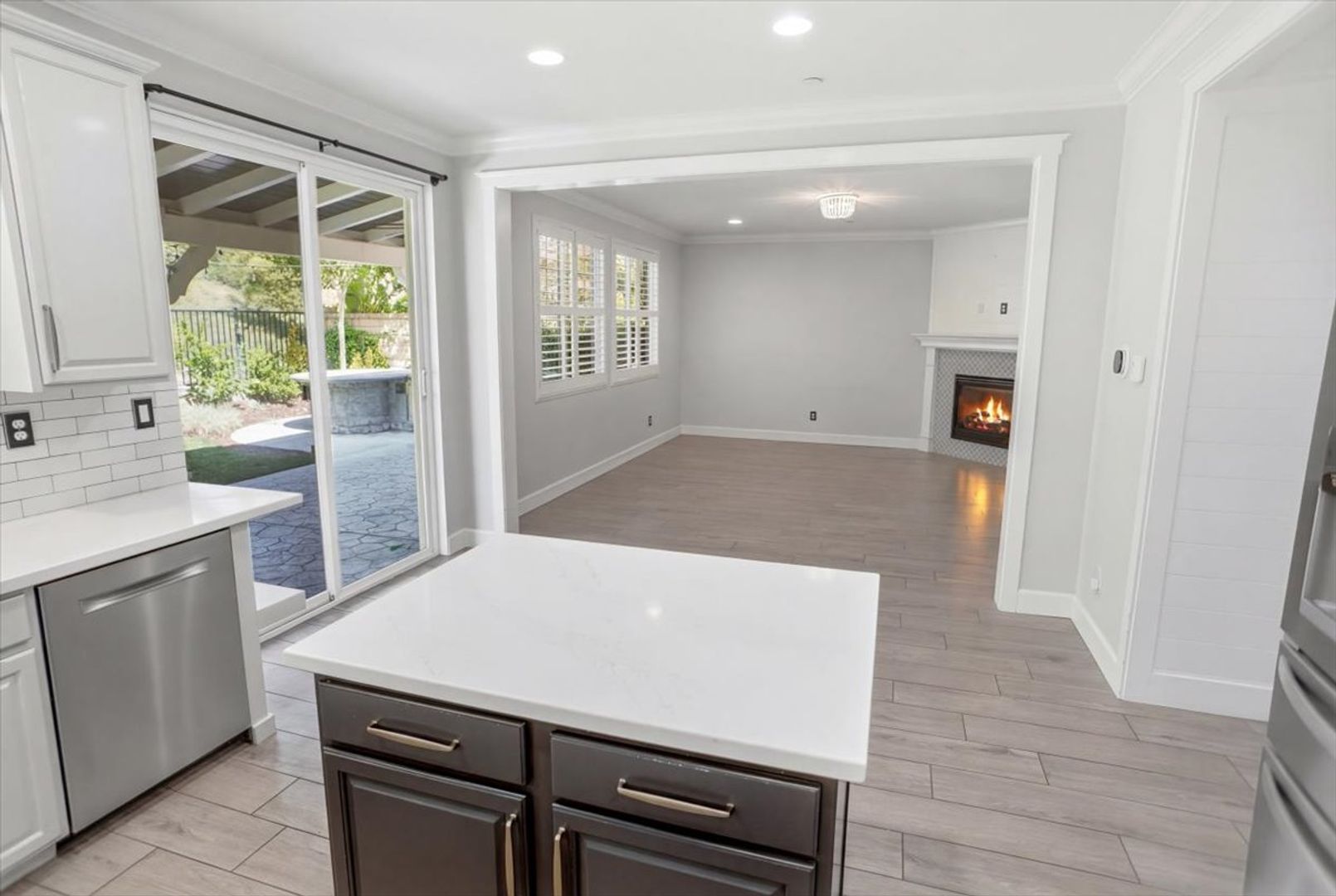 The chef’s kitchen is fully upgraded with custom cabinetry, ample storage, a large center island, upgraded countertops, subway tile backsplash, and a window overlooking the backyard. Stainless steel appliances include a double oven, range top, microwave, dishwasher, and refrigerator. The kitchen opens to a warm and inviting family room with a stylish tile fireplace, mantel, and recessed lighting.