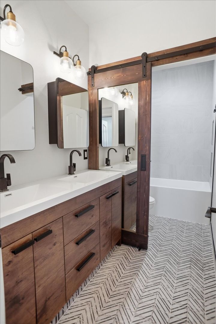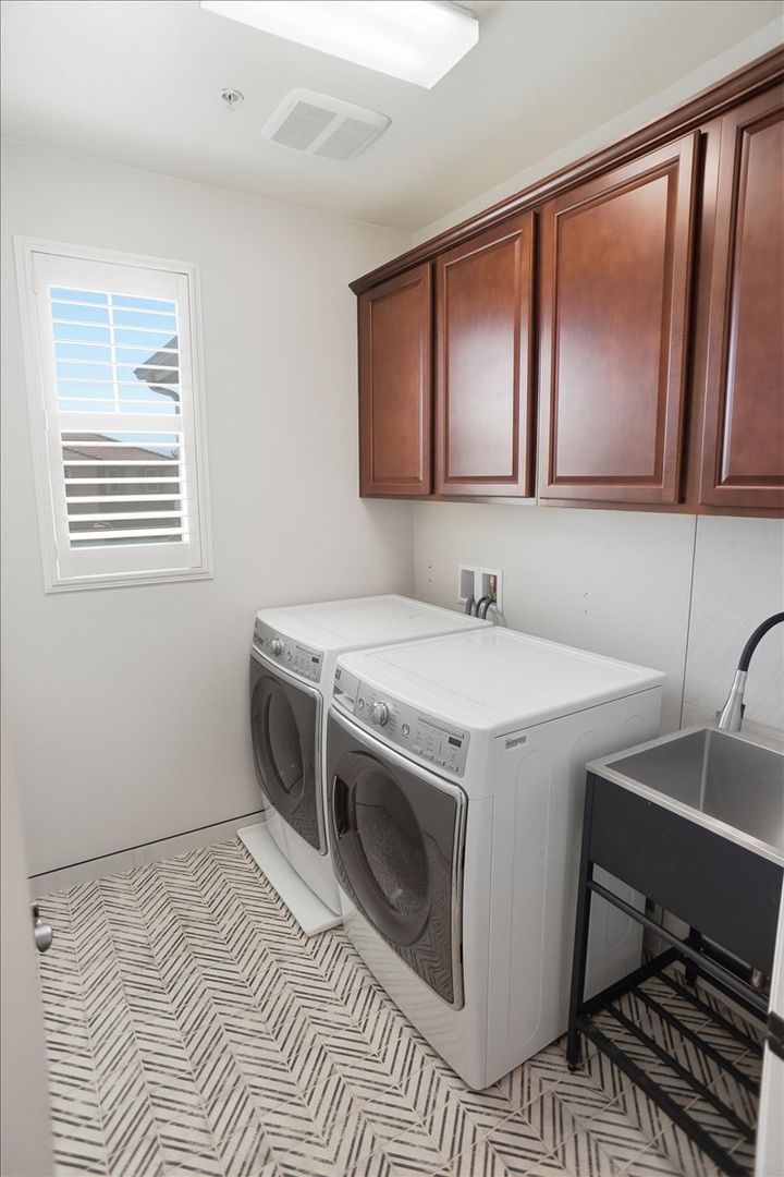 Additional highlights include an upgraded hallway bathroom and a separate laundry room with sink, built-in cabinetry, and designer flooring.