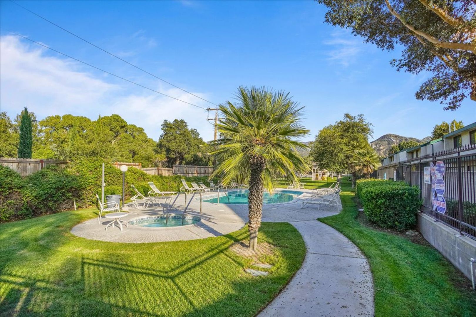 The community amenities include resort-style features such as tennis and basketball courts, a pool and spa, a park with picnic benches, and a large grassy area for outdoor activities—with plenty of guest parking available.