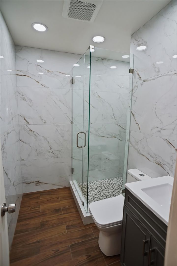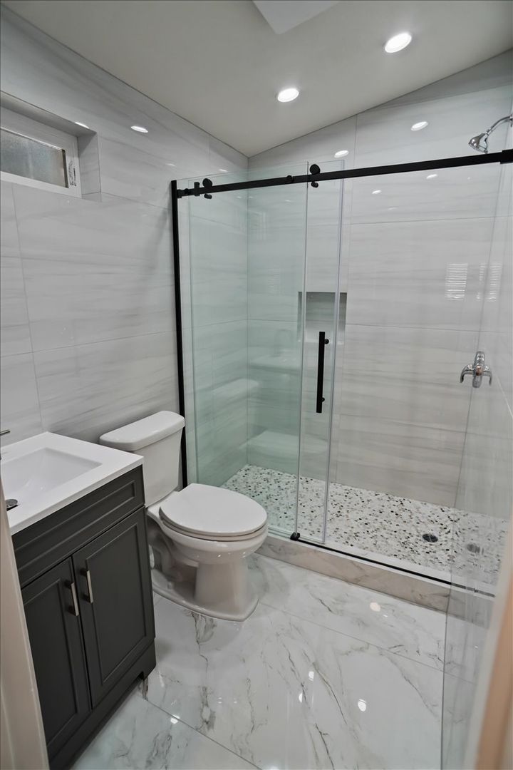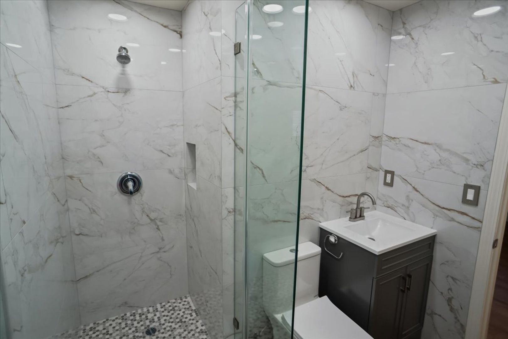 There are three bedrooms, including a primary suite with a huge walk-in closet that’s large enough to be used as a playroom, office, or exercise space—plus an additional closet for extra storage. Both bathrooms have been completely remodeled. The primary bathroom features glass barn-style shower doors, a beautifully tiled shower with pebble flooring, recessed lighting, and an upgraded vanity. The hallway bathroom offers a modern vanity, glass shower doors, tiled walls, and a new toilet.