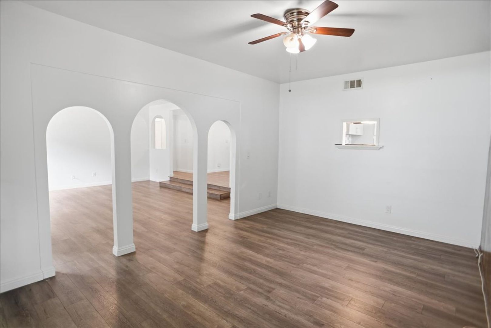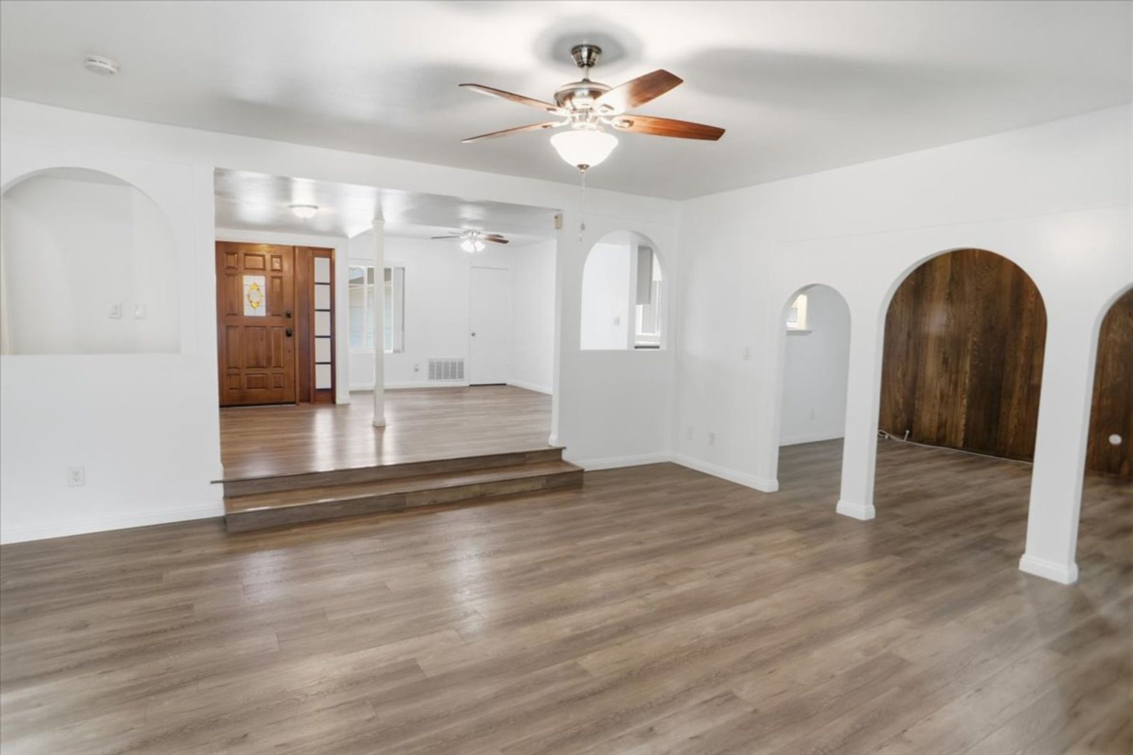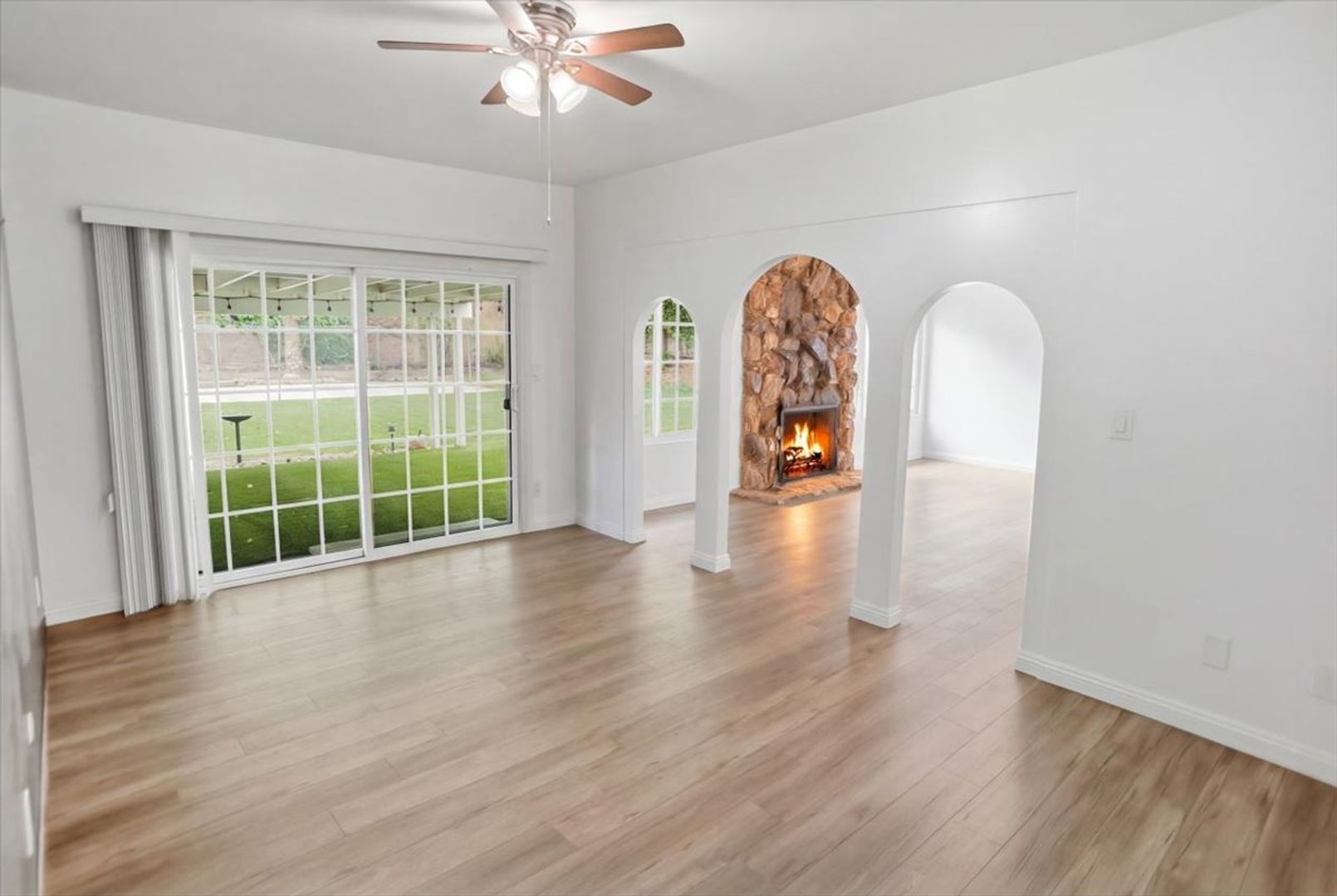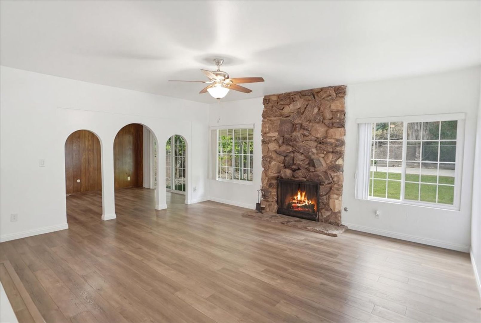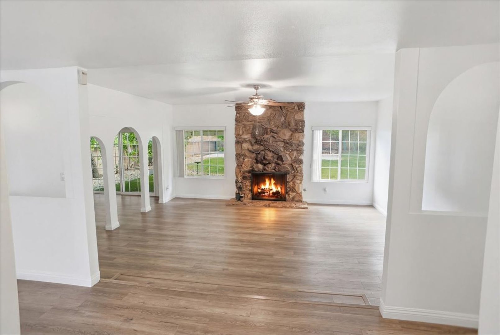 Step inside to find a bright and open floor plan featuring vinyl flooring throughout (no carpet), custom paint, and abundant natural light. The spacious living room showcases a charming rock fireplace, perfect for cozy evenings. An additional versatile room with elegant archways can be used as a den, office, or flex space to suit your needs.