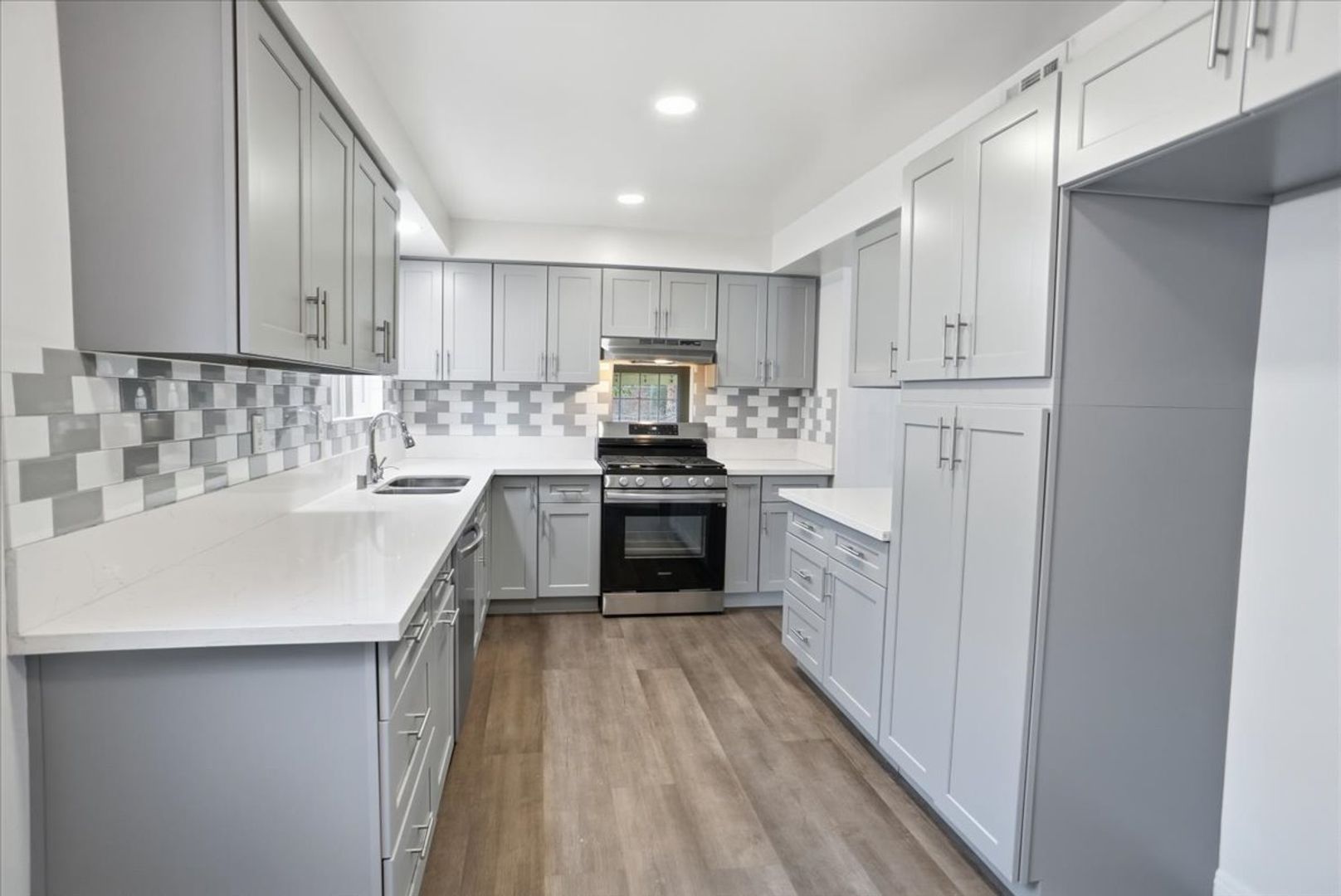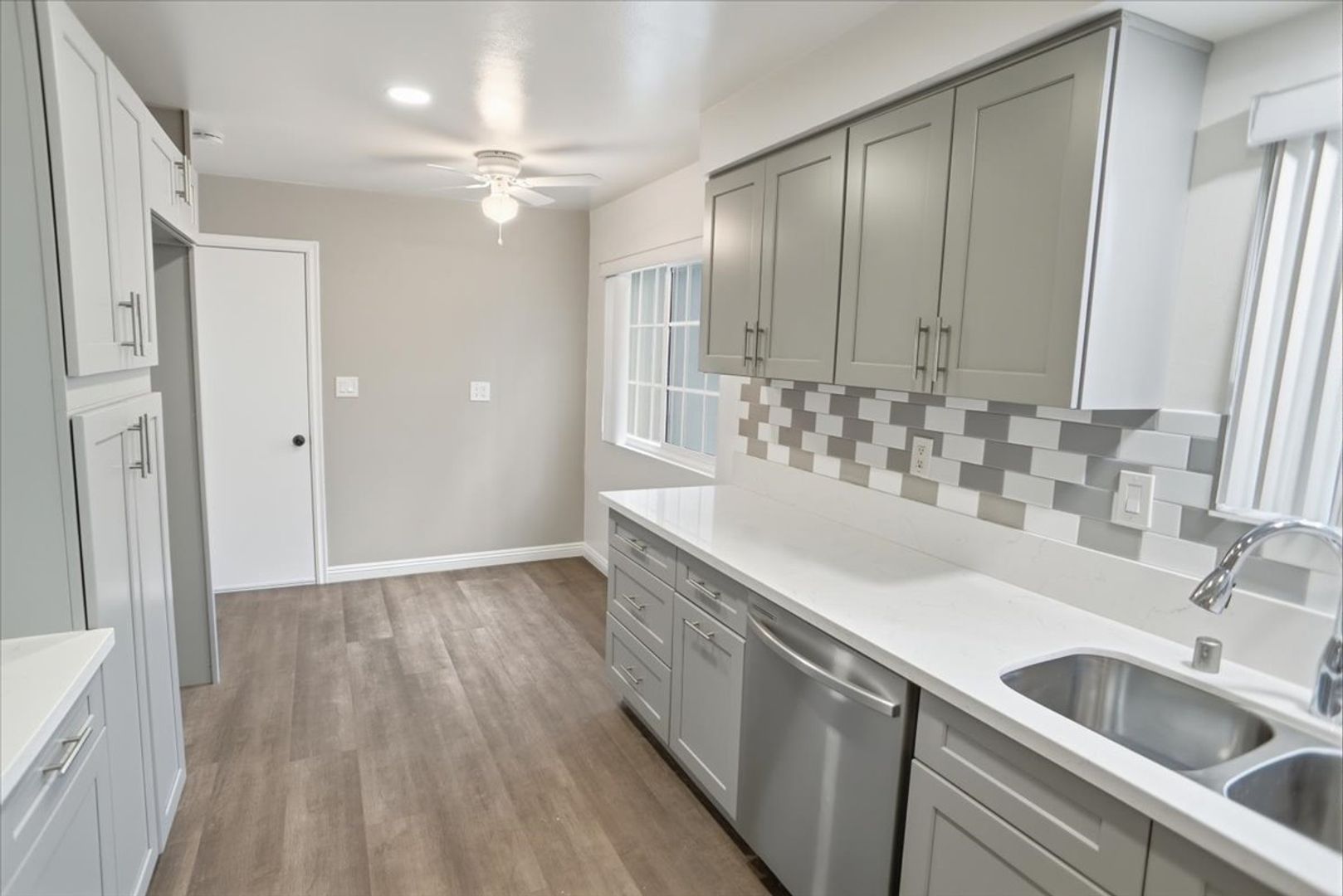 The upgraded kitchen is a true highlight, complete with custom cabinetry, tiled backsplash, upgraded countertops, recessed lighting, and stainless steel appliances. A cozy sitting area and adjacent dining space with ceiling fans make it ideal for both everyday living and entertaining.