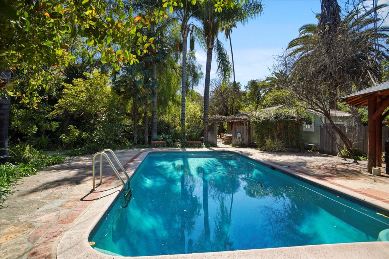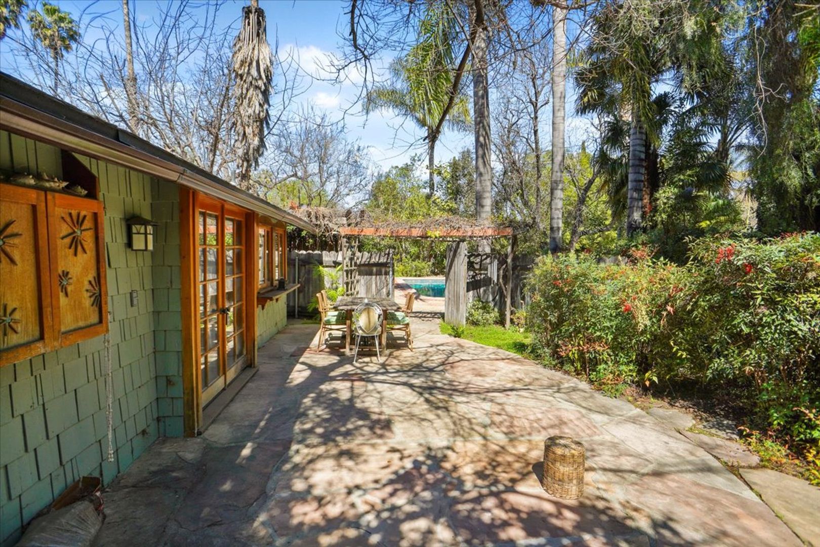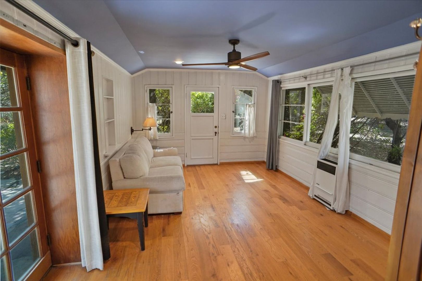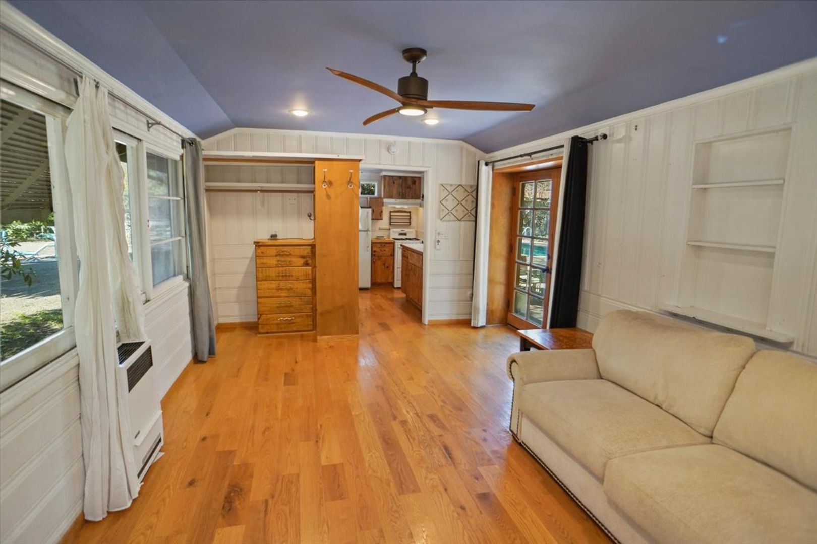 Discover this unique guest house/studio tucked away in Tarzana, surrounded by a collection of individual properties on the lot. This cozy space features a combined living and bedroom area with real hardwood floors, wainscoting accents, and a ceiling fan. There’s a dining nook and a kitchen equipped with wood cabinets, recessed lighting, a stove, and a refrigerator. The bathroom offers a tiled shower, and residents can also enjoy access to a community pool area.