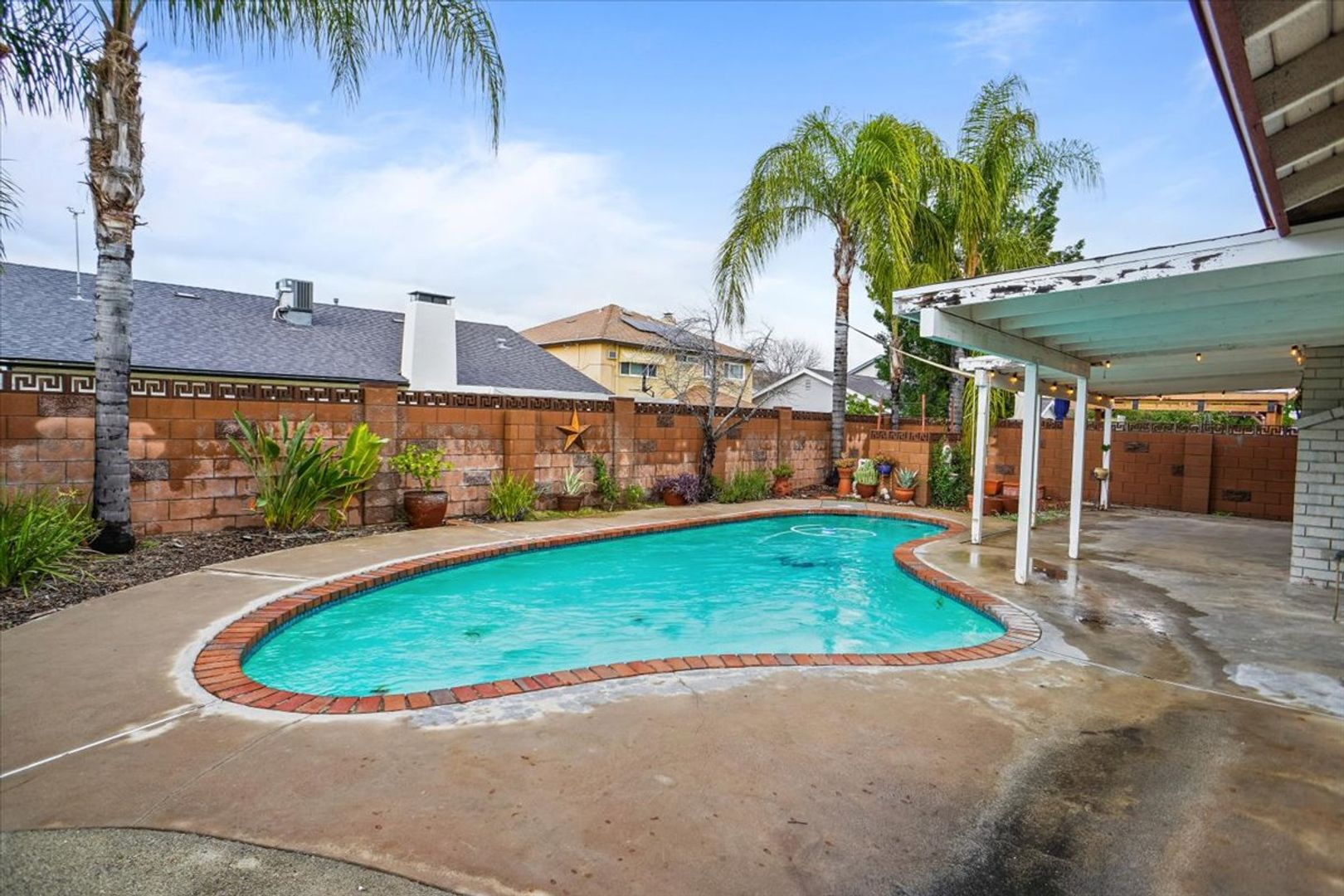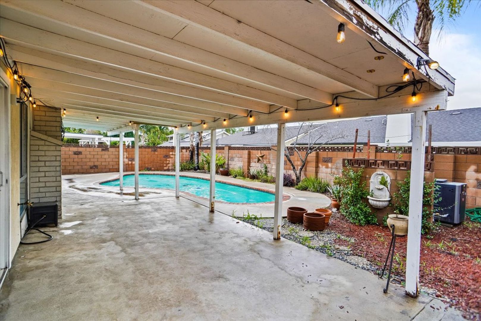 The private backyard is perfect for entertaining, featuring a patio cover, seating area, and a sparkling pool.