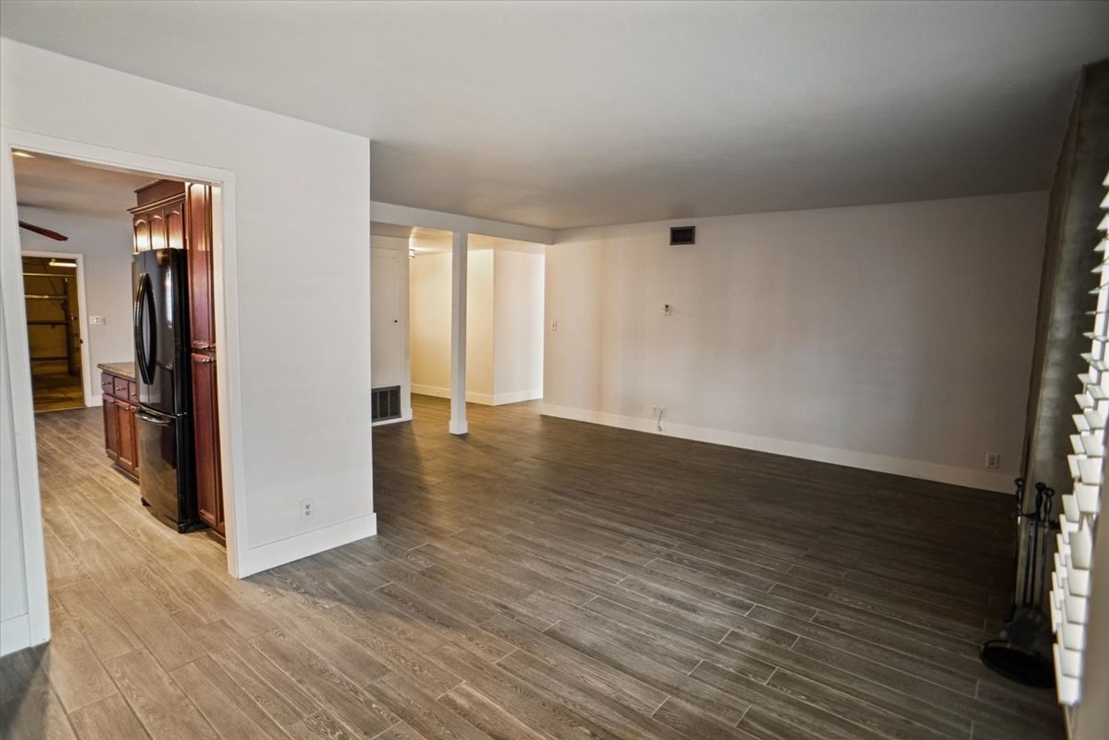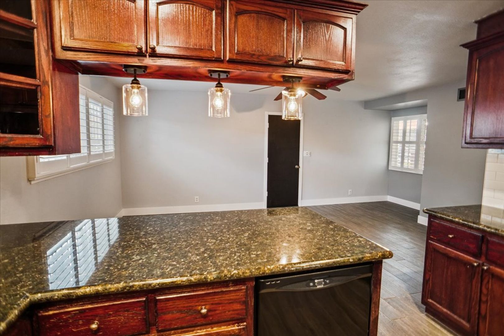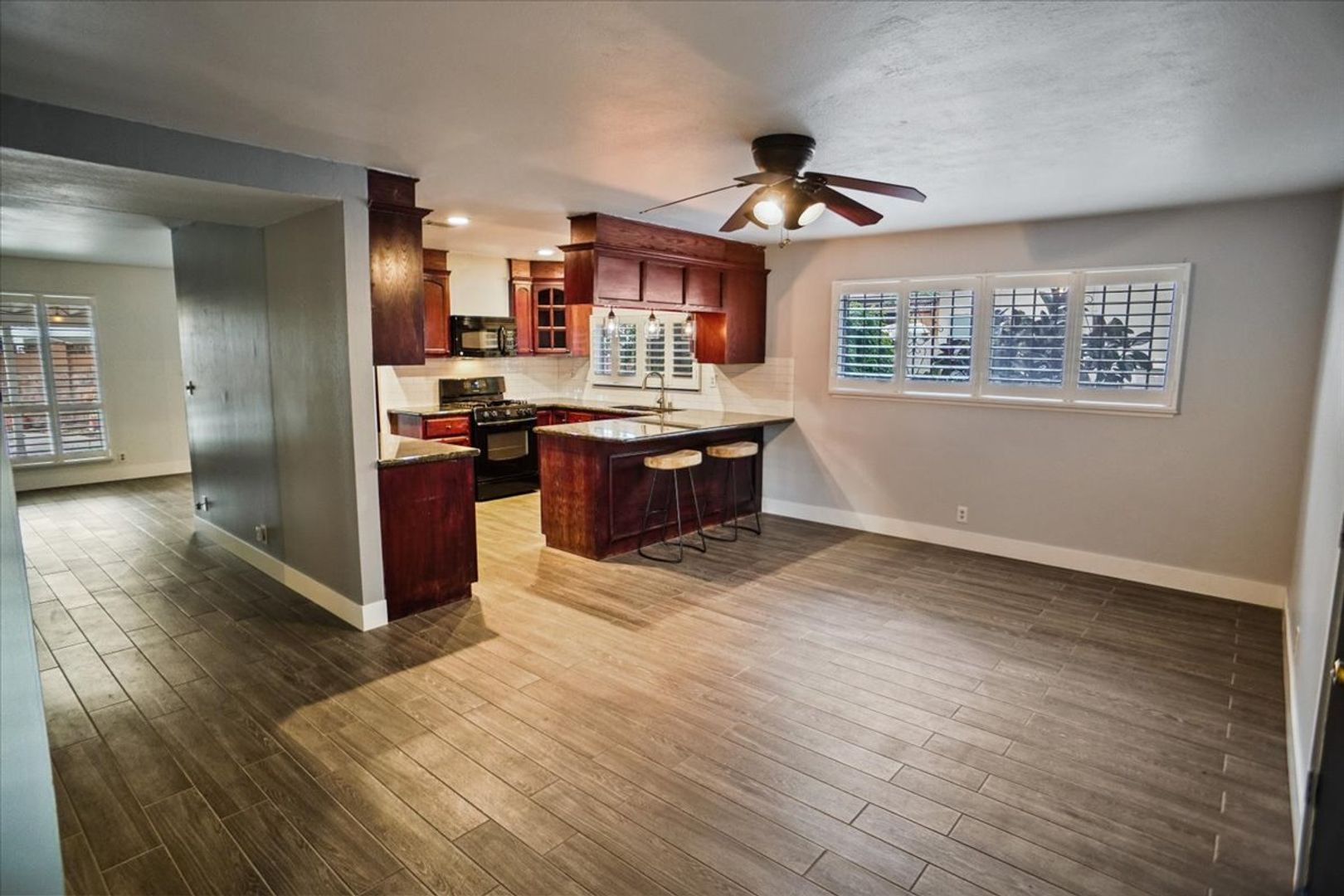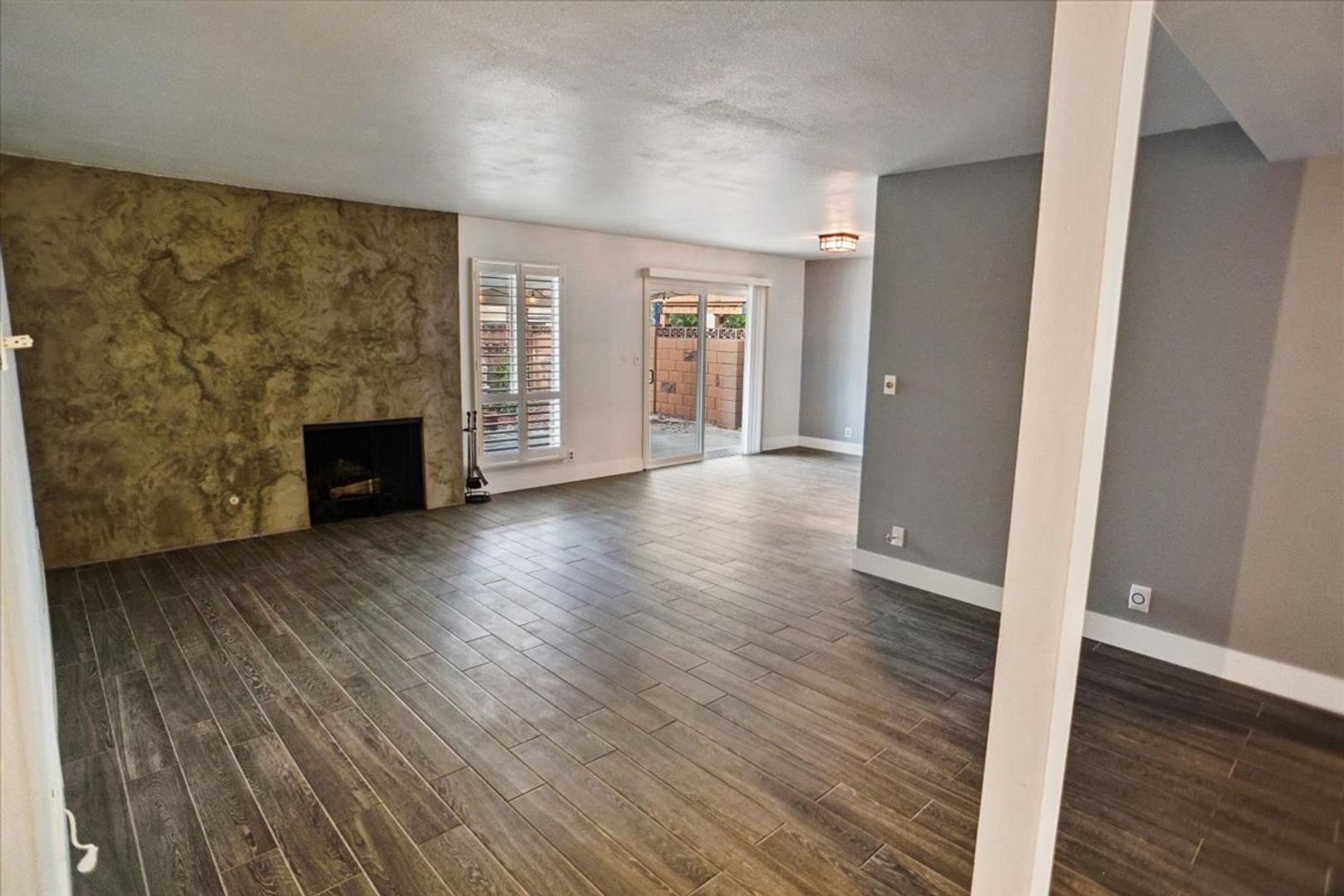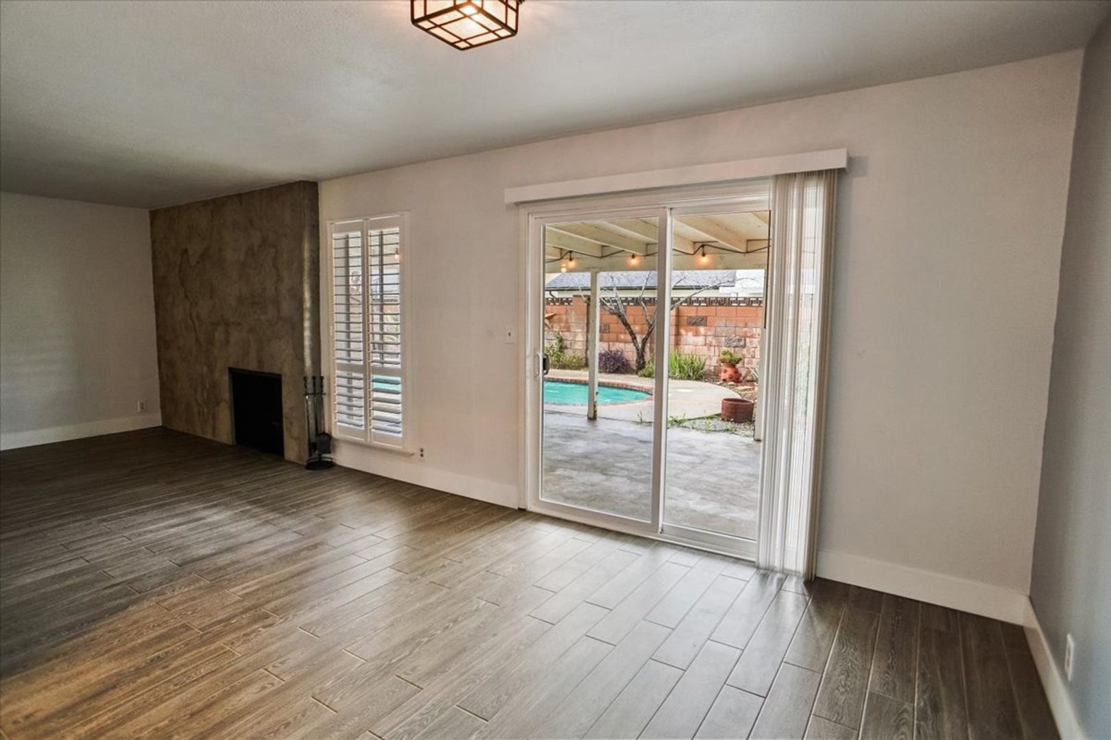 The family room features a ceiling fan and wood shutters, while the spacious living area boasts a dramatic fireplace and an adjacent dining area with an updated light fixture.
