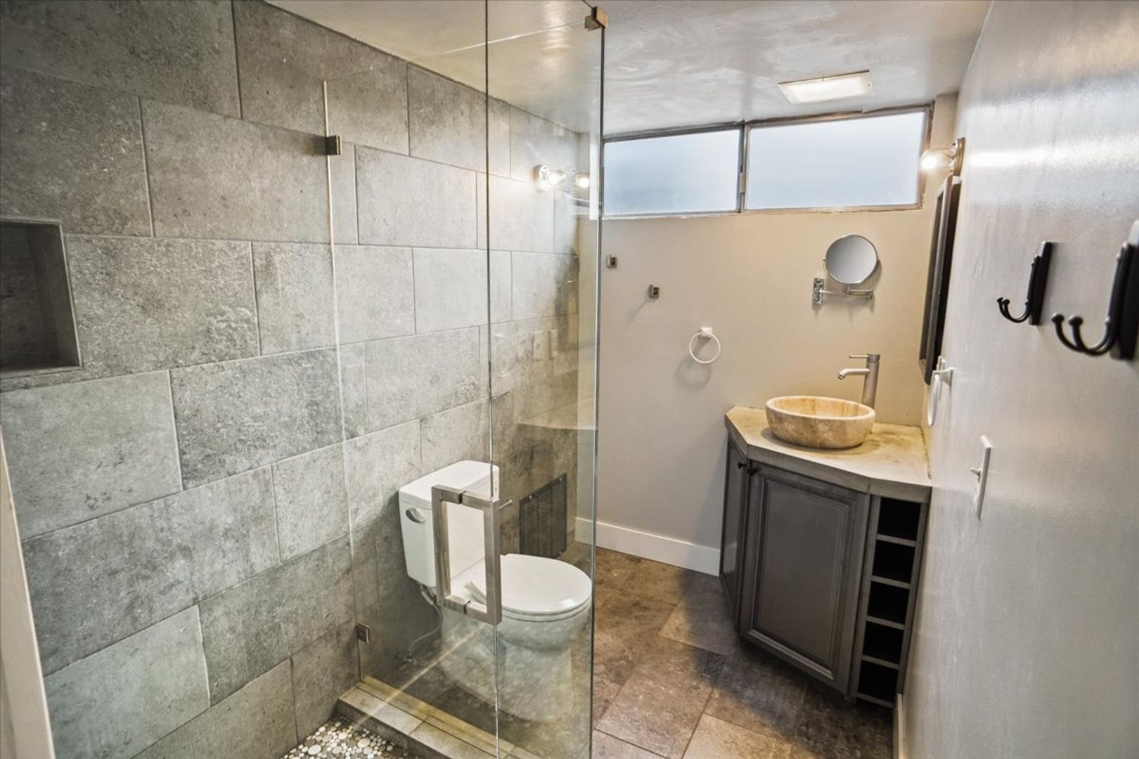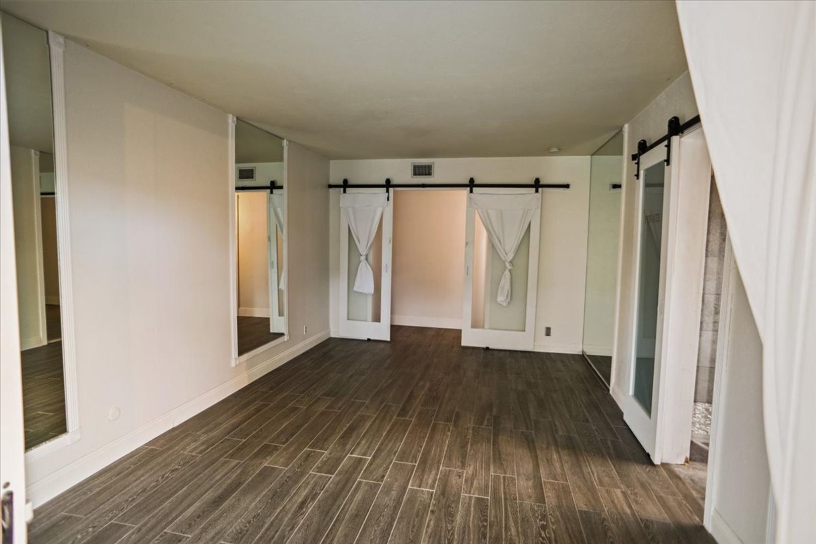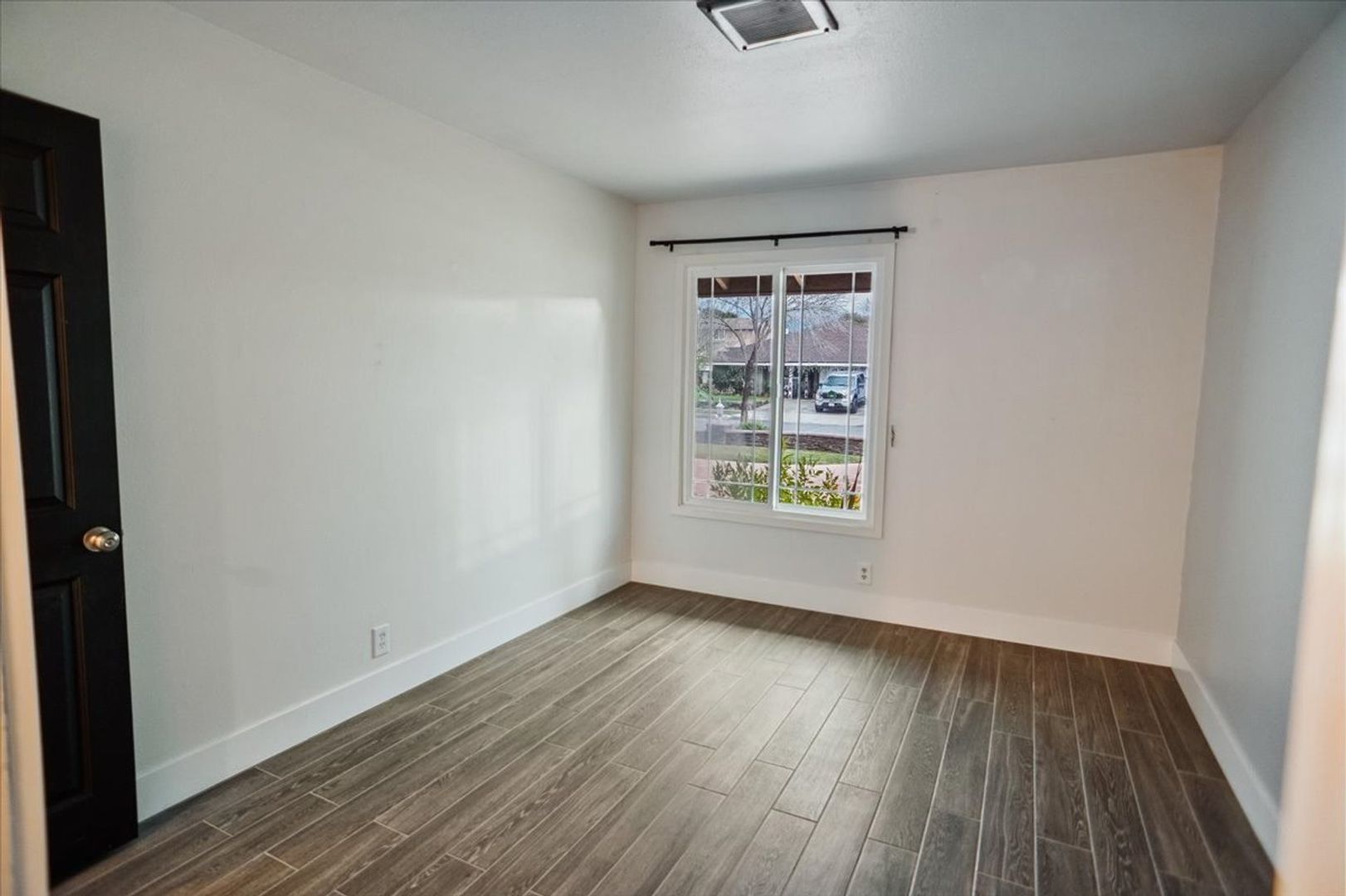 The large primary bedroom offers direct access to the backyard and features stylish barn doors leading to the upgraded en-suite bathroom, complete with tiled floors, a tiled walk-in shower, upgraded vanity and sink, and a walk-in closet.