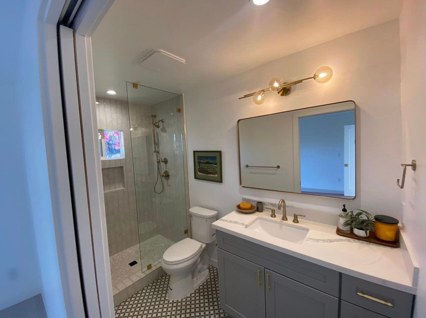 The home features beautiful white oak flooring, recessed lighting, and generously sized bedrooms designed for privacy and comfort. The bathrooms are thoughtfully finished with designer tile, brass fixtures, modern vanities, and walk-in showers, creating a clean and elevated aesthetic.