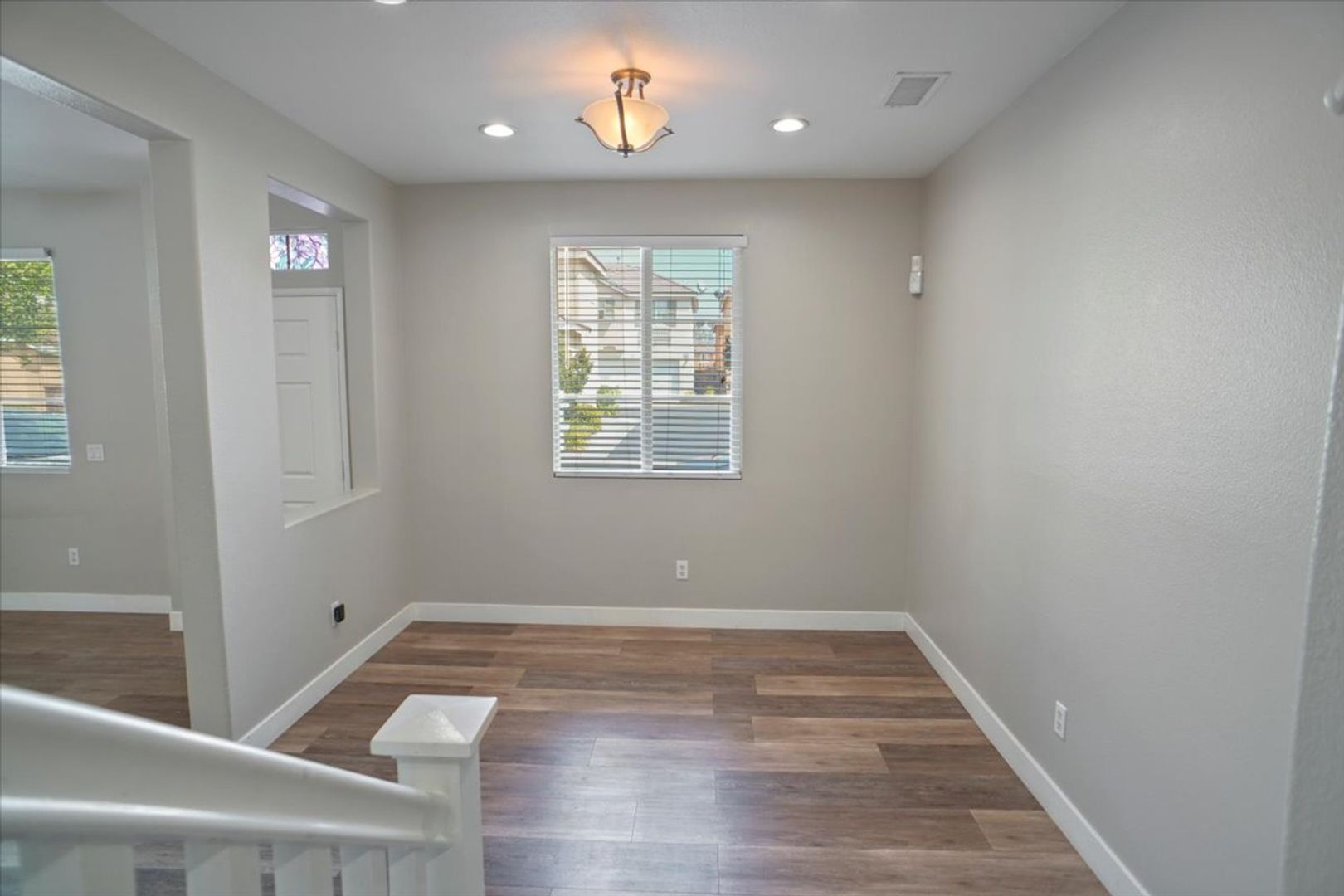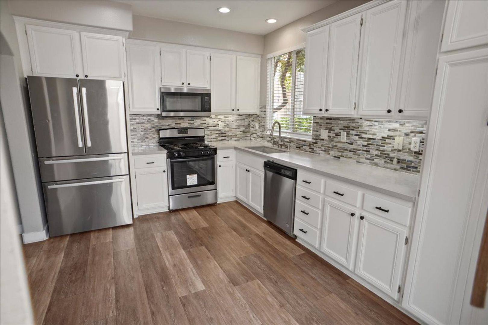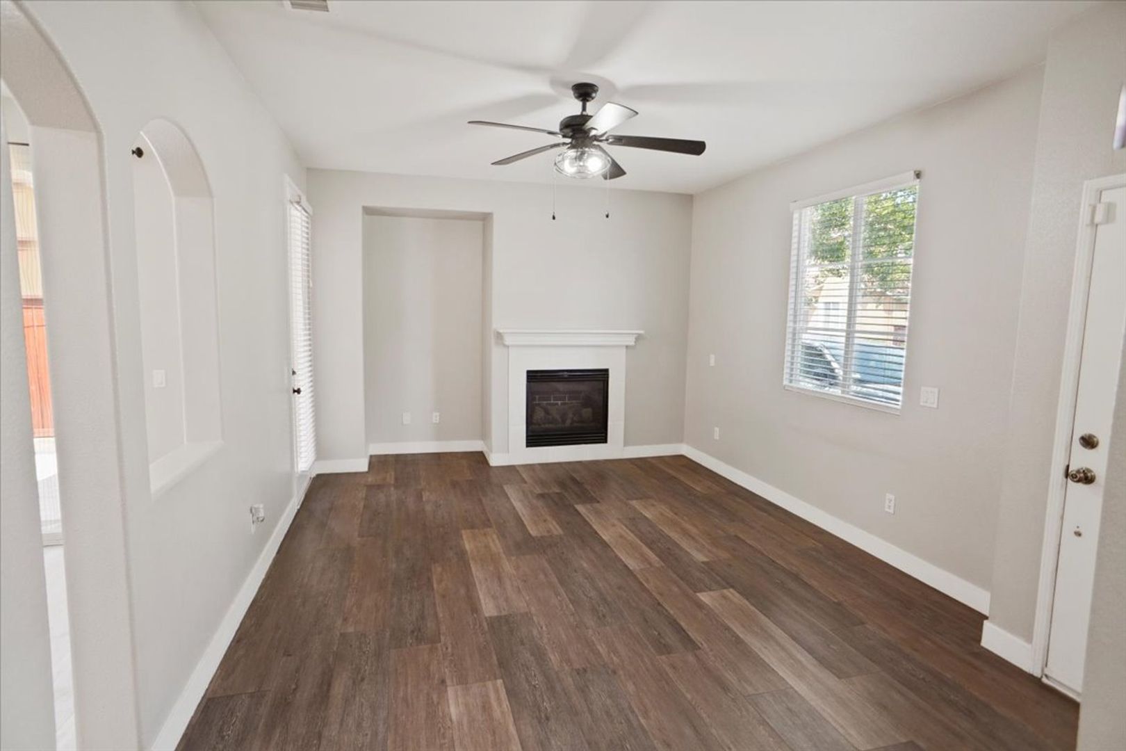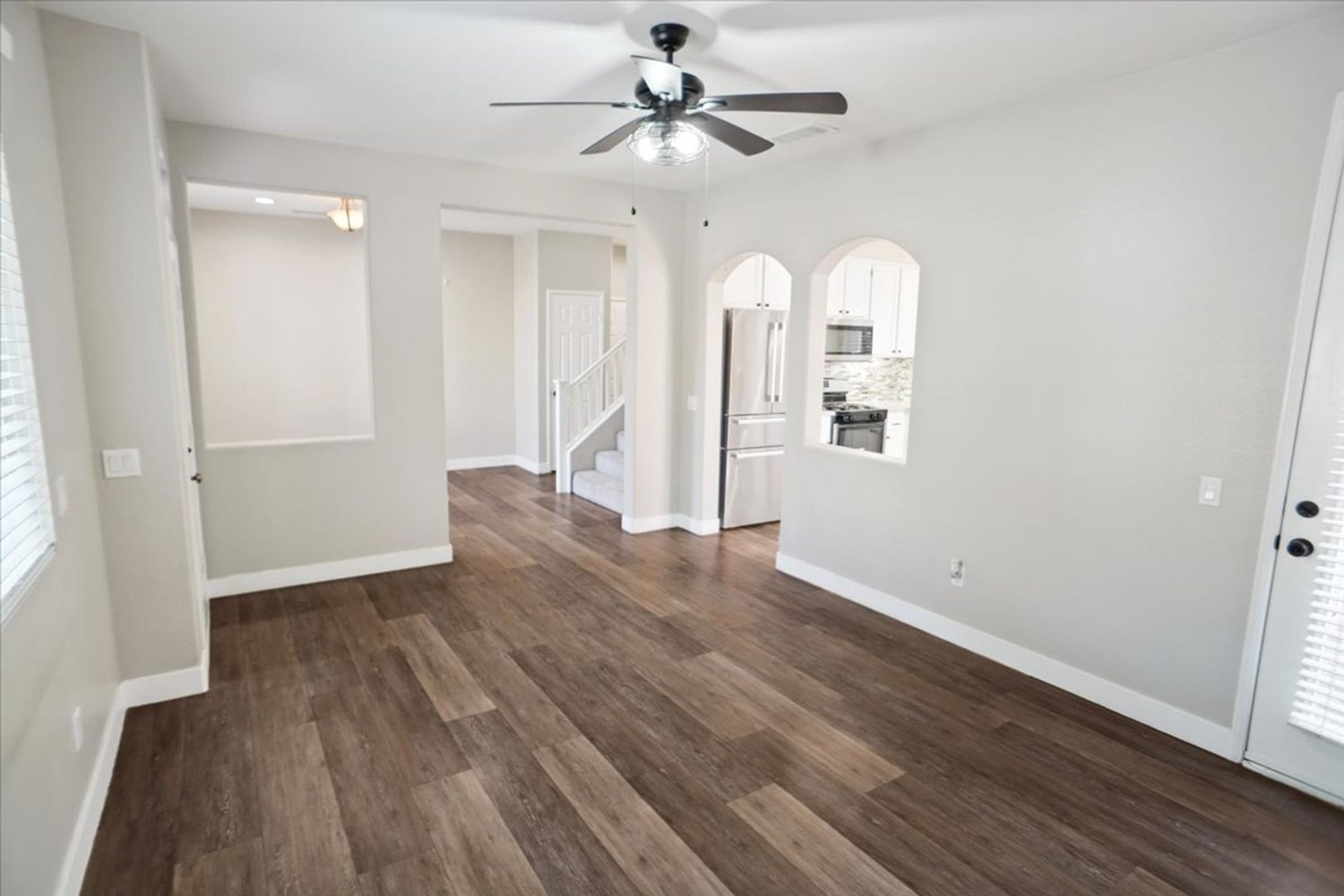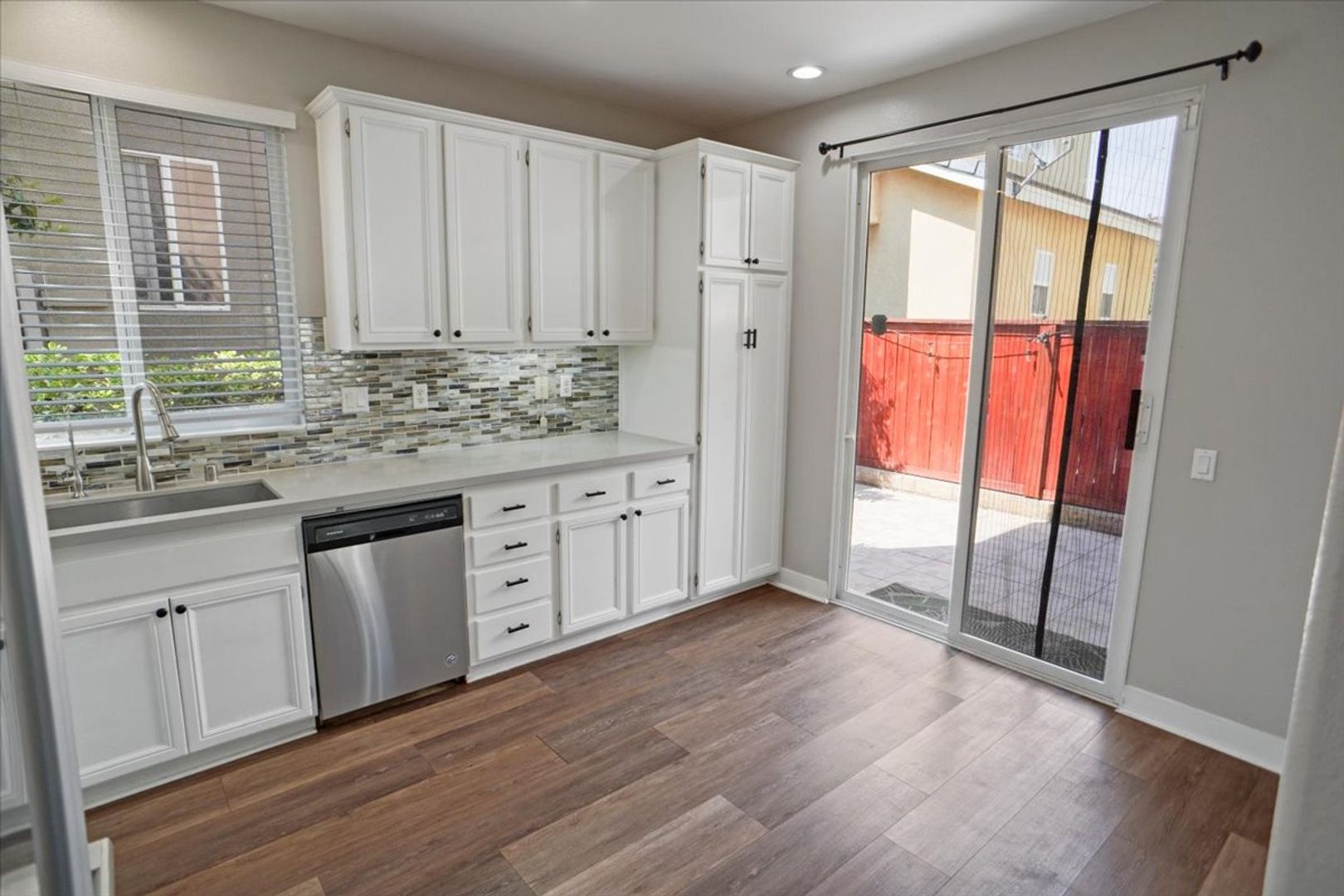 Step inside to discover an open floor plan with elegant wood flooring, a cozy fireplace, and abundant natural light. The spacious living area seamlessly flows into the dining room and a modern kitchen, featuring stainless steel appliances, pristine white cabinetry, and a stylish tile backsplash. Sliding glass doors lead to a private back patio, perfect for outdoor dining and relaxation.