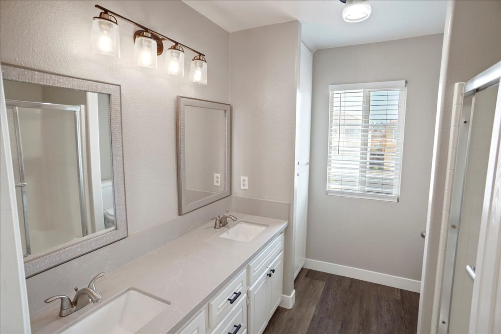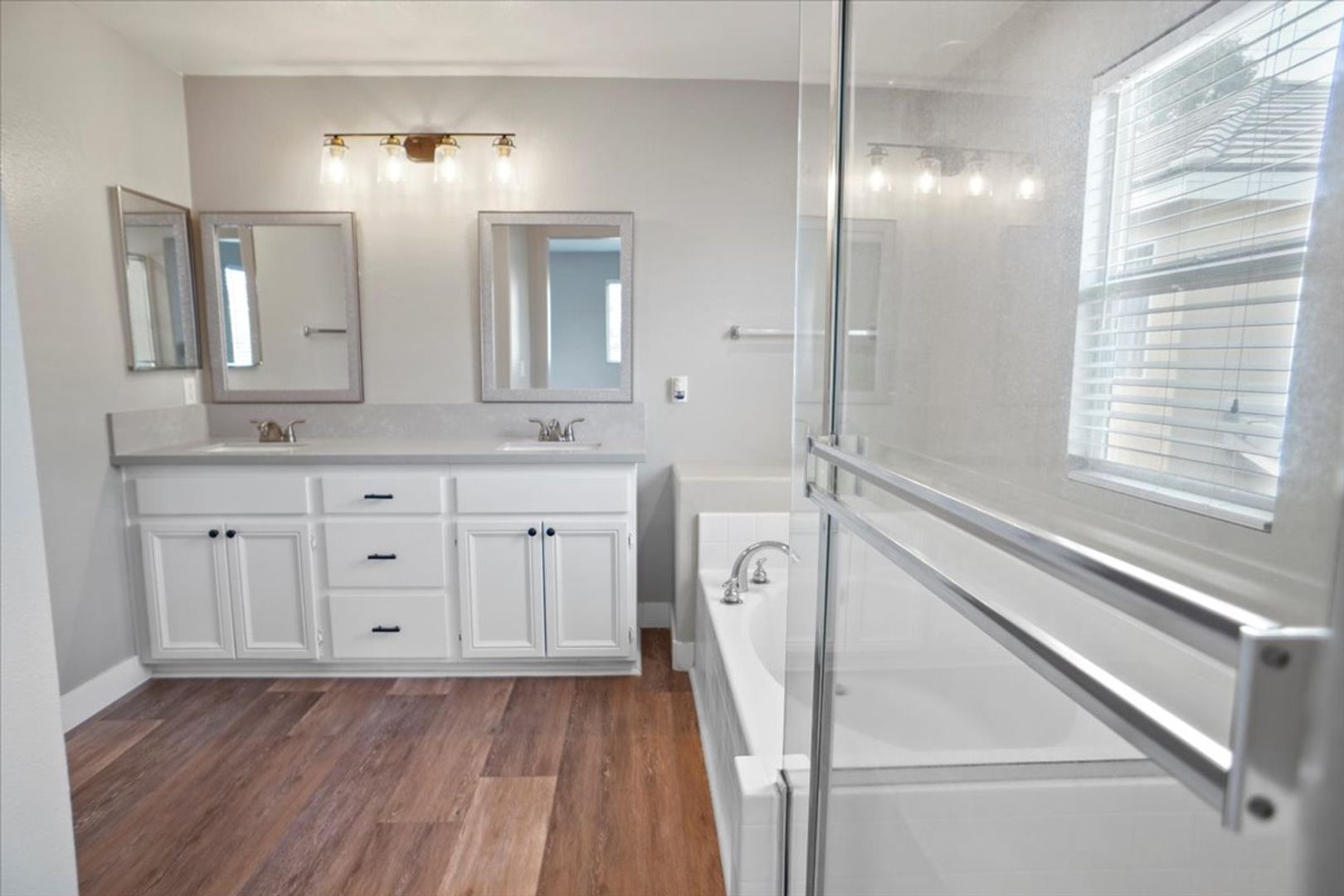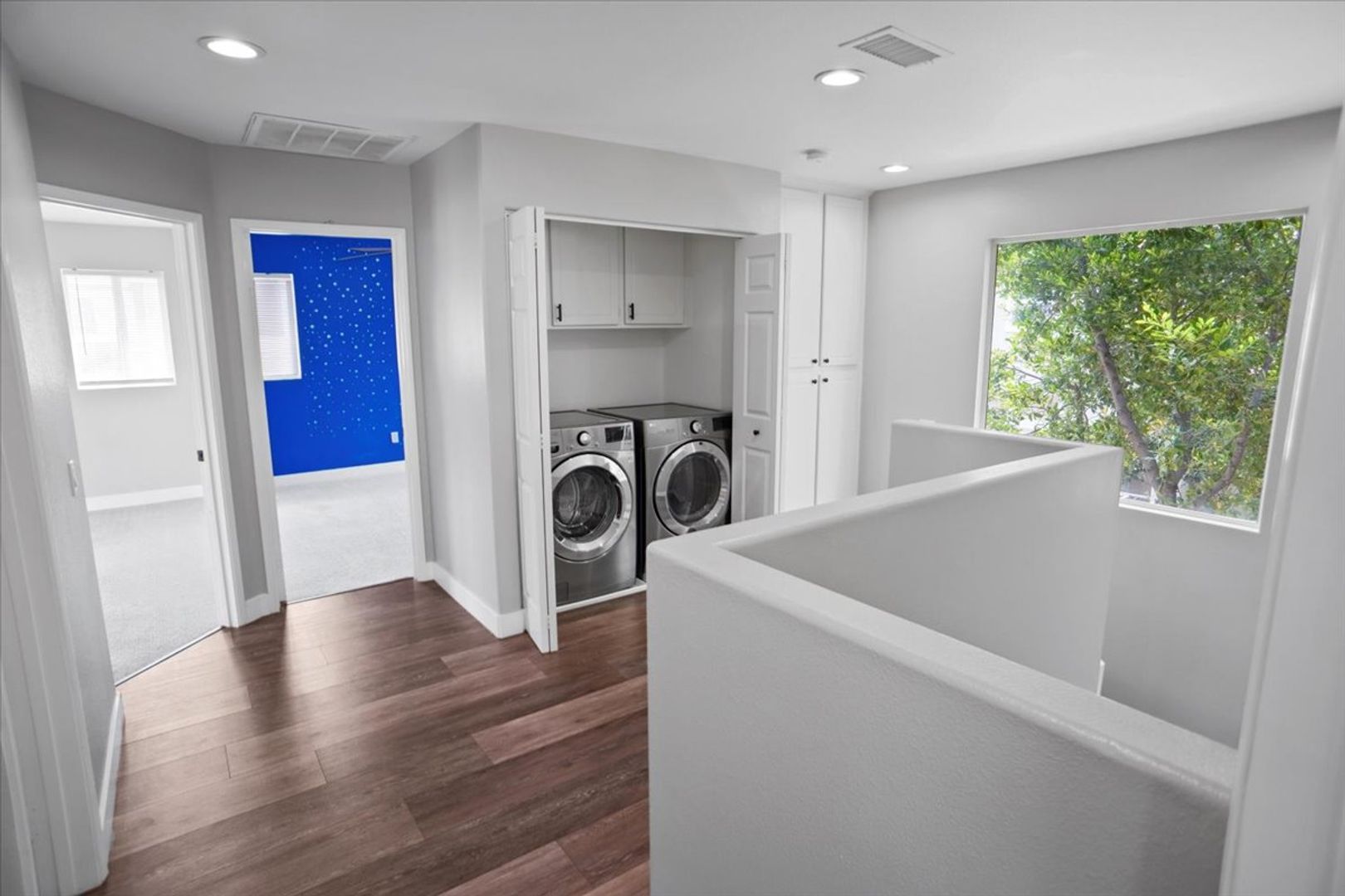 Upstairs, the primary suite offers a tranquil retreat with a walk-in closet, mirrored wardrobe, and an en-suite bathroom equipped with dual sinks, a soaking tub, and a separate shower. Two additional bedrooms are well-appointed with generous closet space and share a contemporary bathroom. A convenient laundry area is also located on the upper level.