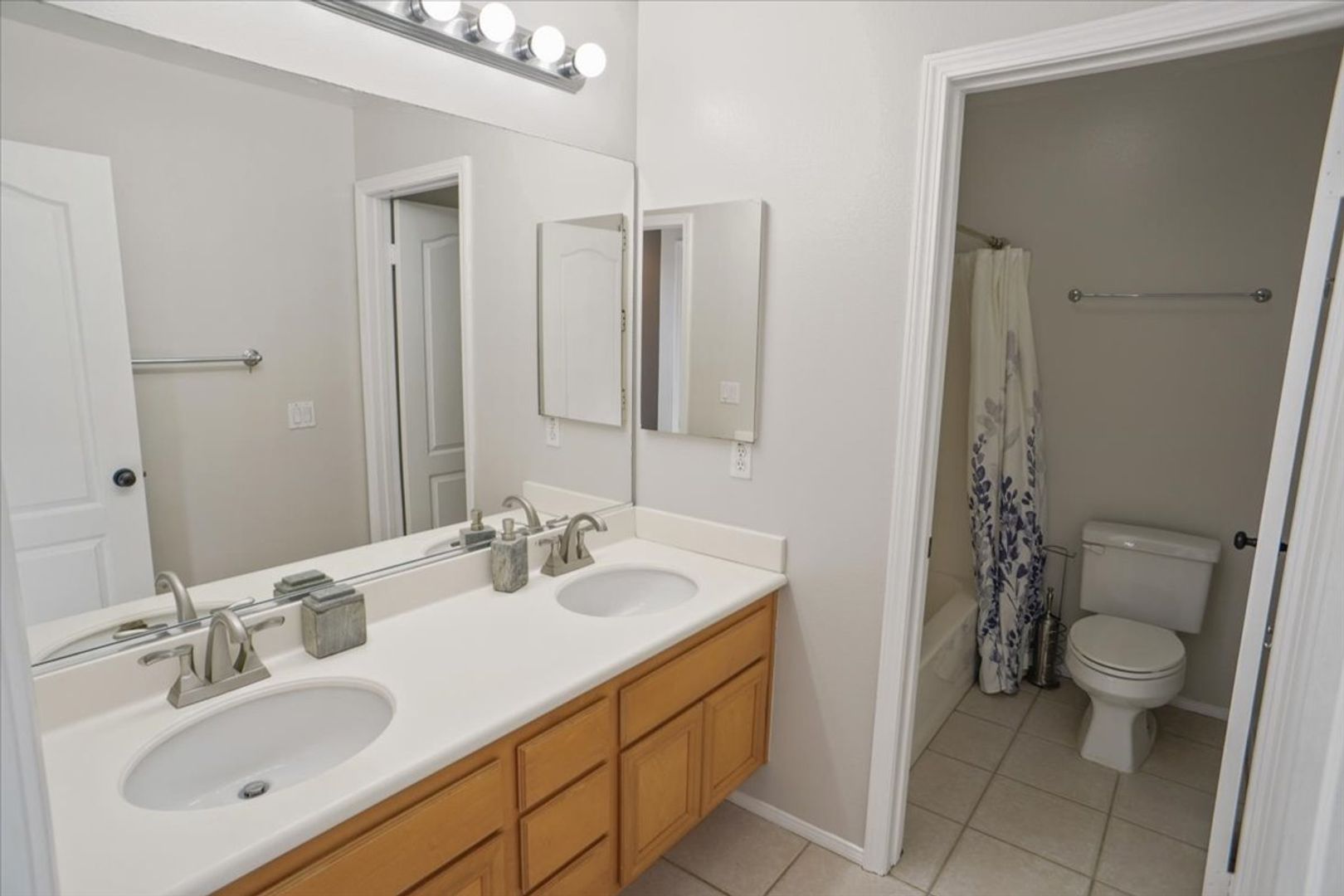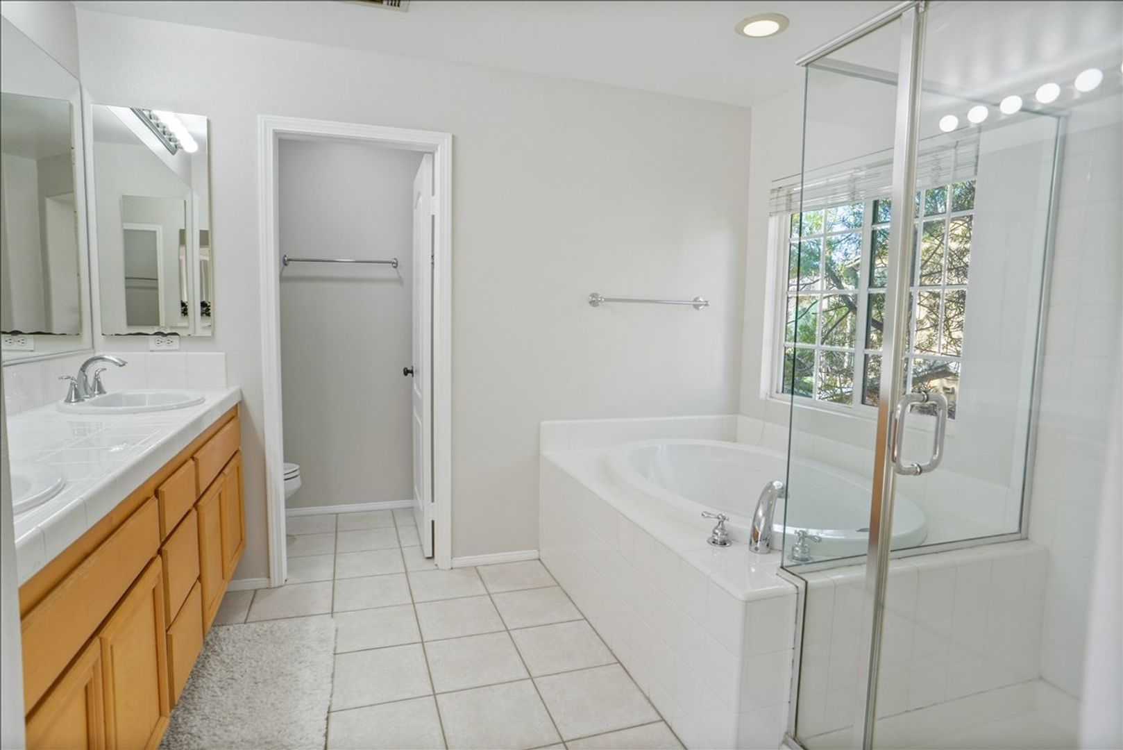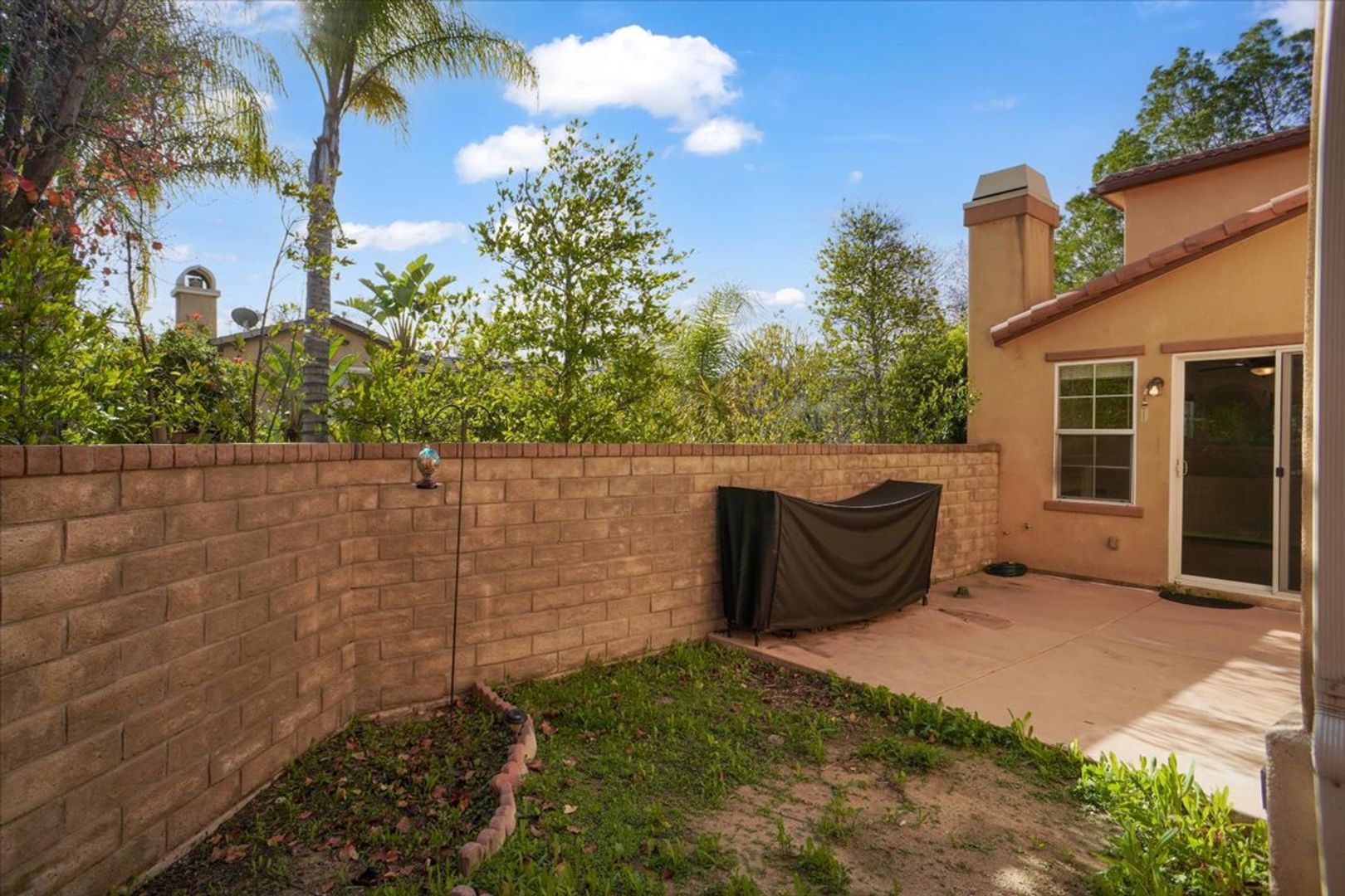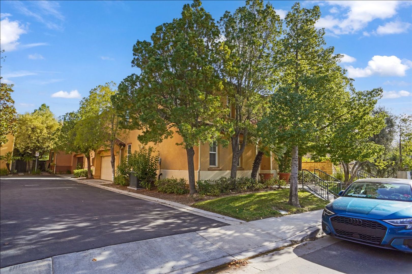 The hallway bathroom also includes dual sinks and a shower/tub combination. Additional highlights include a separate laundry room with cabinets and washer/dryer, a 2-car attached garage, and a private backyard with a sitting area—perfect for relaxing or entertaining.