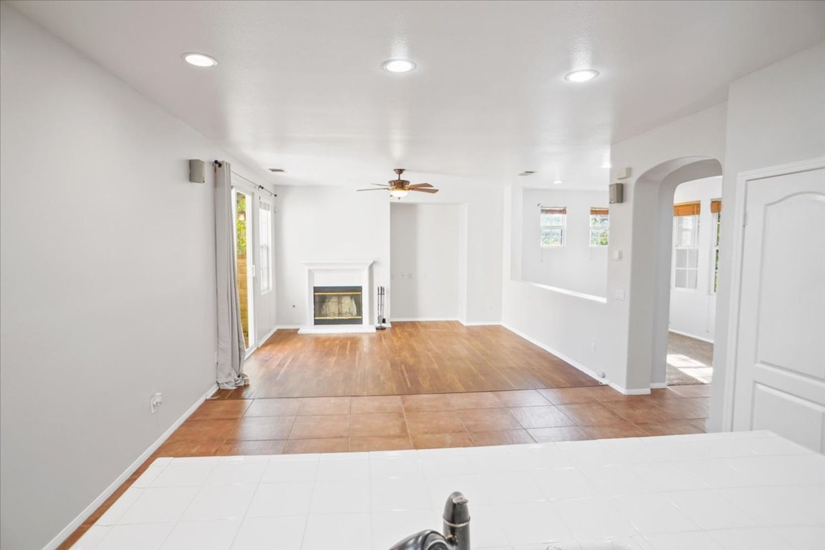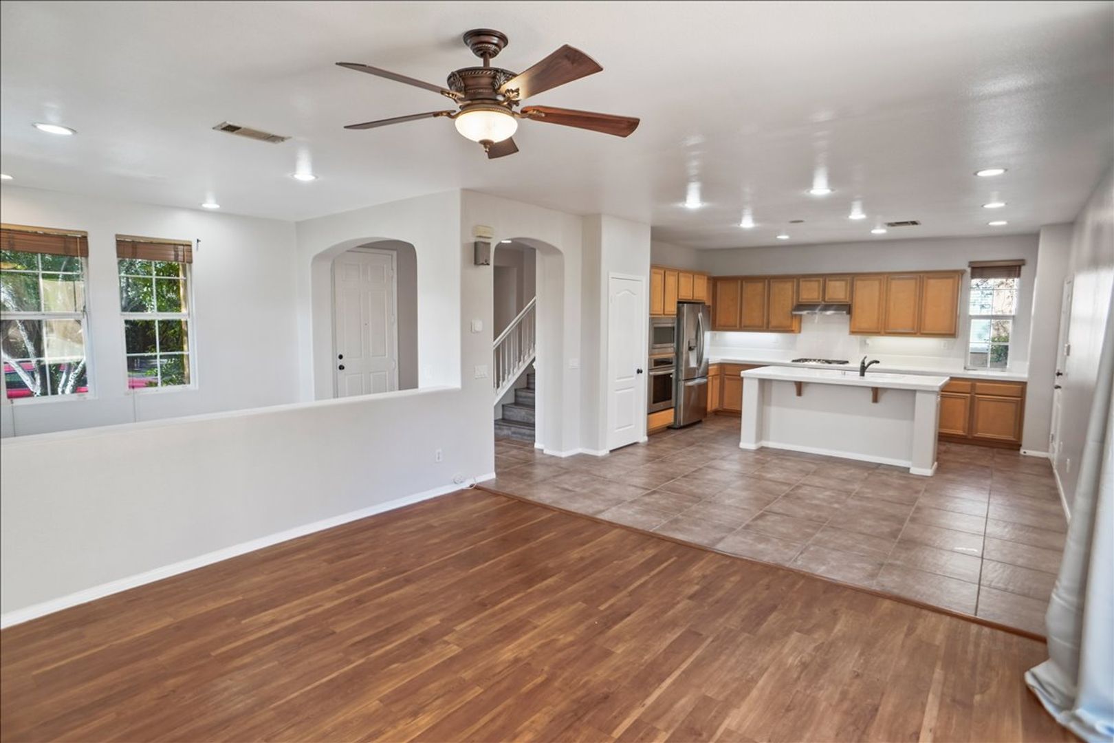 The open floor plan features a separate dining room with recessed lighting and an abundance of windows that provide plenty of natural light. The kitchen includes an island, custom cabinetry with ample storage, recessed lighting, a pantry, breakfast bar, and stainless steel appliances—including a refrigerator, oven, microwave, range, hood, and dishwasher.