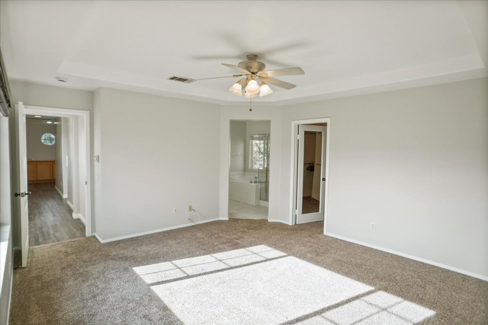 The spacious living room offers a ceiling fan and a cozy fireplace, and a convenient powder room is located on the main level. Upstairs, you’ll find three generously sized bedrooms, all with ceiling fans. The large primary bedroom features a walk-in closet with built-ins and an attached bathroom with dual sinks, a separate glass-enclosed shower, and a soaking tub.