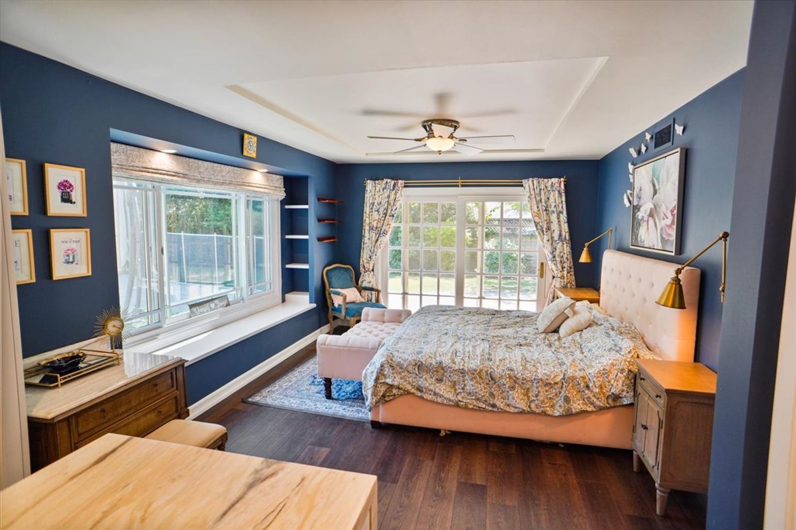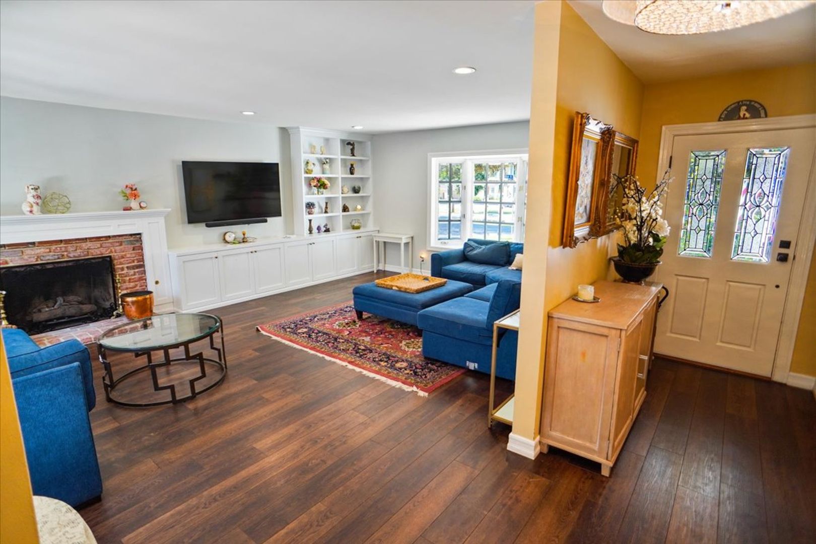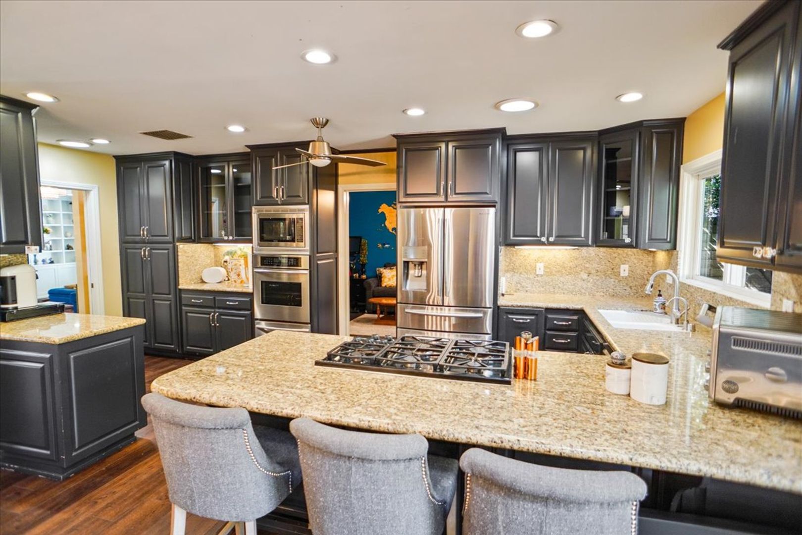 Step into the spacious living room, featuring a cozy fireplace and elegant built-in shelving. The modern kitchen is a chef’s delight, complete with granite countertops, stainless steel appliances, and ample cabinetry. The adjacent dining area flows seamlessly to the backyard, perfect for entertaining guests.