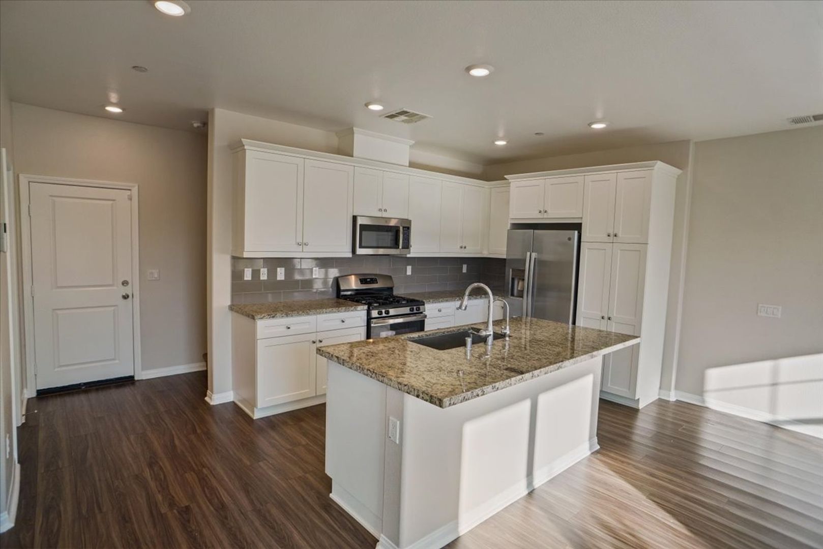 The upgraded kitchen is a chef’s dream, showcasing white cabinetry with ample storage, granite countertops, a large center island, and stainless steel appliances including a refrigerator, oven, microwave, and dishwasher. The adjacent dining area is perfect for everyday meals or entertaining guests. A convenient main-level powder room with an upgraded vanity completes the first floor.