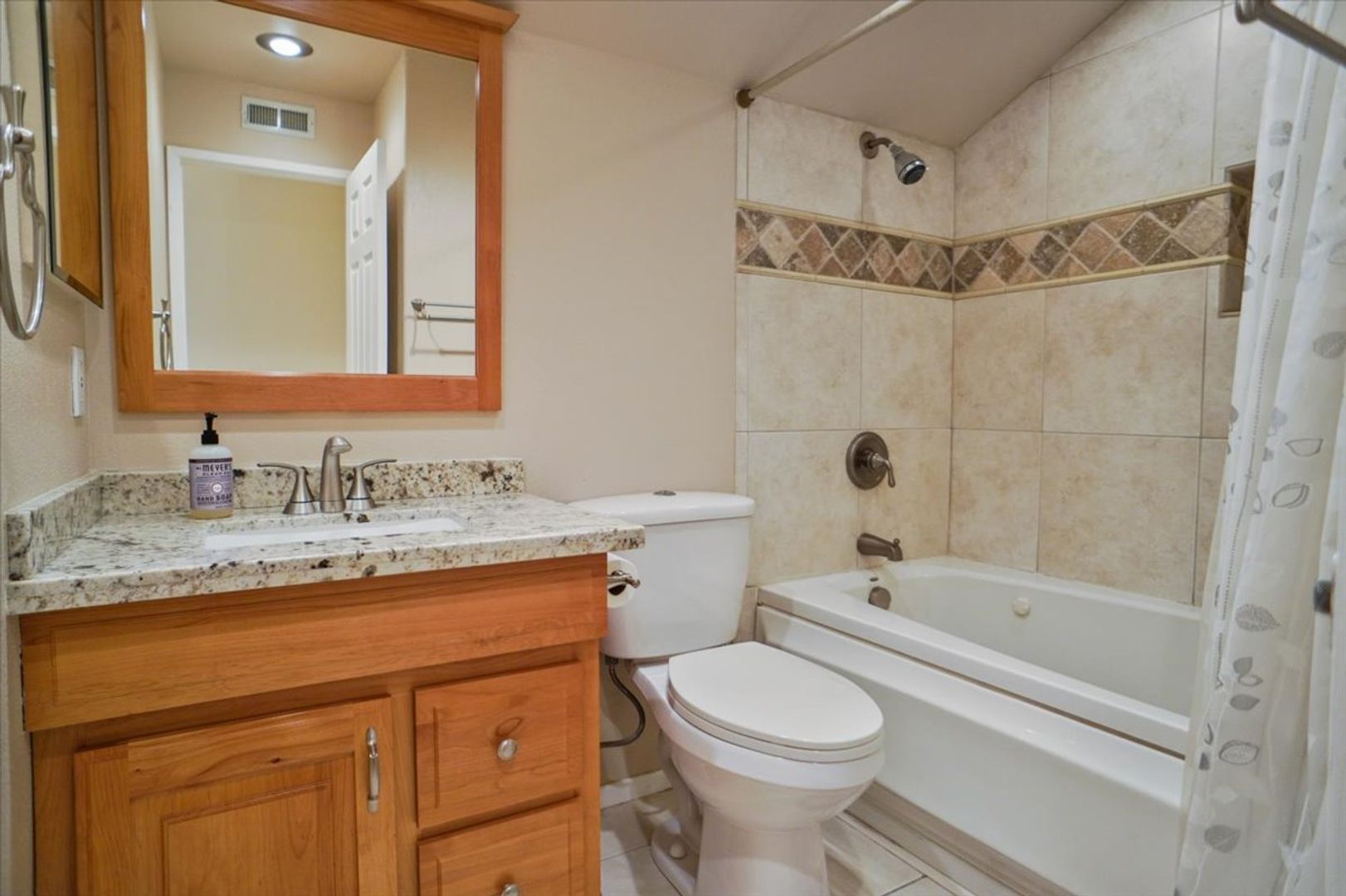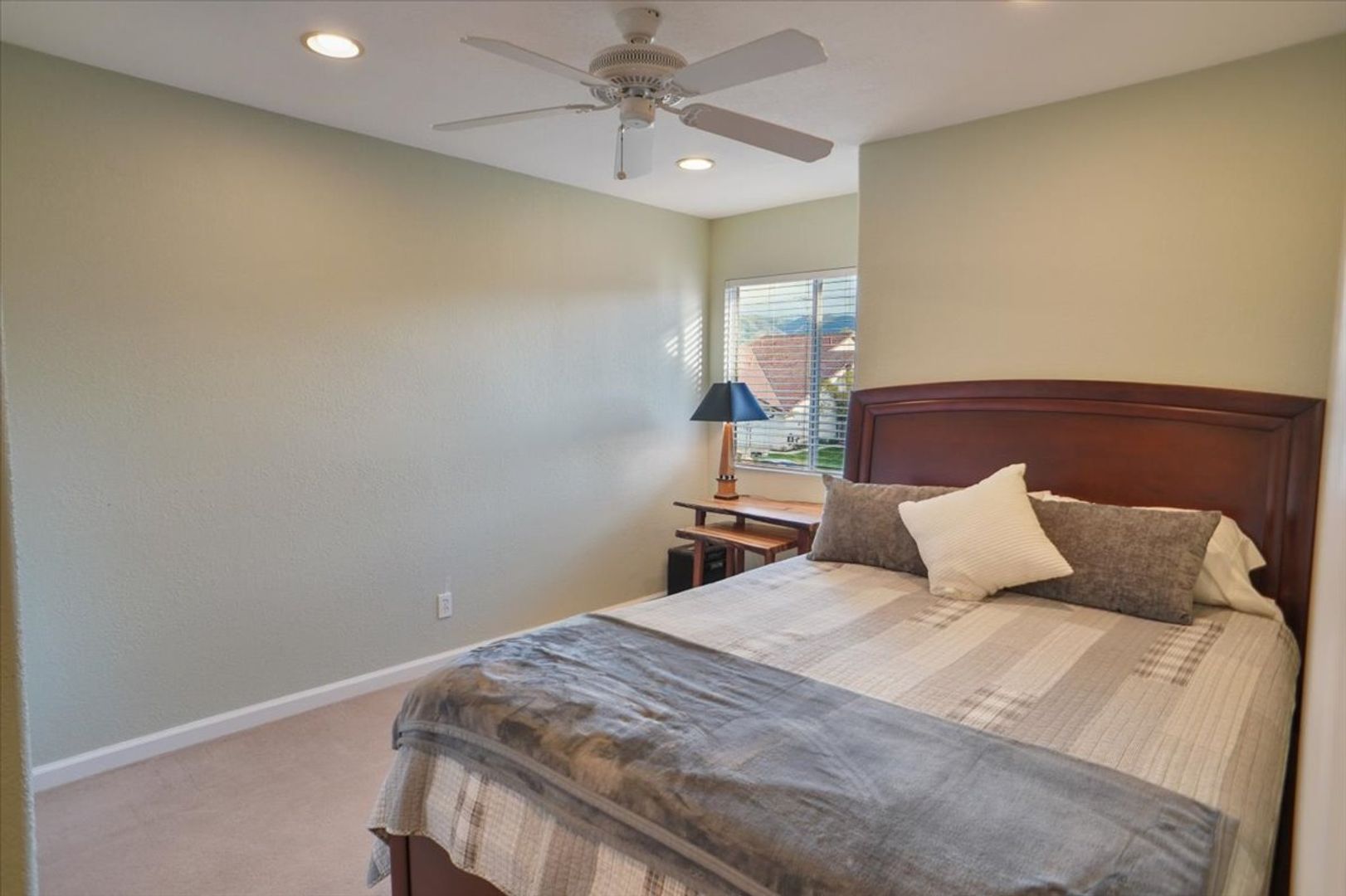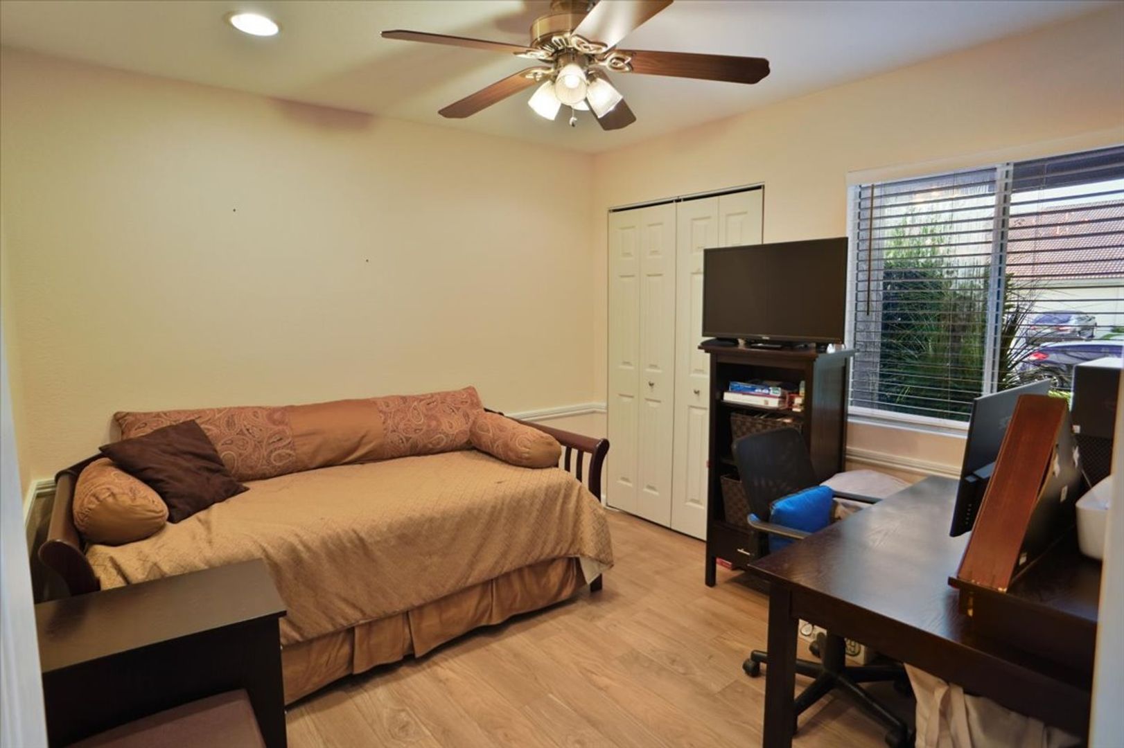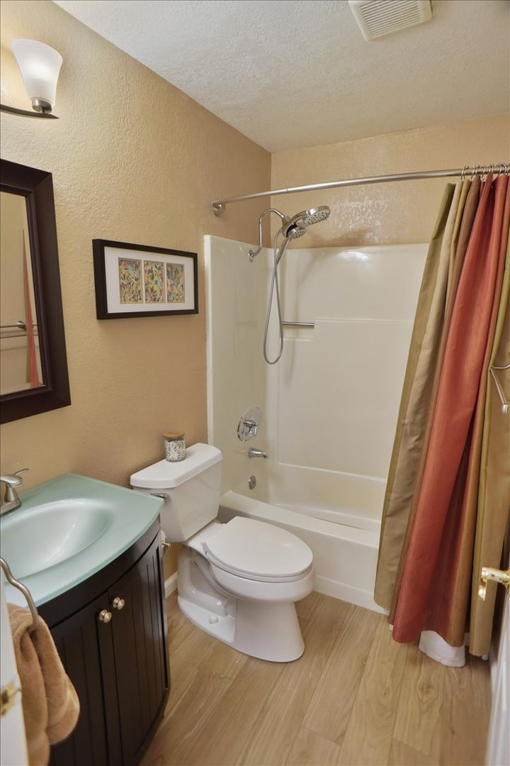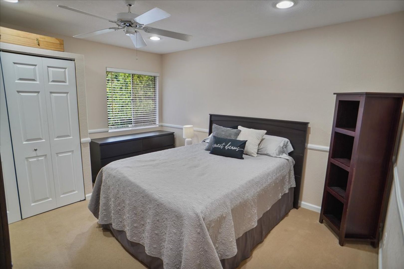 The downstairs bedroom features recessed lighting, ceiling fan, chair rail detailing, and easy access to a full bathroom with upgraded vanity and tub/shower combination.