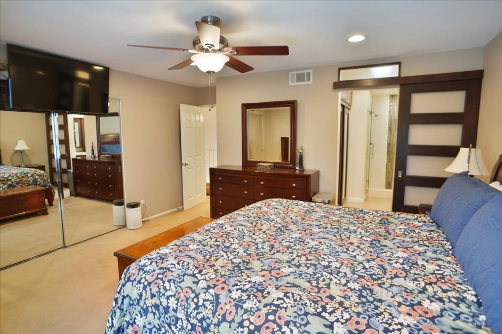 Upstairs, you’ll find three generously sized bedrooms with ceiling fans and recessed lighting. The large primary suite includes mirrored wardrobe closets, an additional custom closet, recessed lighting, and a stylish barn door leading to the upgraded en-suite bathroom. The primary bath features dual sinks, an upgraded vanity, and a tiled walk-in shower with glass enclosure. The upstairs hallway bathroom also includes an upgraded vanity and tub/shower combination.