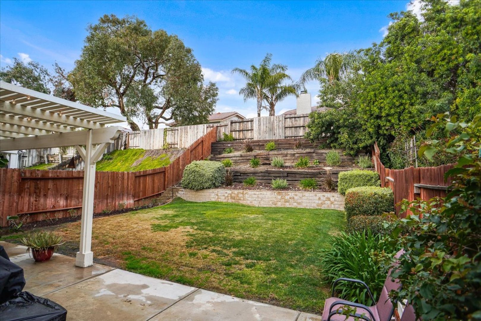 Step outside through the sliding glass door to your private backyard oasis complete with a patio cover, sitting area, grass lawn, and lush foliage — ideal for relaxing or entertaining. The home also includes a 2-car garage.