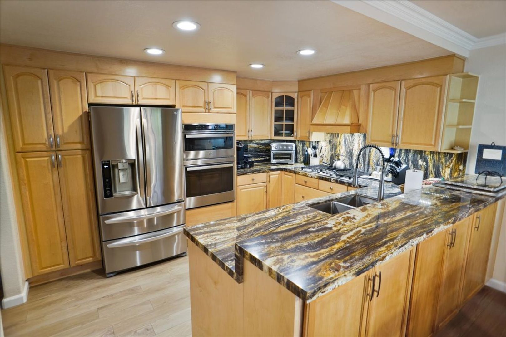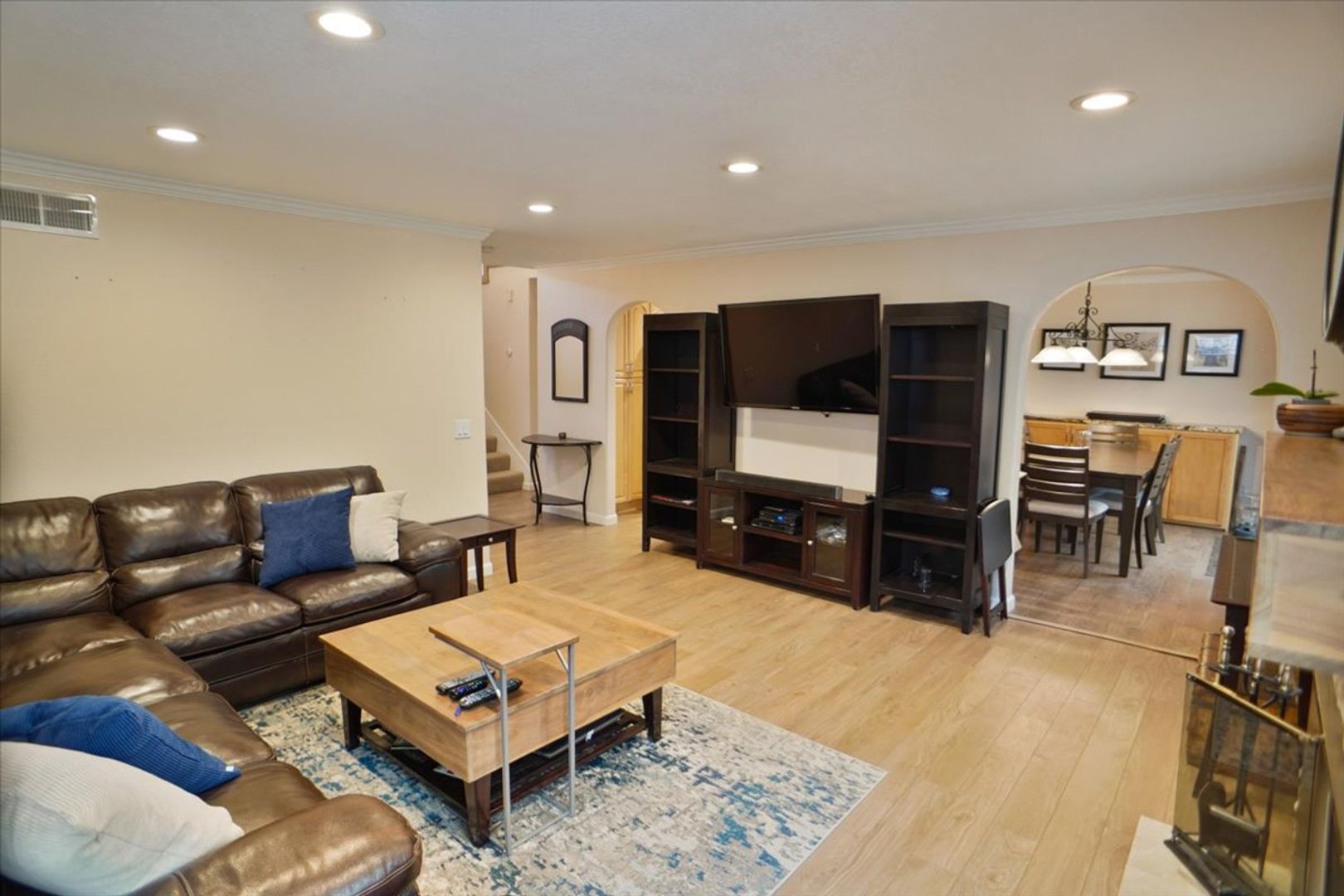 Enjoy the spacious living room with a stunning floor-to-ceiling stone-tile fireplace and mantel, abundant natural light, and beautiful vinyl wood flooring throughout. Custom paint, recessed lighting, and ceiling fans enhance the home’s modern feel.
