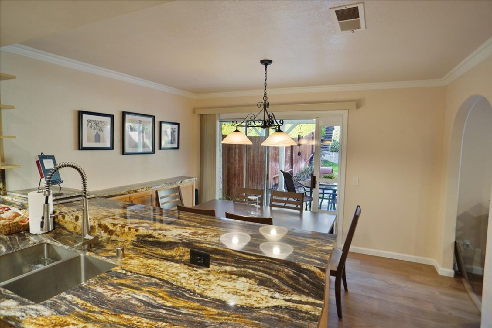 The remodeled kitchen showcases custom cabinetry with abundant storage, granite countertops with full backsplash, a breakfast bar, stainless steel appliances (microwave, oven, dishwasher, refrigerator, cooktop), a stainless steel sink with upgraded faucet, and updated lighting. The kitchen opens seamlessly to the dining area, which includes built-in cabinets and crown molding.