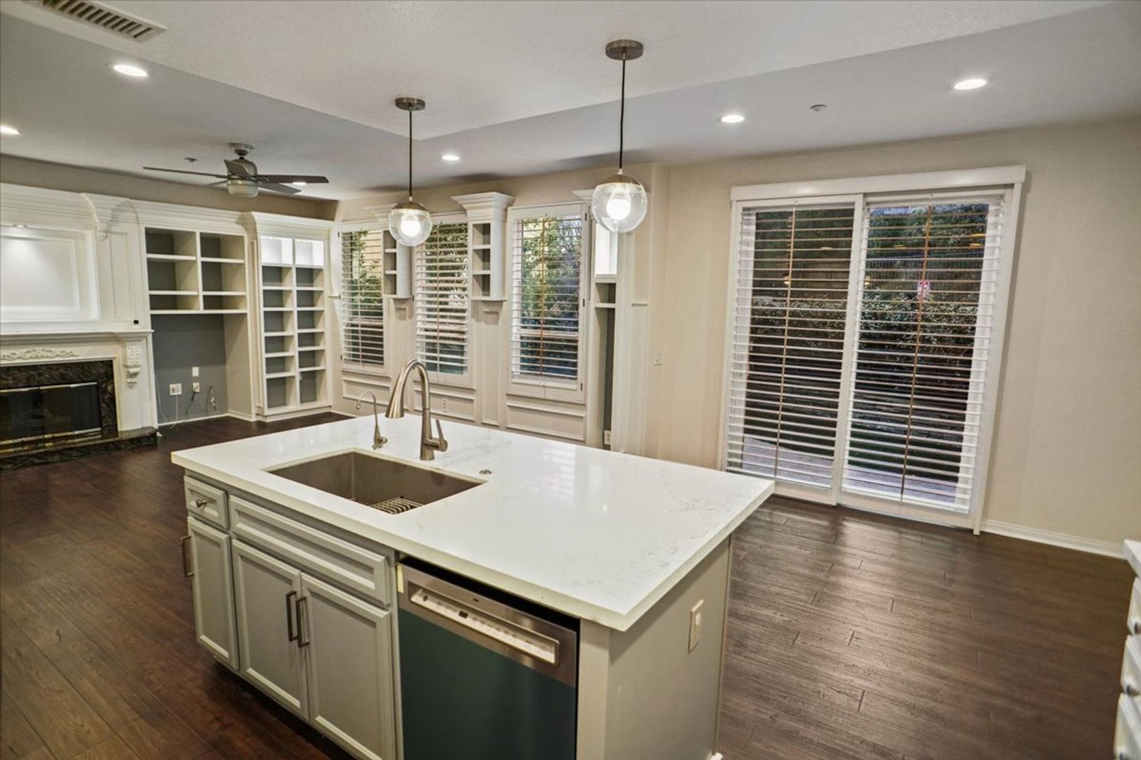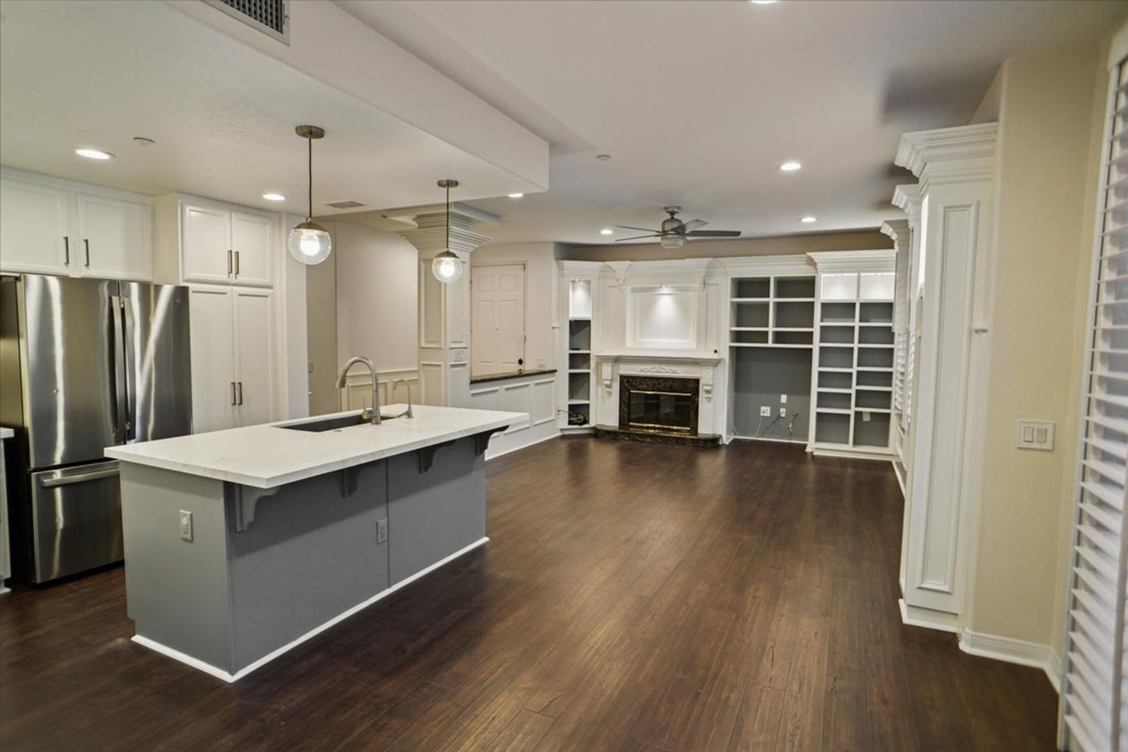 The updated kitchen showcases an island with upgraded countertops, custom cabinetry, subway tile backsplash, stylish light fixtures, and stainless steel appliances, including a stove, cooktop, dishwasher, microwave, and refrigerator. Wood flooring, recessed lighting, and a dedicated dining area flow seamlessly into the inviting living room, complete with custom woodwork, built-ins, a fireplace with custom mantel, ceiling fan, and abundant natural light.