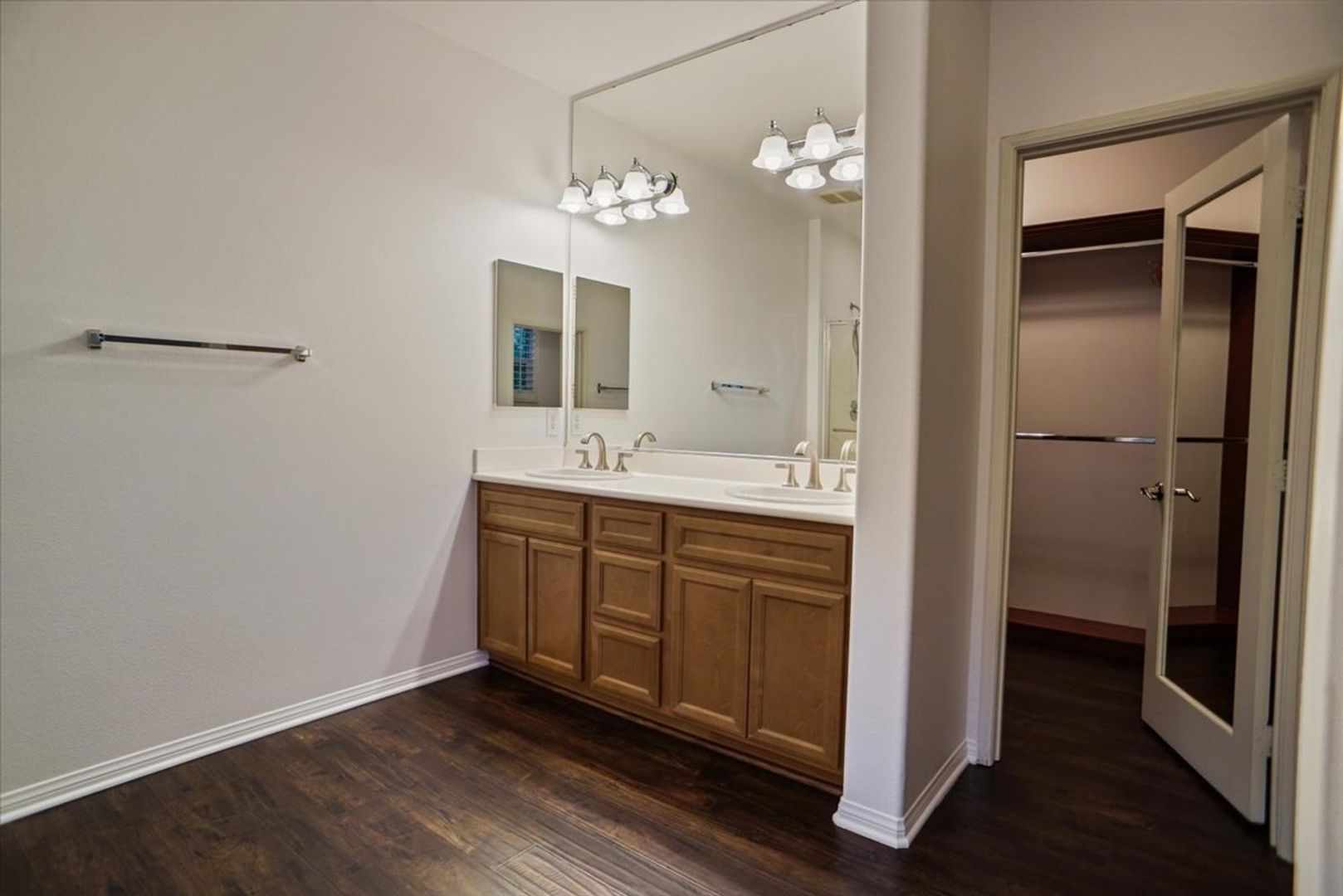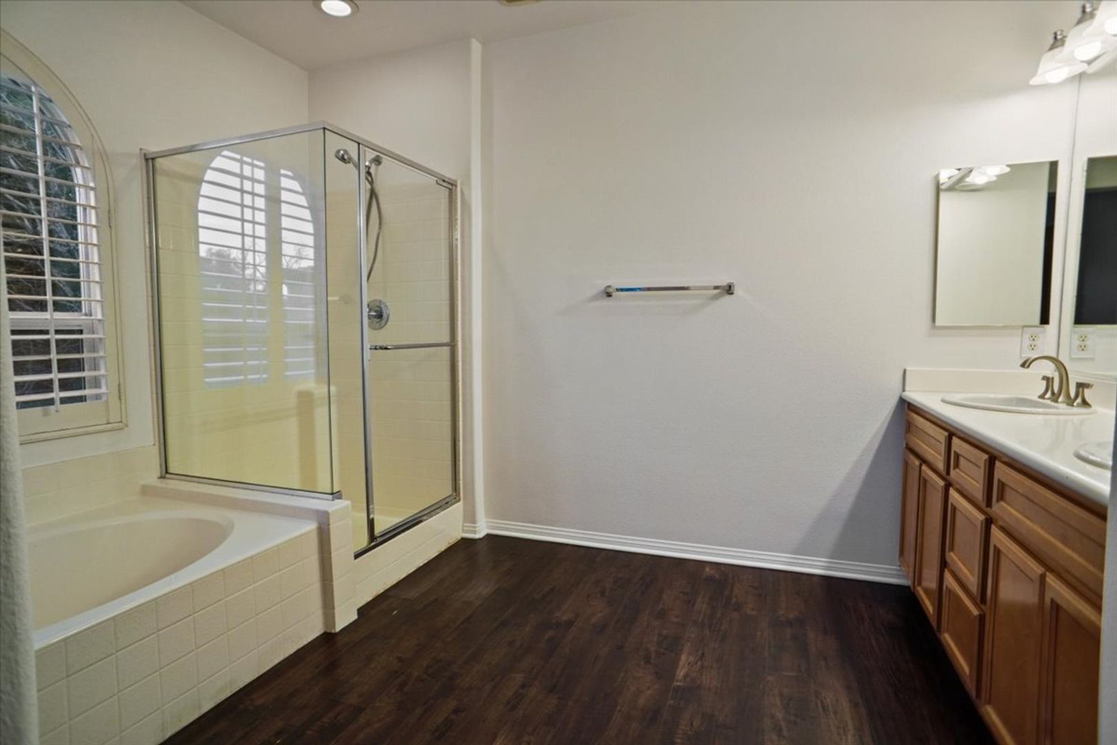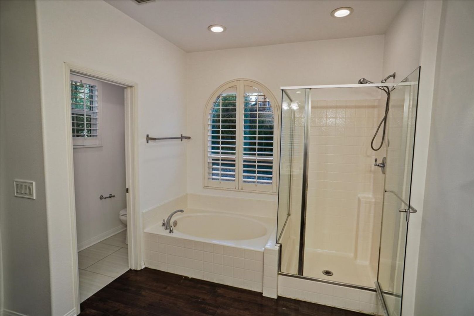 Upstairs, you’ll find two generously sized bedrooms with wood blinds and ceiling fans. The primary suite offers an ensuite bathroom with dual sinks, upgraded vanity, separate soaking tub and shower, and a walk-in closet with custom built-ins. A hallway bathroom with a shower/tub combination completes the upper level.