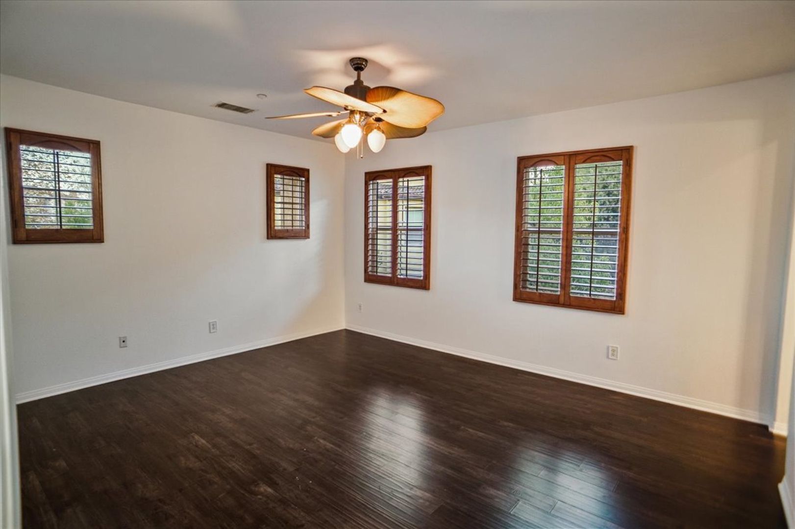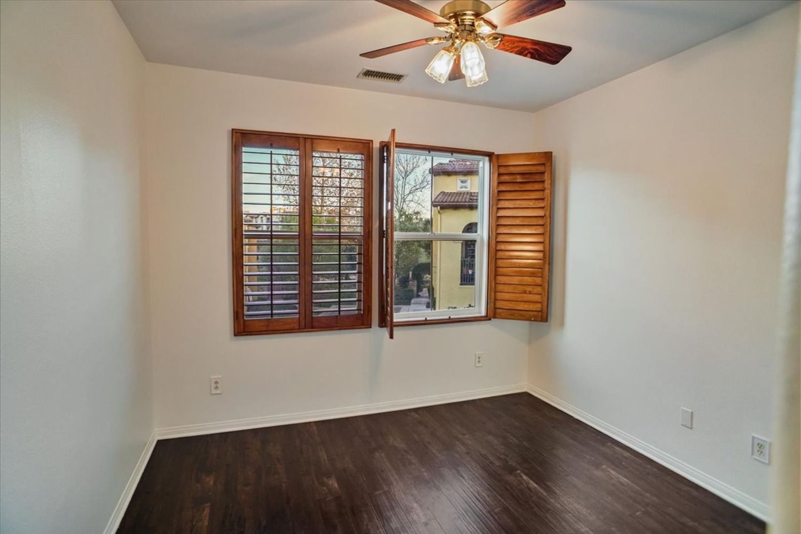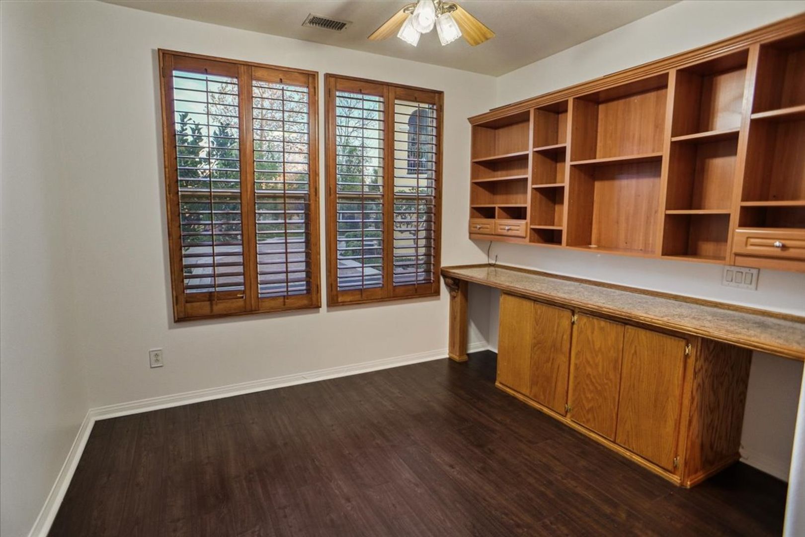 The downstairs bedroom includes a built-in desk and ceiling fan, adjacent to a full bathroom with a shower. Additional features on the main level include custom paint, wood shutters, a downstairs laundry room with washer and dryer, and a 2-car attached garage with cabinets and an EV charging station.