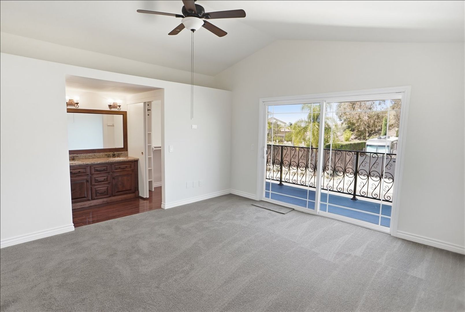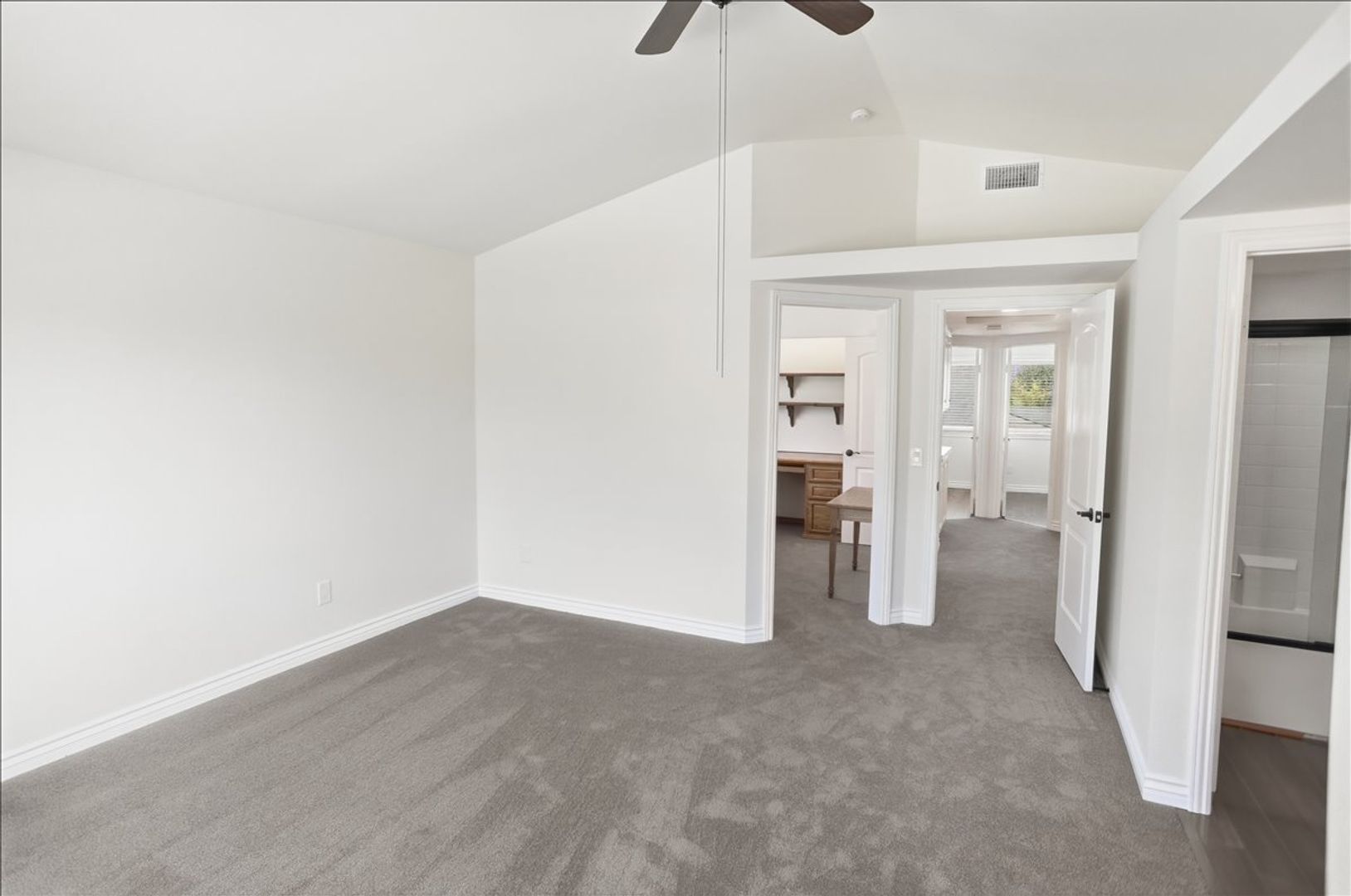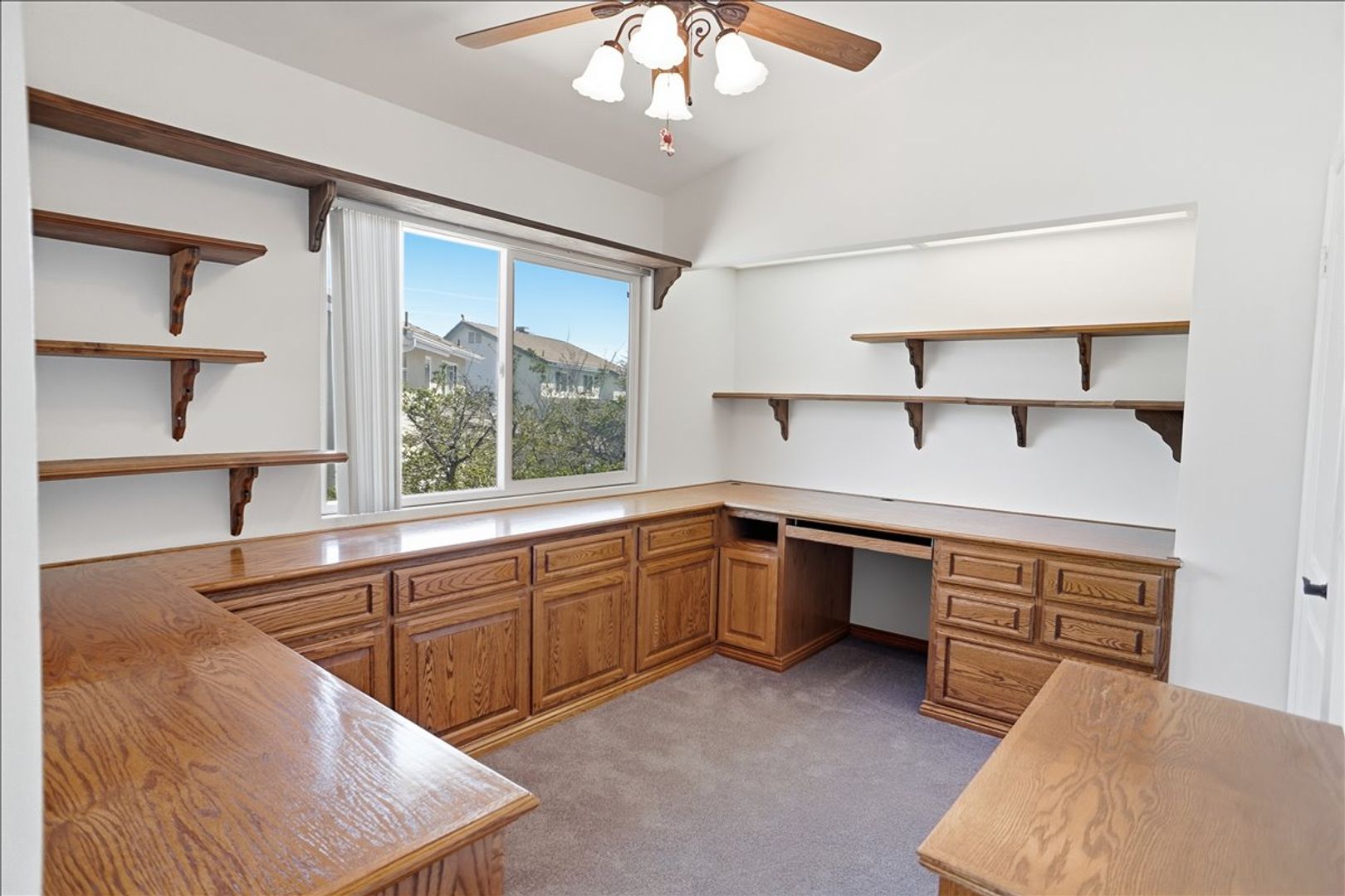 Upstairs, you’ll find four generously sized bedrooms. The fourth bedroom is currently used as an office, complete with a built-in desk and ceiling fan, and opens to the primary bedroom. The spacious primary suite includes high ceilings, new carpet, a ceiling fan, and a private balcony with great views. The en-suite bathroom features a custom wood vanity with dual sinks and a shower/tub combination.