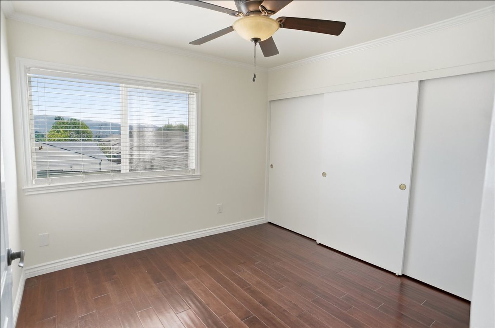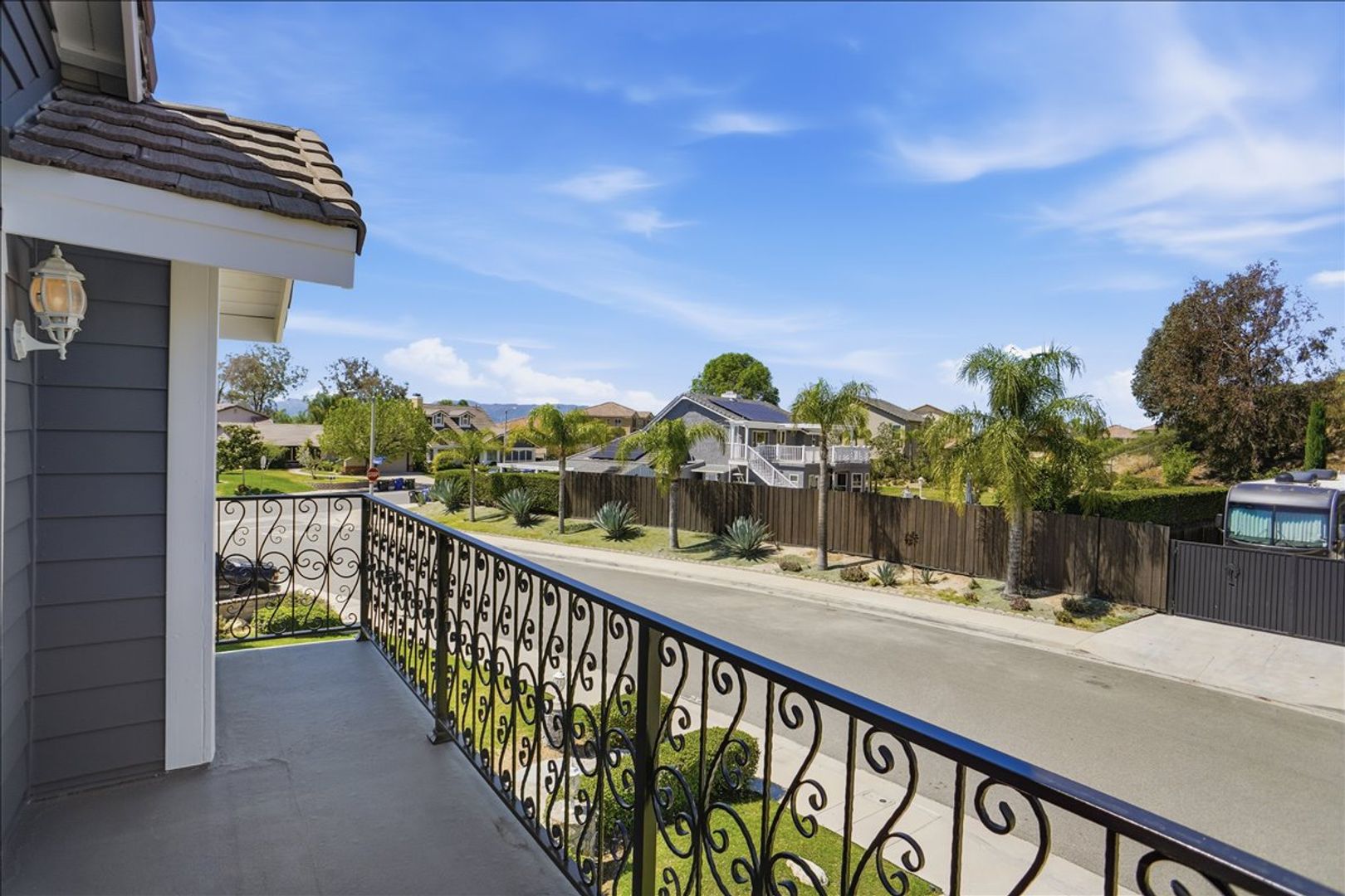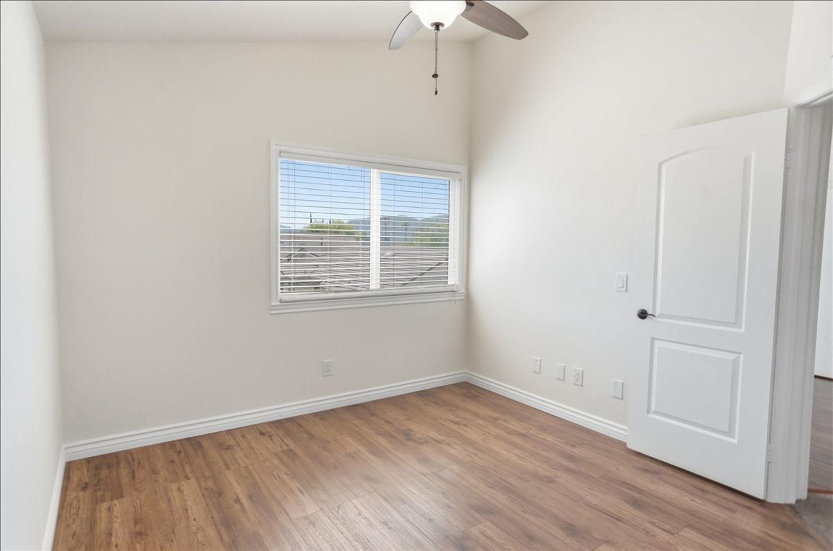 Upstairs, you’ll find four generously sized bedrooms. The fourth bedroom is currently used as an office, complete with a built-in desk and ceiling fan, and opens to the primary bedroom. The spacious primary suite includes high ceilings, new carpet, a ceiling fan, and a private balcony with great views. The en-suite bathroom features a custom wood vanity with dual sinks and a shower/tub combination.