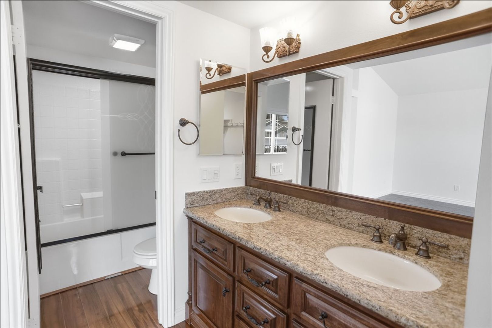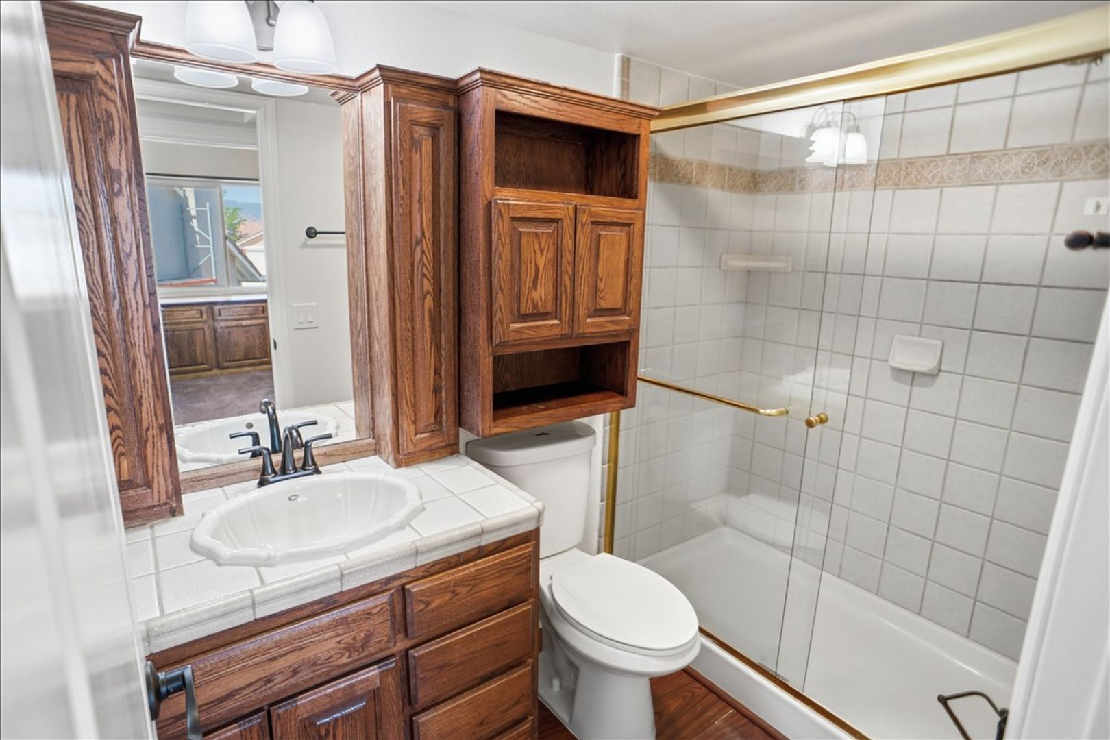 Additional highlights include a hallway bathroom with a wood vanity and a walk-in tiled shower with a glass door, as well as a convenient powder room downstairs. The home also offers a 2-car attached garage with ample built-in storage.