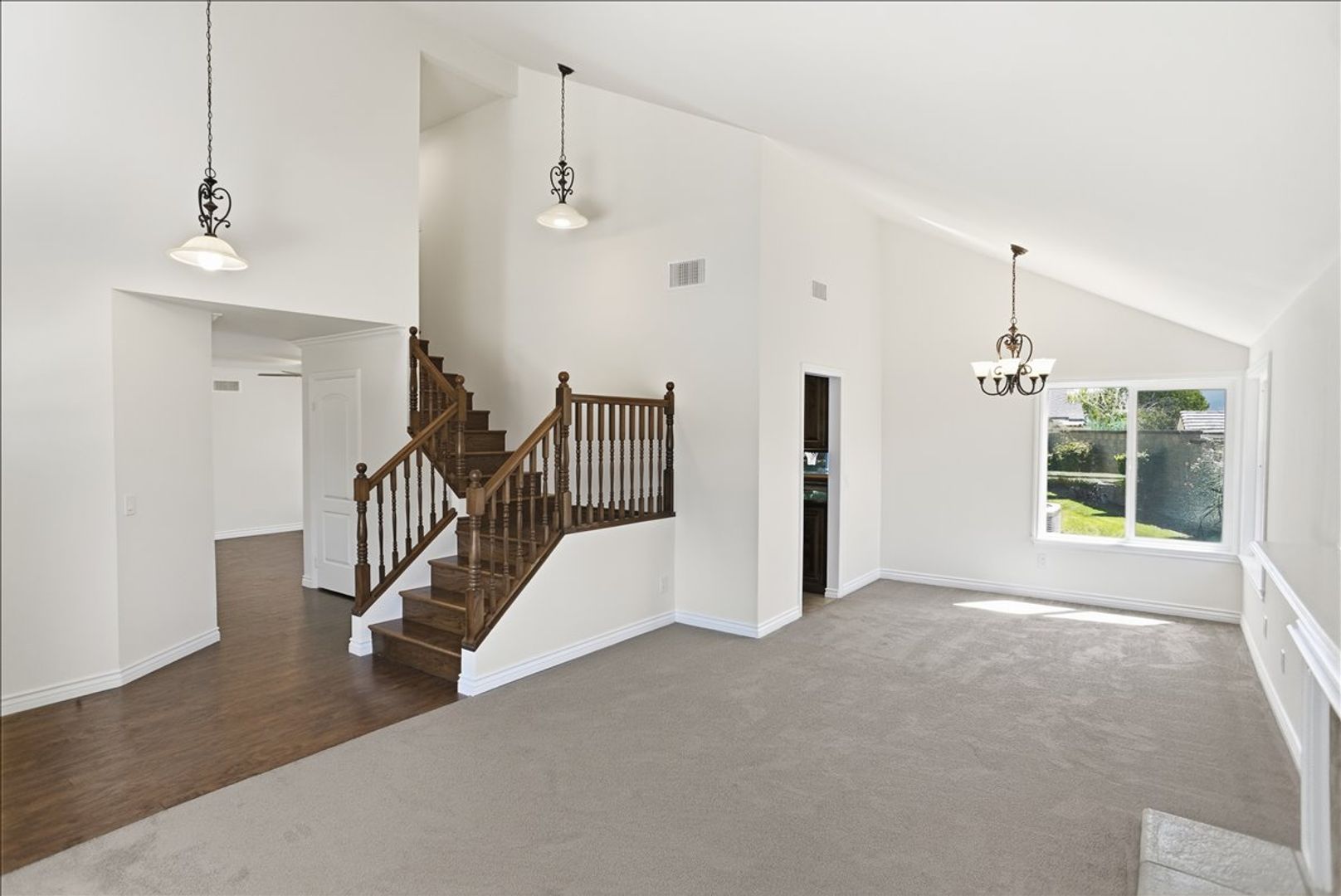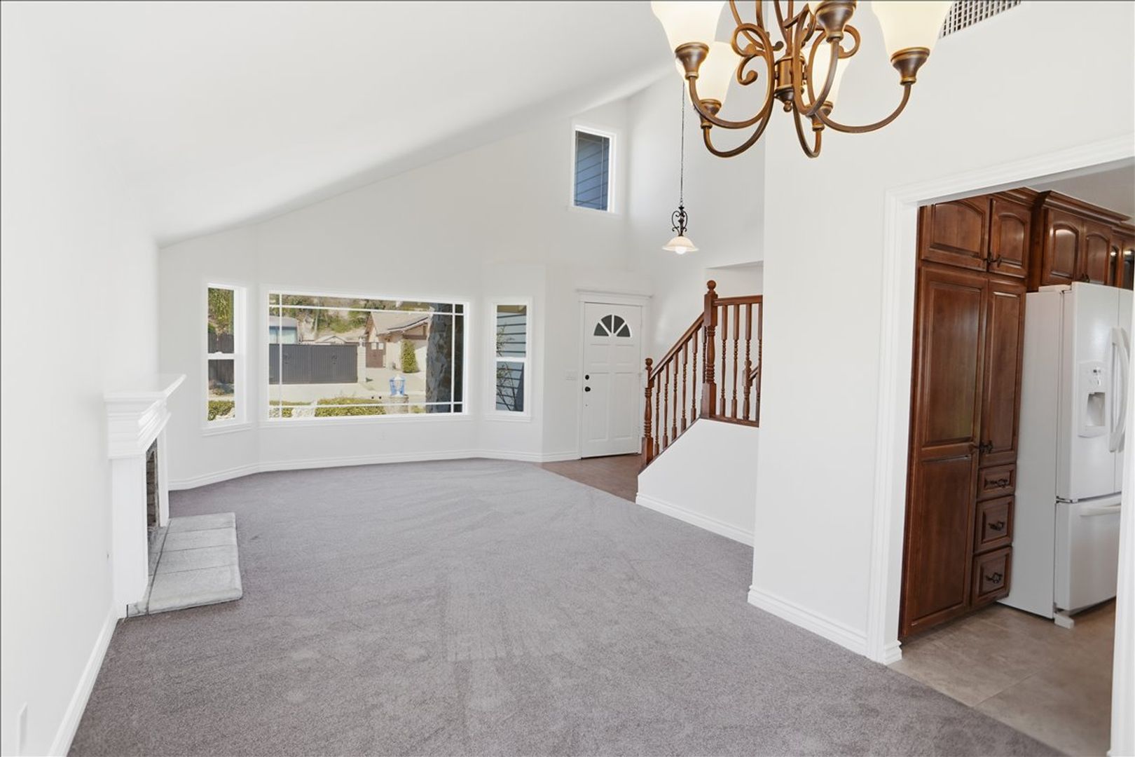 Step inside to an inviting entryway leading to a spacious family room with high ceilings, a charming bay front window that fills the space with natural light, and a brick fireplace with a mantel. The home features new carpet, fresh interior paint, and a designated dining area.