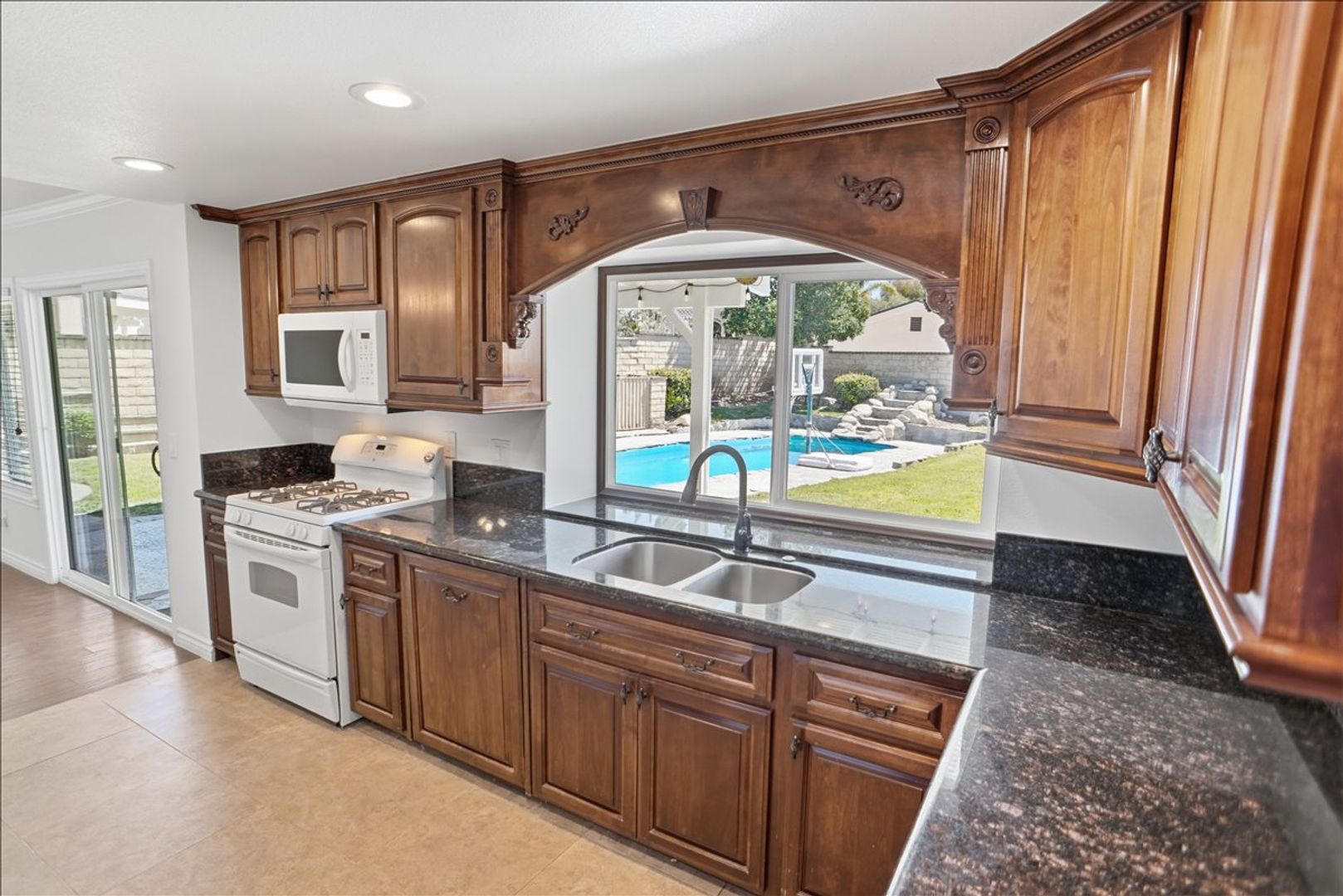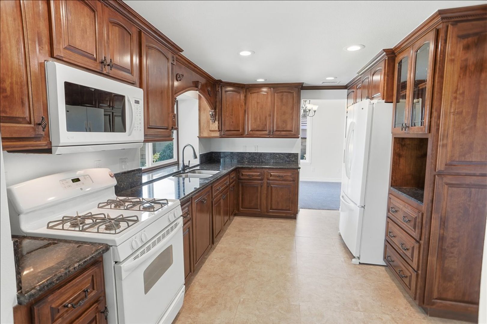 The custom kitchen boasts beautifully crafted wood cabinetry, granite countertops, recessed lighting, and a window overlooking the backyard. It comes fully equipped with an oven, microwave, dishwasher, and refrigerator. The adjacent living room features wood flooring and a ceiling fan, creating a warm and comfortable space.