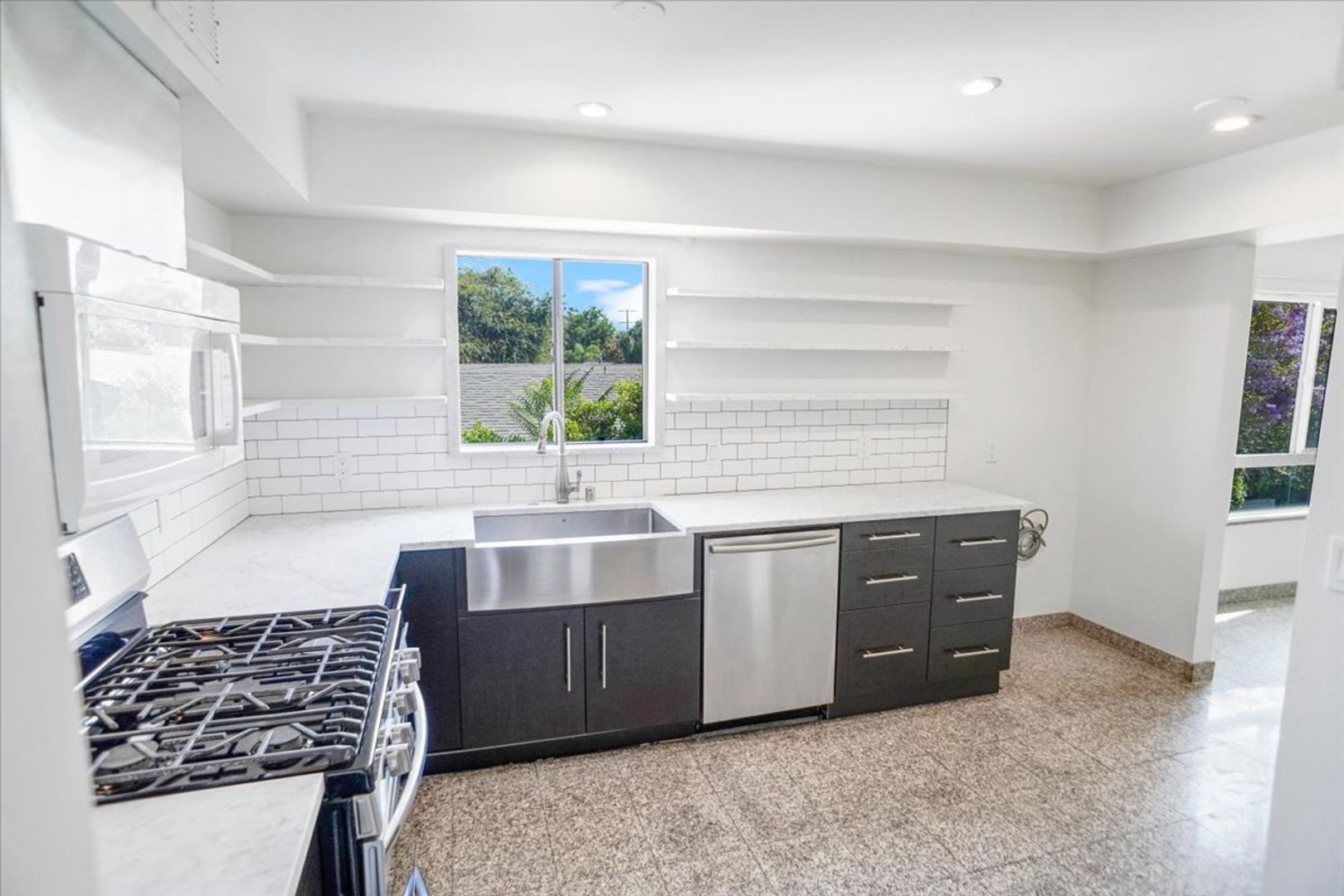 Welcome to this stunning and recently remodeled home featuring a spacious living room with elegant tile flooring, a beautifully tiled fireplace, and wood shutters that complement the abundant natural light throughout. The upgraded modern kitchen offers stainless steel appliances, a farmhouse sink, recessed lighting, and plenty of counter and cabinet space.
