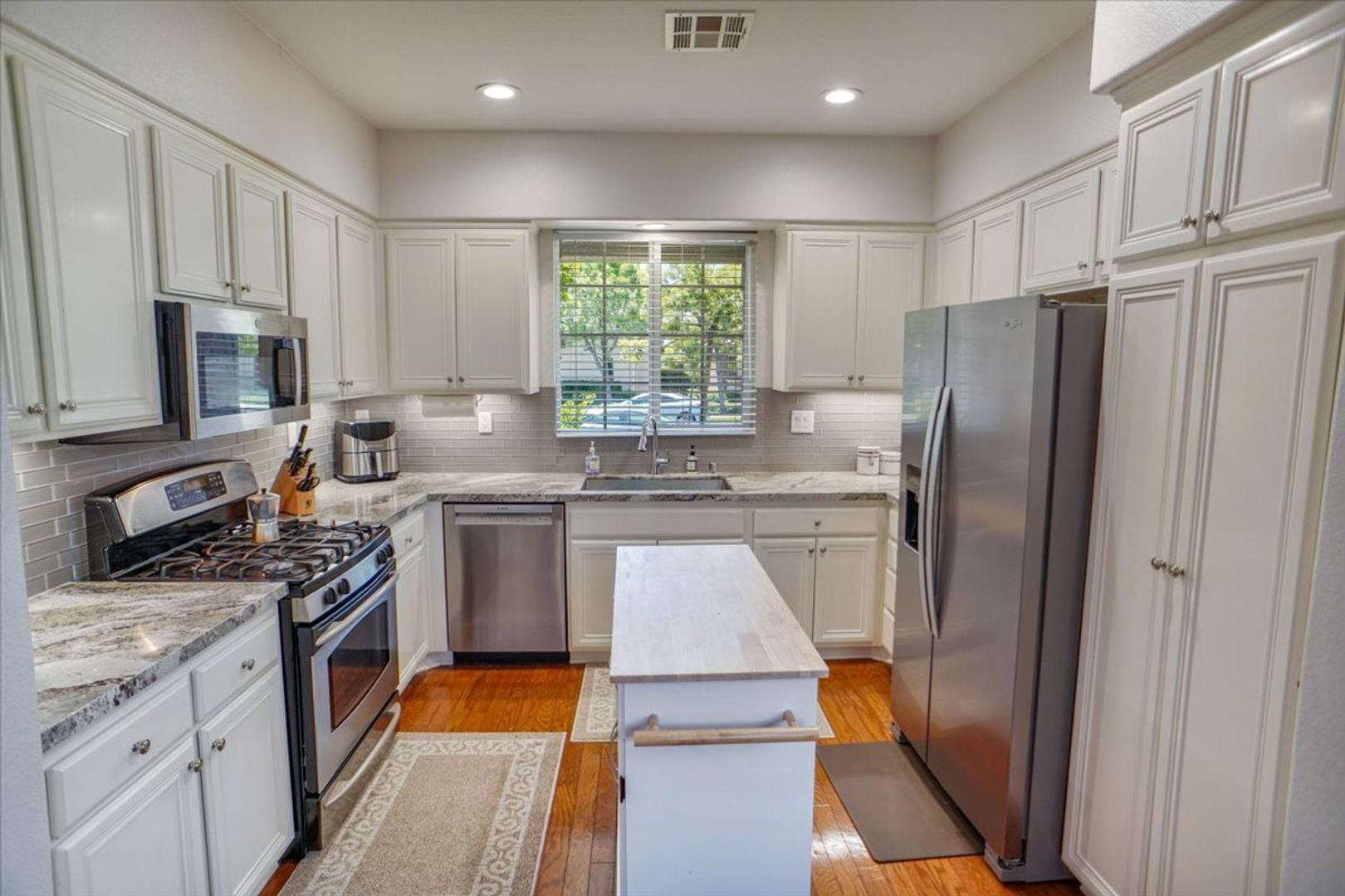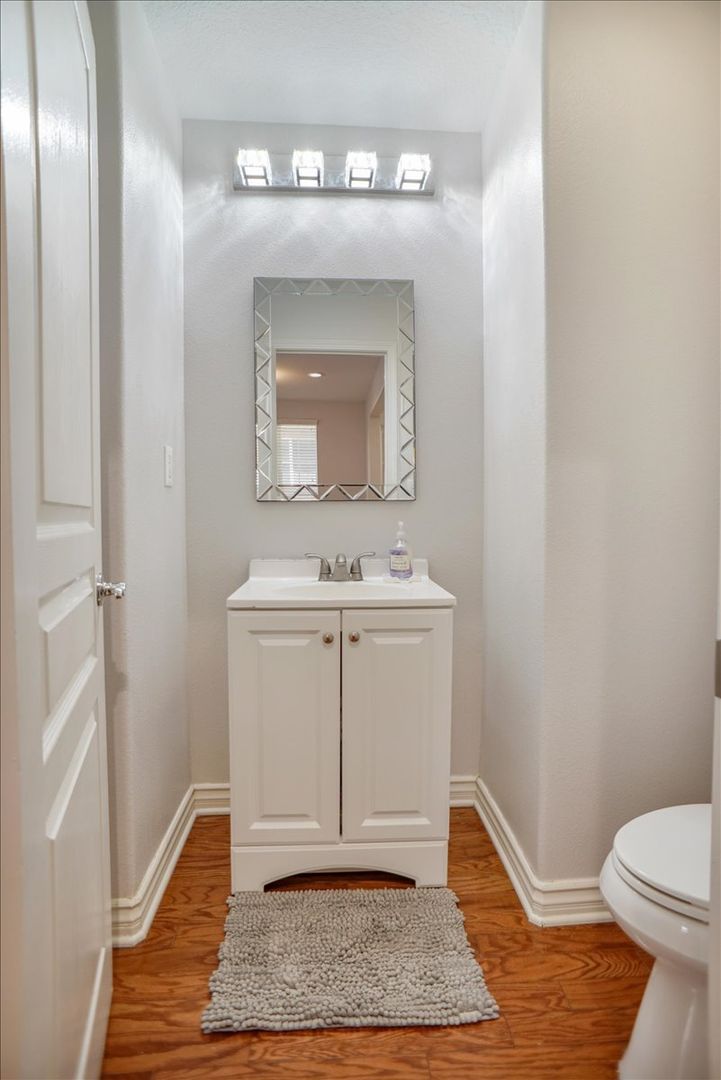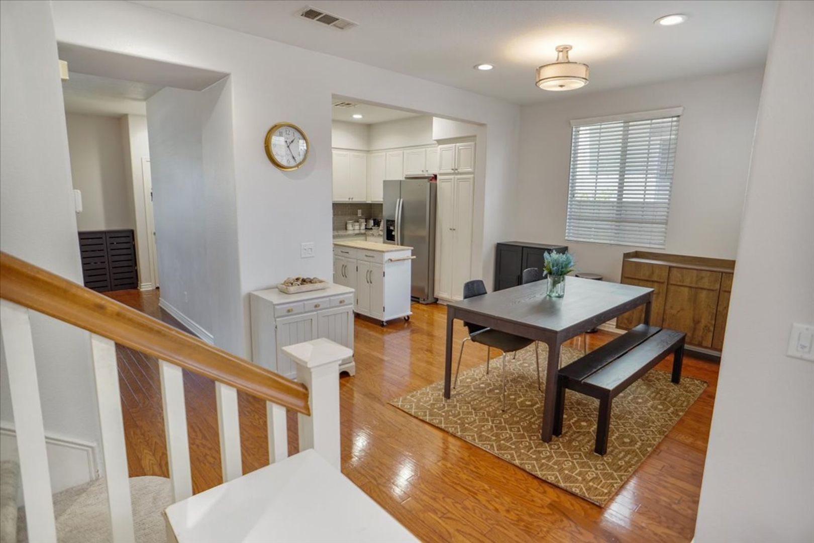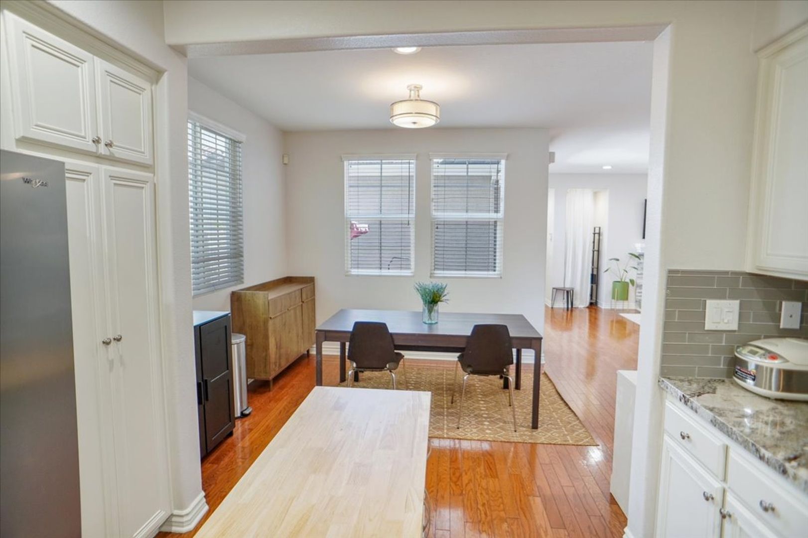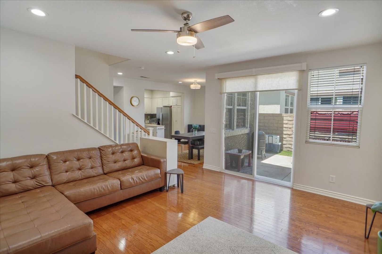 This beautifully maintained property offers 3 bedrooms and 3 bathrooms in the highly desirable Creekside community. The home features a spacious living room with wood flooring throughout (no carpet) and abundant natural light. The upgraded kitchen includes white cabinetry, recessed lighting, stainless steel appliances, a window over the sink, granite countertops, and a stylish subway tile backsplash. Adjacent to the kitchen is a dining area with an upgraded light fixture and a cozy family room featuring a ceiling fan, recessed lighting, and a tiled fireplace. A sliding glass door leads to the inviting backyard area, and an attached two-car garage provides convenient access.