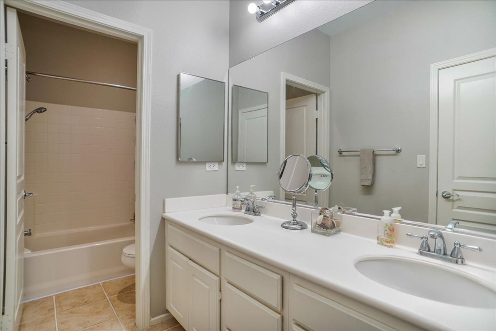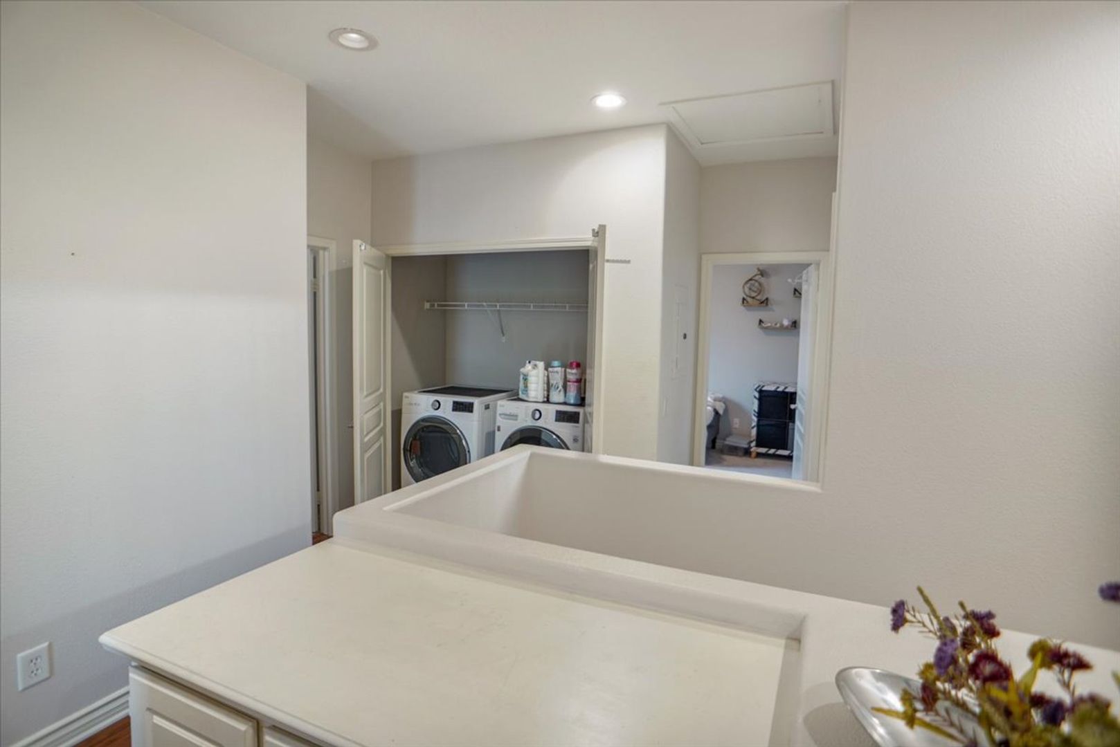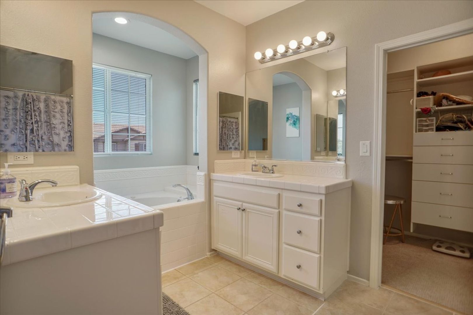 Downstairs, you'll also find a powder room with an upgraded vanity. Upstairs offers a dedicated laundry area, a linen closet, and a hallway bathroom with dual sinks and a shower/tub combination. All three bedrooms are generously sized and feature ceiling fans. The primary bedroom includes a private balcony with a lovely view, plus an en-suite bathroom complete with dual vanities, a separate tub and shower, and a walk-in closet.
