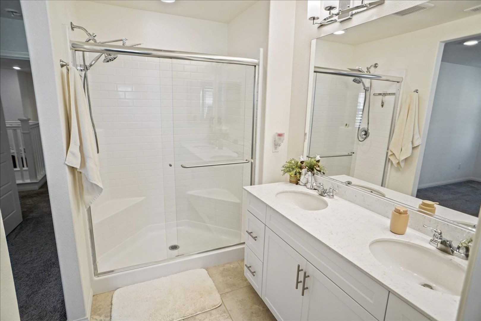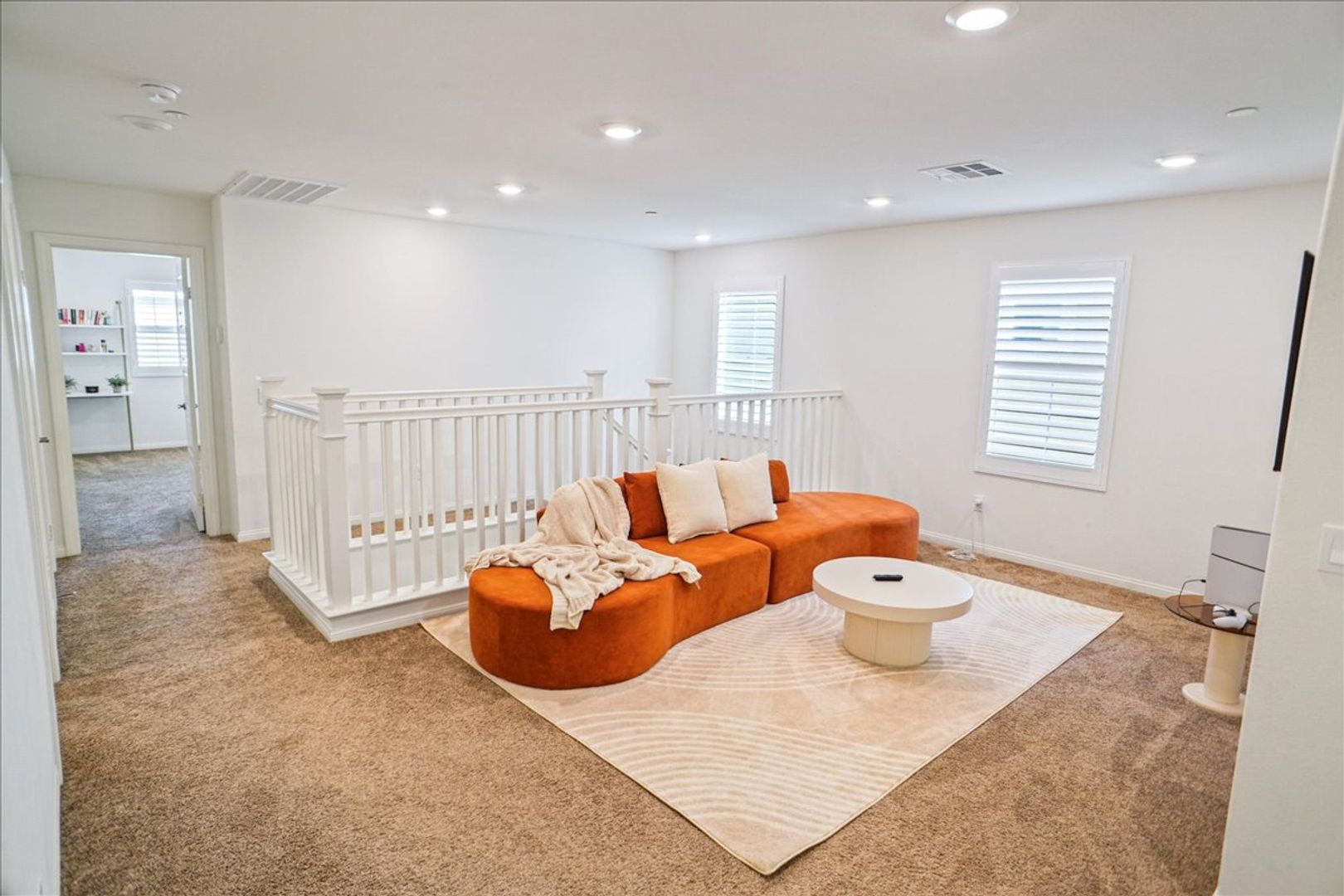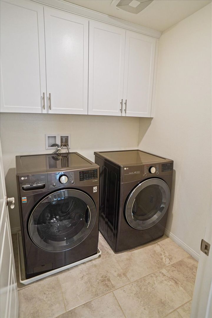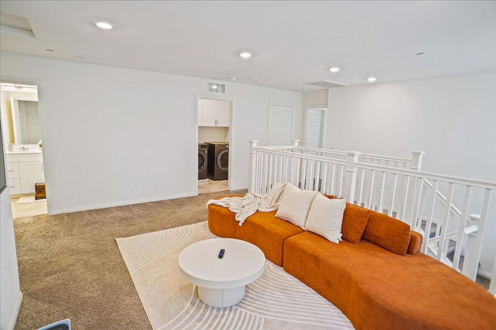 Upstairs, enjoy a large loft with recessed lighting — perfect for a home office, media room, or play area. The primary suite features an attached bathroom with upgraded dual-sink vanity, walk-in shower, and walk-in closet. Two additional generously sized bedrooms, a full bathroom, and a separate laundry room with cabinets provide comfort and functionality.