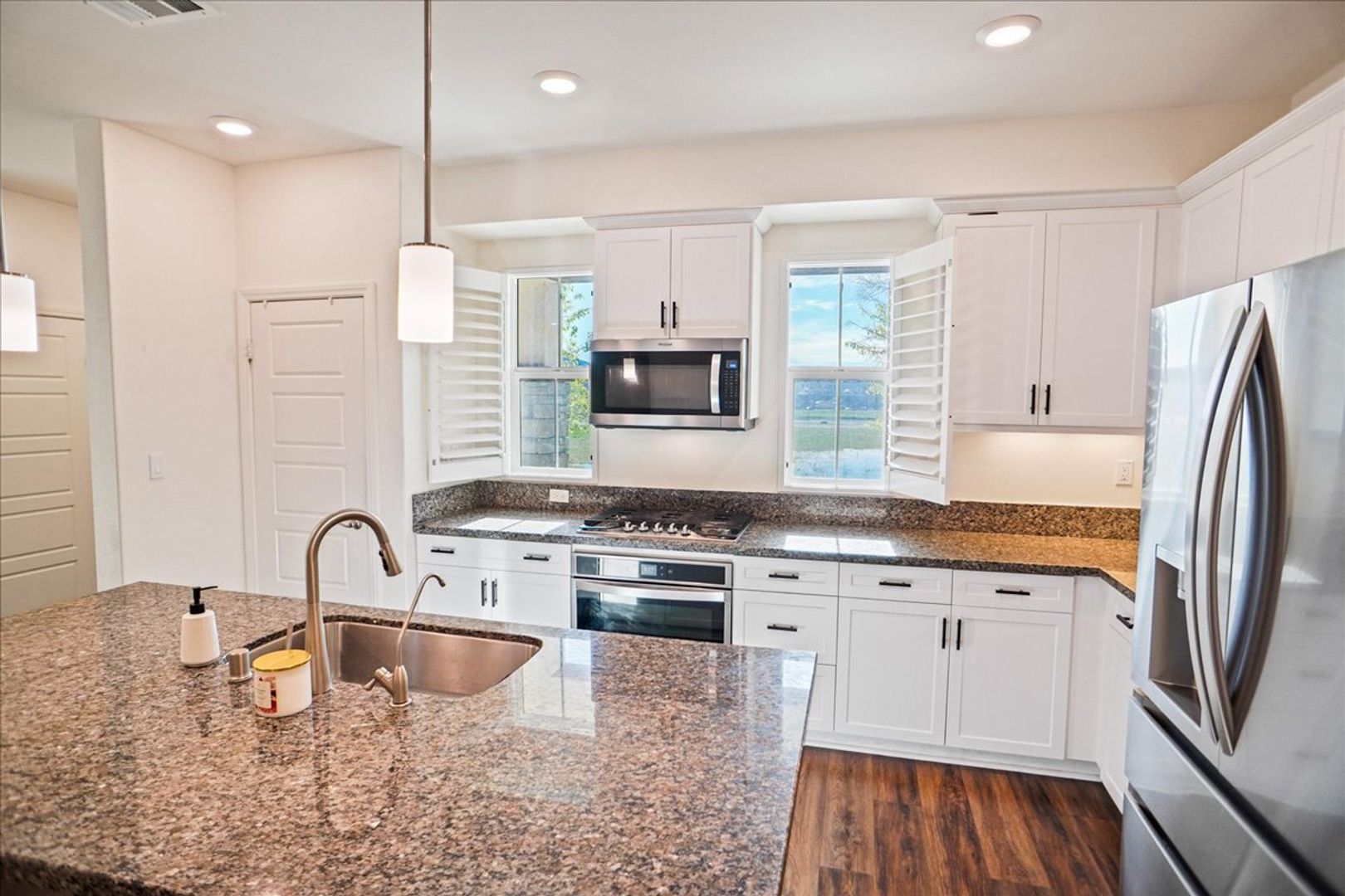 The spacious living and dining areas showcase stylish vinyl wood flooring, wood shutters, and an abundance of windows overlooking open space. A convenient downstairs powder room with pedestal sink completes the main level.