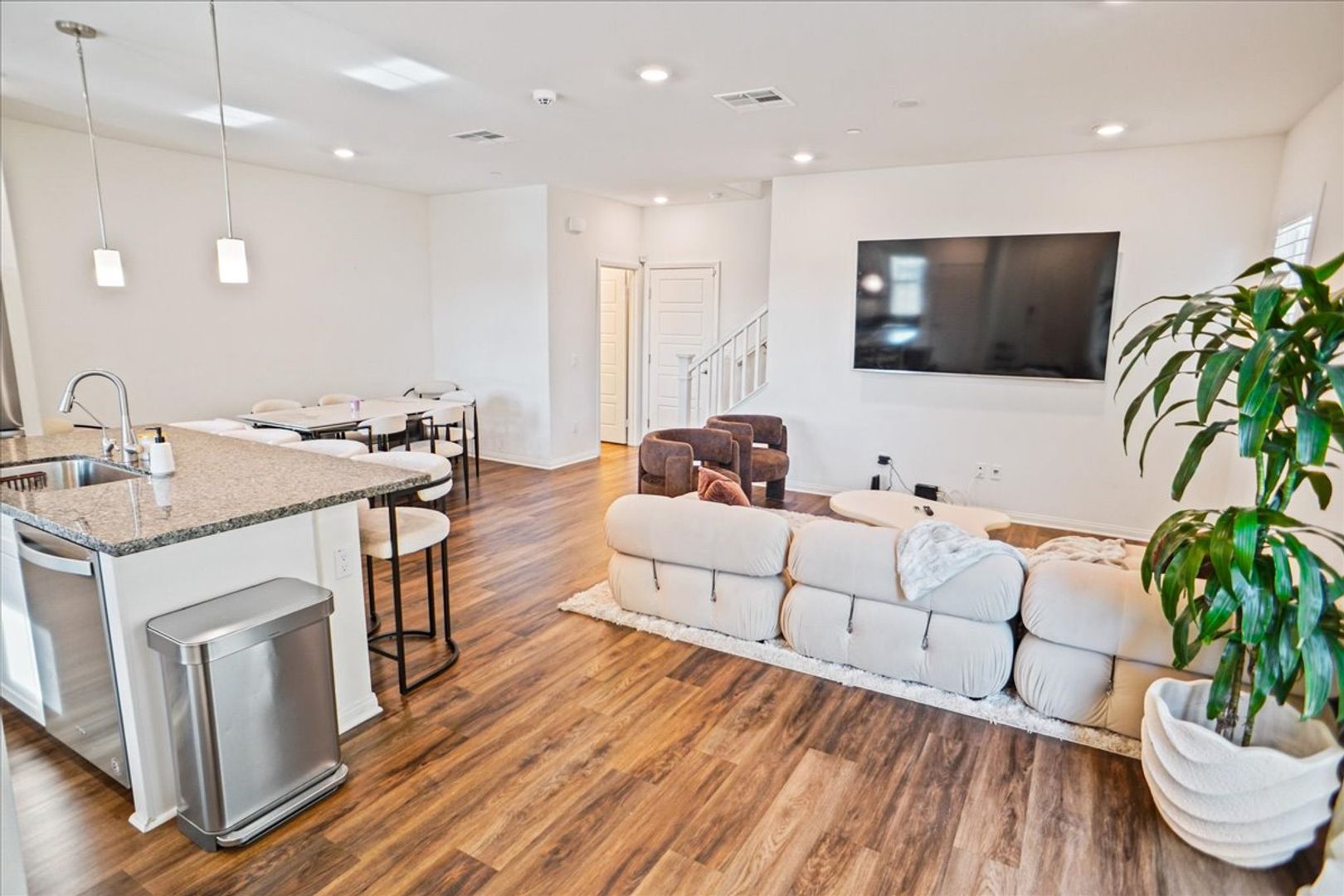This move-in-ready home offers wonderful curb appeal with a charming front porch and sitting area. Inside, you'll find a thoughtfully designed open-concept floor plan filled with natural light. The upgraded kitchen features custom white cabinetry, a pantry, stylish countertops, stainless steel appliances (dishwasher, microwave, oven, refrigerator), a deep sink with upgraded faucet, recessed lighting, upgraded fixtures, and a large center island with breakfast bar seating.