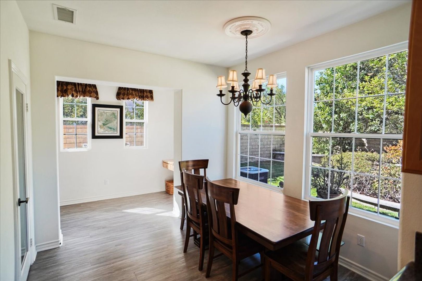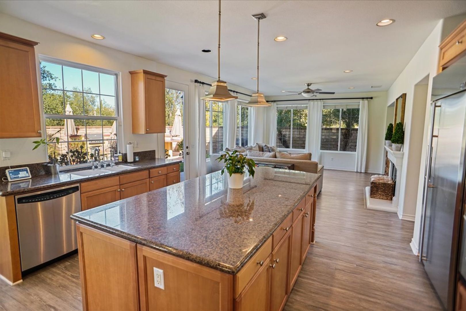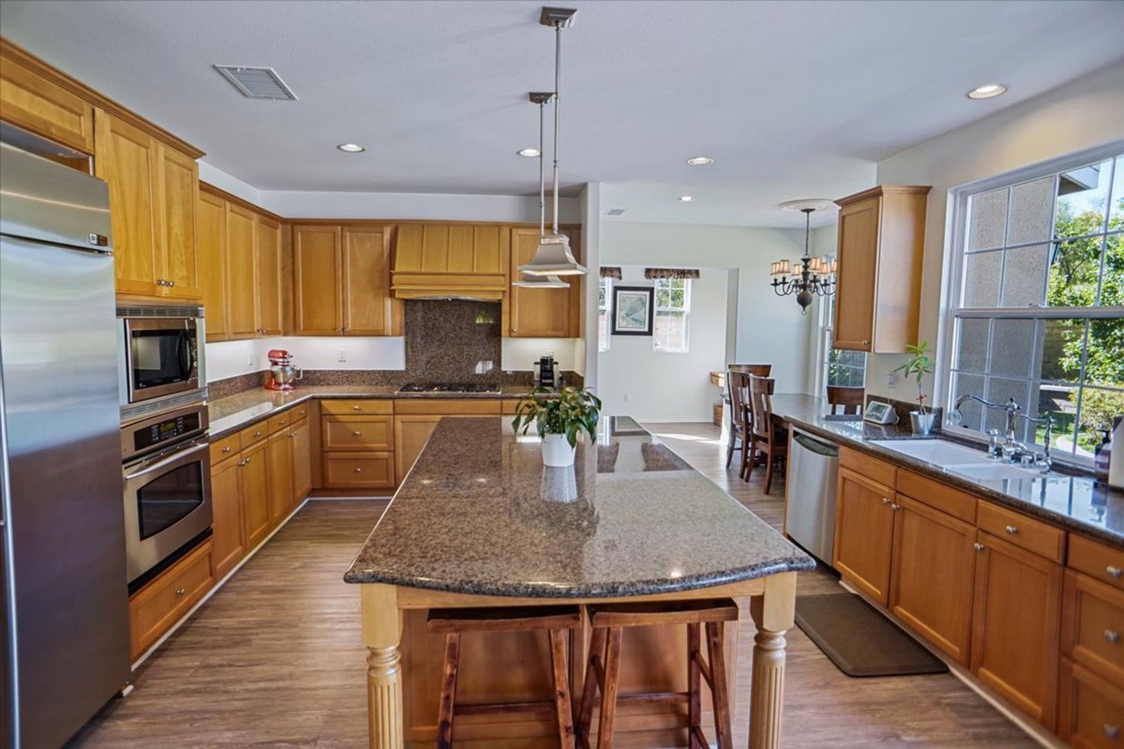 Step inside to an entertainer's dream kitchen, complete with a large island and breakfast bar, stainless steel appliances, custom cabinets, and elegant granite countertops. Recessed lighting and upgraded fixtures illuminate the space, while the kitchen sink overlooks the beautifully landscaped backyard. The adjacent dining area and built-in deck make for perfect gatherings.