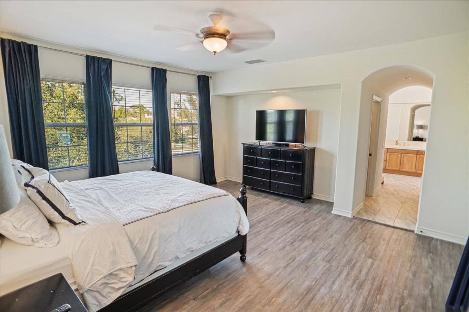 As you ascend the elegant wood staircase, you'll find a large loft area with recessed lighting and a ceiling fan, perfect for a playroom or home office. The upstairs also includes four generously sized bedrooms, highlighted by a luxurious master suite with ceiling fan, attached bathroom featuring his-and-her vanities, a separate tub and shower, and a spacious walk-in closet.